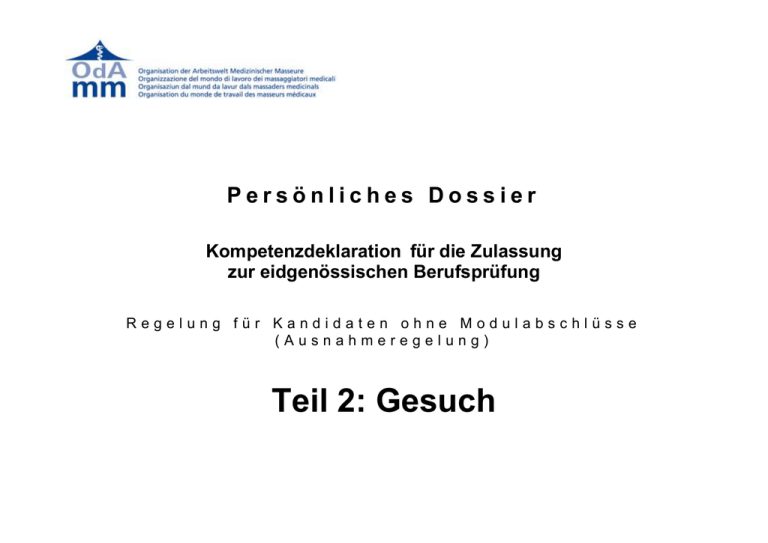 Persönliches Dossier Kompetenzdeklaration für die Zulassung zur eidgenössischen Berufsprüfung Regelung für Kandidaten ohne Modulabschlüsse (Ausnahmeregelung) Teil 2: Gesuch OdA MM Dossier Kompetenzprofil Teil 2: Gesuch Inhaltsverzeichnis 1. Persönliche Daten 2. Lebenslauf 3. Arbeitsprozess 1: Massnahmen und Interventionsprozesse 4. Arbeitsprozess 2: Kommunikationsprozesse 5. Arbeitsprozess 3: Ressourcen- und Prozessmanagement 6. Arbeitsprozess 4: Berufsentwicklung und Wissens-Management 7. Klinisches Praktikum: Nachweis der Einsätze im Gesundheitswesen 8. Verzeichnis der formellen Nachweise 9. Bestätigung Sursee, April 2014 Document1 2 OdA MM Dossier Kompetenzprofil Teil 2: Gesuch ARBEITSBLATT 1 1. Persönliche Daten – BITTE AUSFÜLLEN Name / Vorname Adresse PLZ / Ort Telefon Privat Telefon Geschäft Telefax E-Mail-Adresse Geburtsdatum Heimatort Nationalität Zivilstand Beruf Sursee, April 2014 Document1 3 OdA MM Dossier Kompetenzprofil Teil 2: Gesuch ARBEITSBLATT 2 2. Lebenslauf – BITTE AUSFÜLLEN Personalien Schulen / Abschluss Berufliche Tätigkeiten, bzw. Berufspraxis (vgl. Arbeitsblatt 4) Tätigkeiten im Gesundheitswesen Weiterbildungen Ausserberufliche Tätigkeiten Freizeit Sursee, April 2014 Document1 4 OdA MM Dossier Kompetenzprofil Teil 2: Gesuch ARBEITSBLATT 3 3. Arbeitsprozess 1: Massnahmen und Interventionsprozesse – BITTE AUSFÜLLEN 3.1. Kompetenz 1.1: Erhebung, Interpretation und Dokumentation der Daten Situation: Die Medizinische Masseurin /der Medizinische Masseur erhebt die im Hinblick auf seine Berufsausübung relevanten Patientendaten aufgrund einer berufsspezifischen, den Rahmenbedingungen angepassten Befunderhebung (Anamnese / Inspektion / Palpation / Untersuchungstechniken / Messungen / Tests). Er interpretiert diese und erstellt eine Ausgangsbilanz unter Berücksichtigung der gesamten Patientenpersönlichkeit und ihres Umfeldes. Er gewährleistet und überwacht innerhalb seines Kompetenzbereiches die Dokumentation aller relevanten Daten. Informieren, Planen, Realisieren, Evaluieren Rubrik a Über welche Fähigkeiten und Kompetenzen verfügen Sie in Bezug zu der aufgeführten Situation? - Wozu sind Sie fähig? - Was können Sie? Rubrik b Wo und wann haben Sie die aktuellen Fähigkeiten in Bezug zu der aufgeführten Situation erworben? - Bei welcher Aufgabe/Tätigkeit? - Welche Kurse haben Sie besucht? - Mit welchen Belegen können Sie dies bestätigen? Stellt alle wichtigen Daten zur Vorgeschichte / Krankengeschichte zusammen, holt aktiv Informationen in schriftlicher / mündlicher Form ein Prüft die Daten auf ihre Aussagekraft und Relevanz, um dadurch die Befunderhebung zu planen im Sinne der Selektion und Schwerpunktsetzung Führt eine den Rahmenbedingungen angepasste berufsspezifische Anamnese durch Erhebt selektiv relevante berufsspezifische objektive Befunde am Patienten Dokumentiert den Befund entsprechend den gegebenen Rahmenbedingungen Analysiert aufgrund der erarbeiteten Informationen Sursee, April 2014 Document1 5 OdA MM Dossier Kompetenzprofil Teil 2: Gesuch und Daten die Ausgangslage der Patientensituation Leitet daraus die möglichen Indikationen, Vorsichtsmassnahmen sowie Kontraindikationen ab Überprüft die Unterlagen auf Vollständigkeit, fragt nach und ergänzt Sursee, April 2014 Document1 6 OdA MM Dossier Kompetenzprofil Teil 2: Gesuch 3.2. Kompetenz 1.2: Erstellung des Massnahmenkonzepts Situation: Der Medizinische Masseur formuliert die Behandlungsziele, legt den Behandlungsplan fest und wählt die adäquaten Mittel. Er definiert die Verlaufszeichen, bespricht das Vorgehen und erarbeitet den Behandlungsauftrag mit dem Klienten/Patienten und/oder der zuweisenden Stelle. Informieren, Planen, Realisieren, Evaluieren Rubrik a Rubrik b - Über welche Fähigkeiten und Kompetenzen verfügen Sie in Bezug zu der aufgeführten Situation? - - Wozu sind Sie fähig? - Was können Sie? - Bei welcher Aufgabe/Tätigkeit? - Welche Kurse haben Sie besucht? - Mit welchen Belegen können Sie dies bestätigen? Wo und wann haben Sie die aktuellen Fähigkeiten in Bezug zu der aufgeführten Situation erworben? Steckt das Massnahmenspektrum ab und überlegt sich Konsequenzen für den Patienten einschliesslich der Kontraindikationen und allfälliger Alternativen Erstellt einen individuellen Behandlungsplan und legt die notwendigen Methoden und Mittel fest Informiert den Patienten über die Behandlungsmöglichkeiten, den möglichen Verlauf: Legt gemeinsam mit dem Patienten das individuelle Behandlungsziel und den Behandlungsauftrag fest; definiert die subjektiven und objektiven Verlaufszeichen modifiziert allenfalls den Behandlungsplan; dokumentiert diese Schritte und das vereinbarte Vorgehen Prüft die Patientenverständlichkeit und die therapeutische Kohärenz des Behandlungsplans mit den Behandlungszielen und zieht Schlussfolgerungen für die nächsten Schritte Sursee, April 2014 Document1 7 OdA MM Dossier Kompetenzprofil Teil 2: Gesuch 3.3. Kompetenz 1.3: Durchführung der Massnahmen Situation: Der Medizinische Masseur bereitet aufgrund der Resultate der Befunderhebung und der vor-gegebenen Rahmenbedingungen (Mandatsauftrag / Verordnung / Infrastruktur / Zeitmanagement / Behandlungsplan) die Massnahmen vor, führt sie durch und evaluiert deren Wirkung kontinuierlich durch die Kontrolle aufgrund der gesetzten Behandlungsziele und Verlaufszeichen. Er informiert den Klienten/Patienten und/oder die zuweisende Stelle über den Behandlungserfolg. Er informiert entsprechend den Rahmenbedingungen den Patienten über die Bedeutung seines Verhaltens und Erlebens. Er empfiehlt weitere Massnahmen zur Verbesserung seines Zustandes. Er dokumentiert die Behandlung sowie das Ergebnis der Verlaufszeichenkontrolle zur Qualitätssicherung. Informieren, Planen, Realisieren, Evaluieren Rubrik a - Über welche Fähigkeiten und Kompetenzen verfügen Sie in Bezug zu der aufgeführten Situation? - Wozu sind Sie fähig? - Was können Sie? Rubrik b - Wo und wann haben Sie die ak