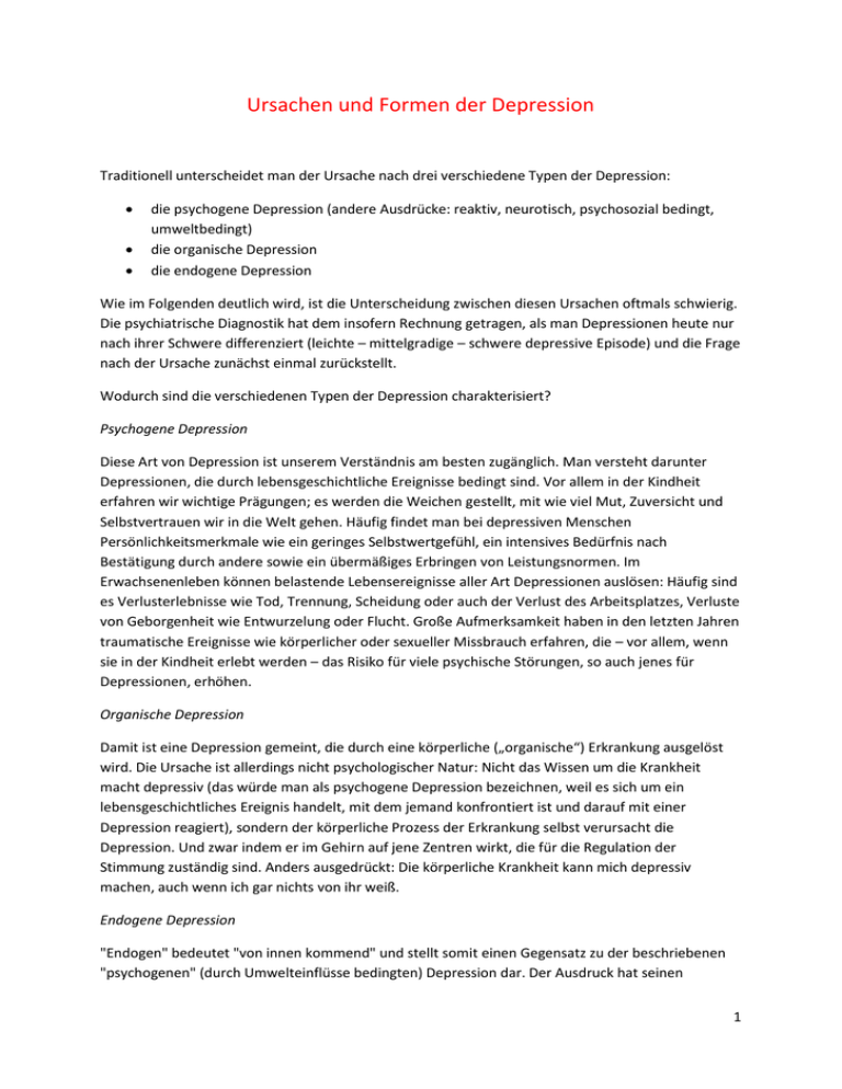 Ursachen und Formen der Depression Traditionell unterscheidet man der Ursache nach drei verschiedene Typen der Depression: die psychogene Depression (andere Ausdrücke: reaktiv, neurotisch, psychosozial bedingt, umweltbedingt) die organische Depression die endogene Depression Wie im Folgenden deutlich wird, ist die Unterscheidung zwischen diesen Ursachen oftmals schwierig. Die psychiatrische Diagnostik hat dem insofern Rechnung getragen, als man Depressionen heute nur nach ihrer Schwere differenziert (leichte – mittelgradige – schwere depressive Episode) und die Frage nach der Ursache zunächst einmal zurückstellt. Wodurch sind die verschiedenen Typen der Depression charakterisiert? Psychogene Depression Diese Art von Depression ist unserem Verständnis am besten zugänglich. Man versteht darunter Depressionen, die durch lebensgeschichtliche Ereignisse bedingt sind. Vor allem in der Kindheit erfahren wir wichtige Prägungen; es werden die Weichen gestellt, mit wie viel Mut, Zuversicht und Selbstvertrauen wir in die Welt gehen. Häufig findet man bei depressiven Menschen Persönlichkeitsmerkmale wie ein geringes Selbstwertgefühl, ein intensives Bedürfnis nach Bestätigung durch andere sowie ein übermäßiges Erbringen von Leistungsnormen. Im Erwachsenenleben können belastende Lebensereignisse aller Art Depressionen auslösen: Häufig sind es Verlusterlebnisse wie Tod, Trennung, Scheidung oder auch der Verlust des Arbeitsplatzes, Verluste von Geborgenheit wie Entwurzelung oder Flucht. Große Aufmerksamkeit haben in den letzten Jahren traumatische Ereignisse wie körperlicher oder sexueller Missbrauch erfahren, die – vor allem, wenn sie in der Kindheit erlebt werden – das Risiko für viele psychische Störungen, so auch jenes für Depressionen, erhöhen. Organische Depression Damit ist eine Depression gemeint, die durch eine körperliche („organische“) Erkrankung ausgelöst wird. Die Ursache ist allerdings nicht psychologischer Natur: Nicht das Wissen um die Krankheit macht depressiv (das würde man als psychogene Depression bezeichnen, weil es sich um ein lebensgeschichtliches Ereignis handelt, mit dem jemand konfrontiert ist und darauf mit einer Depression reagiert), sondern der körperliche Prozess der Erkrankung selbst verursacht die Depression. Und zwar indem er im Gehirn auf jene Zentren wirkt, die für die Regulation der Stimmung zuständig sind. Anders ausgedrückt: Die körperliche Krankheit kann mich depressiv machen, auch wenn ich gar nichts von ihr weiß. Endogene Depression "Endogen" bedeutet "von innen kommend" und stellt somit einen Gegensatz zu der beschriebenen "psychogenen" (durch Umwelteinflüsse bedingten) Depression dar. Der Ausdruck hat seinen 1 Ursprung in der Beobachtung, dass es Menschen gibt, bei denen keinerlei lebensgeschichtliche Ursachen für eine Depression auszumachen sind. Es finden sich also keine maßgeblichen Konflikte, Verlusterlebnisse oder Traumata und dennoch haben diese Menschen eine (oft schwere) Depression. Aussagen wie: "Ich verstehe das nicht, in meinem Leben ist doch alles in Ordnung. Ich könnte der glücklichste Mensch sein und trotzdem geht’s mir so schlecht", können diese Situation veranschaulichen. Aufgrund des Fehlens äußerer Gründe wurde früher vermutet, dass es sich eben um "innere" Ursachen handelt, um Veränderungen jener Zentren im Gehirn, die für die Regulation der Stimmung zuständig sind. Genetische Faktoren spielen dabei eine wichtige Rolle, wie sich auch an der Tendenz zu einer familiären Häufung depressiver Erkrankungen zeigt. Die Begriffe "psychogen" und "endogen" beschreiben lediglich, wo der Prozess vermutlich seinen Anfang genommen hat. Das Verhältnis zwischen psychogener und endogener Depression lässt sich anhand des Beispiels eines Autos mit einer Panne verdeutlichen: Die Ursachen für die Panne können durch die Umwelt bedingt sein. So kann das Auto etwa liegen bleiben, weil der schlechte Zustand der Straße einen Defekt verursacht oder ein anderer Verkehrsteilnehmer das Auto beschädigt hat. Die Ursachen können aber ebenso im Inneren des Autos liegen, ohne dass irgendein Zusammenhang mit der Umwelt besteht: Der Motor streikt, die Elektronik fällt aus o.Ä. Nun ließe sich einwenden, dass bei diesem Beispiel die Unterscheidung zwischen äußeren und inneren Ursachen nicht ganz so einfach ist wie geschildert, weil sich diese ja gegenseitig bedingen können: Der Motor wird eher kaputt, wenn die äußeren Umstände ungünstig sind, und ein Unfall wird eher passieren, wenn das Fahrzeug technisch nicht in Ordnung ist. Vor dem gleichen bzw. einem noch viel komplizierteren Problem stehen Mediziner, wenn sie versuchen, die Gründe für die Depression beim Menschen auseinanderzuhalten. Die beiden Bereiche – psychogene Faktoren und endogene Faktoren – beeinflussen und verändern sich nämlich gegenseitig: Wiederholte belastende Ereignisse (auch geringer Intensität) können zu einer immer stärkeren (depressiven) Reaktion führen, bis schließlich eine schwere depressive Episode auftritt. Später kann dann die Depression auch ohne einen klaren äußeren Anlass auftreten. Dieses Modell könnte den Übergang von einer psychogenen in eine endogene Verursachung der Depression erklären. Körperliche Faktoren, wie zum Beispiel eine genetische Veranlagung (Disposition) zu Depression, können zu einem Verhalten führen, das wiederum die Wahrscheinlichkeit für den Eintritt belastender Lebensereignisse erhöht. Menschen mit Blutsverwandten, die an Depressionen erkrankt sind, haben ein erhöhtes Risiko, selbst an einer Depression zu erkranken – das ist seit Langem bekannt. Allgemein lässt sich also festhalten, dass die Ursache der Depression in einem komplexen Wechselspiel innerer und äußerer Faktoren liegt. Biologische und psychosoziale Faktoren ergeben eine Verletzlichkeit (Vulnerabilität) der Person für Depressionen. Diese Vulnerabilität kann dann unter äußeren Belastungen (bei besonders vulne