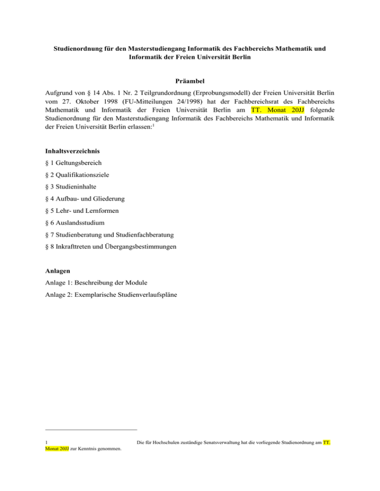 Studienordnung für den Masterstudiengang Informatik des Fachbereichs Mathematik und Informatik der Freien Universität Berlin Präambel Aufgrund von § 14 Abs. 1 Nr. 2 Teilgrundordnung (Erprobungsmodell) der Freien Universität Berlin vom 27. Oktober 1998 (FU-Mitteilungen 24/1998) hat der Fachbereichsrat des Fachbereichs Mathematik und Informatik der Freien Universität Berlin am TT. Monat 20JJ folgende Studienordnung für den Masterstudiengang Informatik des Fachbereichs Mathematik und Informatik der Freien Universität Berlin erlassen:1 Inhaltsverzeichnis § 1 Geltungsbereich § 2 Qualifikationsziele § 3 Studieninhalte § 4 Aufbau- und Gliederung § 5 Lehr- und Lernformen § 6 Auslandsstudium § 7 Studienberatung und Studienfachberatung § 8 Inkrafttreten und Übergangsbestimmungen Anlagen Anlage 1: Beschreibung der Module Anlage 2: Exemplarische Studienverlaufspläne 1 Monat 20JJ zur Kenntnis genommen. Die für Hochschulen zuständige Senatsverwaltung hat die vorliegende Studienordnung am TT. §1 Geltungsbereich (1) Diese Ordnung regelt Ziele, Inhalt und Aufbau des Masterstudiengangs Informatik des Fachbereichs Mathematik und Informatik der Freien Universität Berlin (Masterstudiengang) auf Grundlage der Prüfungsordnung vom TT. Monat 20JJ. (2) Es handelt sich um einen konsekutiven Masterstudiengang gemäß § 23 Abs. 3 Nr. 1 a) des Gesetzes über die Hochschulen im Land Berlin (Berliner Hochschulgesetz – BerlHG) vom 26. Juli 2011 (GVBl. S. 378). §2 Qualifikationsziele (1) Die Absolventinnen und Absolventen können Aufgaben aus Anwendungen auf ihren informatischen Gehalt zurückführen, und sie dann systematisch lösen, indem sie Abstraktionen und geeignete Modellierungen verwenden. Zu diesem Zweck besitzen die Absolventen und Absolventinnen vertiefte Kenntnisse und Fähigkeiten in Gebieten, bei denen die Informatik eine aktuelle Schlüsselrolle spielt, und können sie in diesen Gebieten anwenden. Sie berücksichtigen dabei Aspekte der Sicherheit, der Effizienz, der Benutzbarkeit, und der Korrektheit. Sie können ein Softwareprojekt planen und leiten. Sie beherrschen Techniken der wissenschaftlichen Recherche, im Lesen und Verfassen deutscher und fremdsprachiger wissenschaftlicher Texte, in Vortragstechnik und Präsentation. Sie haben Team- und Kommunikationsfähigkeiten. Daneben besitzen die Absolventinnen und Absolventen individuelle Kenntnisse und Kompetenzen in einem anderen Anwendungsgebiet. So zum Beispiel: Natur-, Geistes-, Wirtschafts-, Rechts- oder Sozialwissenschaften. (2) Die Absolventinnen und Absolventen sind in der Lage, Aufgabenstellungen und Problemlösungen auch in Teams verantwortlich anzuleiten. Dabei können sie insbesondere Gender- und Diversitätsaspekte berücksichtigen. Ergebnisse der Arbeit können für unterschiedliche Abnehmergruppen spezifisch, sachlich und verständlich aufbereitet und präsentiert werden. (3) Die Absolventinnen und Absolventen sind für ein weiterführendes Promotionsstudium qualifiziert. Sie sind für Tätigkeitsfelder in der Informations- und Telekommunikationstechnik qualifiziert, z.B. in Forschung und Entwicklung. Durch ihre Fähigkeit zum abstrakten und analytischen Denken sind Absolventinnen und Absolventen jedoch nicht auf ein festes Berufsbild beschränkt, sondern sie sind für Führungsaufgaben in einer breiten Palette an Bereichen geeignet. §3 Studieninhalte (1) Das Studium vermittelt Kenntnisse und Fähigkeiten in den Teildisziplinen der praktischen, technischen, und theoretischen Informatik und in einem Anwendungsgebiet. In einer Teildisziplin werden schwerpunktmäßig vertiefte Kenntnisse und Fähigkeiten erworben. Im Studium setzen sich die Studentinnen und Studenten mit Verlässlichkeit, Sicherheit, und Effizienz auseinander. Sie werden unter Berücksichtigung gesellschaftlicher Aspekte an aktuelle Herausforderungen herangeführt, wie sie zum Beispiel autonome Systemen in der Robotik oder große Datenmengen aus dem Netz, aus großen Experimenten oder der Wirtschaft darstellen. Sie haben die Möglichkeit, sich in der aktuellen Forschung zu spezialisieren. (2) In Softwareprojekten erarbeiten die Studentinnen und Studenten gemeinsam im Team Lösungen einer komplexeren Aufgabe in einer vorgegebenen Zeit. Das Studium vermittelt die nötigen Kenntnisse zu Gender- und Diversityaspekten, die für die Teamarbeit und für das Zeitmanagement erforderlich sind. Dabei werden Verantwortungen für Teilaufgaben übernommen. Es werden mündliche und schriftliche Präsentationen von wissenschaftlichen Ergebnissen an unterschiedliche Abnehmergruppen geübt. §4 Aufbau und Gliederung (1) Der Masterstudiengang ist in inhaltlich definierte Einheiten (Module) gegliedert, die in der Regel zwei thematisch aufeinander bezogene Lehr- und Lernformen umfassen. Der Masterstudiengang im Umfang von 120 Leistungspunkten (LP) gliedert sich in - den Grundlagenbereich im Umfang von 40 LP - einen Vertiefungsbereich im Umfang von 20 LP - einen Wahlbereich Informatik im Umfang von 10 LP - einen Anwendungsbereich im Umfang von 10 LP - einen Wahlbereich im Umfang von 10 LP - die Masterarbeit mit begleitendem Kolloquium und Präsentation der Ergebnisse im Umfang von 30 LP (2) Im Grundlagenbereich werden drei Teildisziplinen angeboten. 1. Praktische Informatik: Es sind Module im Umfang von 20 LP zu absolvieren. Module, die bereits in der Vertiefungsphase des Bachelorstudiengangs Informatik absolviert worden sind, können nicht gewählt werden. - Modul: Bildverarbeitung (5 LP) - Modul: Computergrafik (10 LP) - Modul: Computer-Vision (5 LP) - Modul: Datenbanktechnologie (5 LP) - Modul: Empirische Bewertung in der Informatik (5 LP) - Modul: Existenzgründungen in der IT-Industrie (5 LP) - Modul: Grundlagen des Softwaretestens (5 LP) - Modul: Künstliche Intelligenz (5 LP) - Modul: Medizinische Bildverarbeitung (5 LP) - Modul: Mustererkennung (5 LP) - Modul: Netzbasierte Informationssysteme (5 LP) - Modul: Projektmanagement (5 LP) - Modul: Rechnersicherheit (10 LP