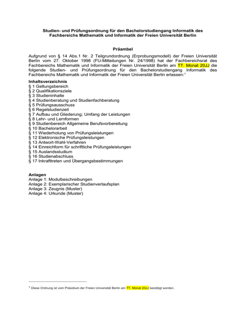 Studien- und Prüfungsordnung für den Bachelorstudiengang Informatik des Fachbereichs Mathematik und Informatik der Freien Universität Berlin Präambel Aufgrund von § 14 Abs.1 Nr. 2 Teilgrundordnung (Erprobungsmodell) der Freien Universität Berlin vom 27. Oktober 1998 (FU-Mitteilungen Nr. 24/1998) hat der Fachbereichsrat des Fachbereichs Mathematik und Informatik der Freien Universität Berlin am TT. Monat 20JJ die folgende Studien- und Prüfungsordnung für den Bachelorstudiengang Informatik des Fachbereichs Mathematik und Informatik der Freien Universität Berlin erlassen:1 Inhaltsverzeichnis § 1 Geltungsbereich § 2 Qualifikationsziele § 3 Studieninhalte § 4 Studienberatung und Studienfachberatung § 5 Prüfungsausschuss § 6 Regelstudienzeit § 7 Aufbau und Gliederung; Umfang der Leistungen § 8 Lehr- und Lernformen § 9 Studienbereich Allgemeine Berufsvorbereitung § 10 Bachelorarbeit § 11 Wiederholung von Prüfungsleistungen § 12 Elektronische Prüfungsleistungen § 13 Antwort-Wahl-Verfahren § 14 Einreichform für schriftliche Prüfungsleistungen § 15 Auslandsstudium § 16 Studienabschluss § 17 Inkrafttreten und Übergangsbestimmungen Anlagen Anlage 1: Modulbeschreibungen Anlage 2: Exemplarischer Studienverlaufsplan Anlage 3: Zeugnis (Muster) Anlage 4: Urkunde (Muster) 1 Diese Ordnung ist vom Präsidium der Freien Universität Berlin am TT. Monat 20JJ bestätigt worden. §1 Geltungsbereich Diese Ordnung regelt Ziele, Inhalt und Aufbau des Bachelorstudiengangs Informatik des Fachbereichs Mathematik und Informatik der Freien Universität Berlin (Bachelorstudiengang) und in Ergänzung zur Rahmenstudien- und -prüfungsordnung der Freien Universität Berlin (RSPO) Anforderungen und Verfahren für die Erbringung von Studien- und Prüfungsleistungen (Leistungen) im Bachelorstudiengang. §2 Qualifikationsziele (1) Die Absolventinnen und Absolventen kennen das Spektrum informatischer Grundbegriffe und Methoden von theoretischen Grundlagen über zentrale Konzepte der technischen und der praktischen Informatik bis hin zu Phänomenen sozio-technischer Systeme. Sie erkennen in der Arbeitspraxis, wo diese jeweils relevant sind und können sie anwenden. Sie können dieses Wissen und diese Fertigkeiten bei Bedarf selbständig gezielt erweitern oder aktualisieren und sich dafür nötigenfalls den Stand der Wissenschaft zum betreffenden Thema aneignen. Sie sind in der Lage, ein informatisches Problem präzise zu spezifizieren oder näherungsweise mit angemessenen Mitteln zu modellieren und dabei nach Bedarf zwischen technischen und am Anwendungsbereich orientierten Ausdrucksebenen hin- und herwechseln. Sie können informatisches Denken auch in außertechnischen Zusammenhängen anwenden und erklären. Sie können ein Softwaresystem moderater Komplexität allein oder im Team konstruieren, implementieren, dokumentieren, testen und in guter Qualität liefern. Sie setzen dafür moderne Arbeitsprozesse, Entwicklungswerkzeuge, Programmiersprachen, Standardsystemstrukturen, Softwarekomponenten und Algorithmen nach technischen und wirtschaftlichen Gesichtspunkten geeignet ein. Analog können Sie größere Projekte anteilig im Team übernehmen, um Teilaufgaben selbständig zu bearbeiten, die Ergebnisse anderer aufzunehmen und die eigenen Ergebnisse weiterzugeben. Sie können die Korrektheit, Sicherheit und Angemessenheit einer von ihnen selbst vorgeschlagenen Lösung überzeugend begründen. Sie können soziotechnische Auswirkungen von Informatiksystemen abschätzen. Innerhalb eines Wahlpflichtbereichs entwickelten sie ein individuelles Profil und sind punktuell mit dem dortigen Stand der Forschung, entsprechenden Methoden, Inhalten und Anwendungen vertraut. Sie können sich selbständig und zügig in neue Anwendungsgebiete und Technologien einarbeiten. Sie können kritisch urteilen und handeln verantwortlich. Sie können mit Hilfe dieser Grundlagen und Techniken neue Probleme der Informatik analysieren und verstehen und fehlende Fertigkeiten selbstständig erwerben. (2) Über die Qualifikationen in der Informatik hinaus besitzen die Absolventinnen und Absolventen individuelle Kenntnisse und Kompetenzen, die sie im Studium eines Anwendungsbereichs aus den Bereichen der Natur-, Geistes-, Wirtschafts-, Rechts- oder Sozialwissenschaften sowie im Studienbereich Allgemeine Berufsvorbereitung erworben haben. Besondere Bedeutung kommt der Fähigkeit zu, sich auf wechselnde Aufgabengebiete einstellen zu können, sich den wandelnden Bedingungen der Praxis der Informationsverarbeitung anpassen zu können und diesen Wandel aktiv mitzugestalten. (3) Mit dem Abschluss des Bachelorstudiums sind die Absolventinnen und Absolventen für einen weiterführenden Masterstudiengang in der Informatik oder einem spezialisierteren Informatikfach qualifiziert. Das Bachelorstudium bereitet auf die berufliche Praxis auf dem Gebiet der Informatik in anwendungs-, herstellungs-, forschungs- und lehrbezogenen Tätigkeiten vor. Beschäftigung finden Absolventinnen und Absolventen in fast allen Wirtschaftsbranchen sowie im öffentlichen Dienst. Sie können in Funktionen arbeiten, die mit der Konzeption, der Entwicklung oder dem Betrieb von Informatiksystemen zu tun haben, oder solchen, die in anderer Weise von der vielseitigen informatischen Denkweise mit Modellierung, Abstraktion, Systematisierung oder Algorithmisierung profitieren. §3 Studieninhalte (1) Im Bachelorstudiengang werden auf Grundlage von mathematischen und informatischen Theorien und Methoden Softwaresysteme und deren Anforderungen analysiert und formalisiert. Techniken des Entwurfs und der Verwirklichung von neuen Software- und Hardwaresystemen werden erlernt und deren Qualität durch empirische, induktive und deduktive Methoden gesichert. In Algorithmen und Programmierung werden die grundlegenden Methoden zur Programmierung von Rechnern erlernt. In Technischer Informatik werden die grundlegenden Eigenschaften von Rechnersystemen untersucht; die Studentinnen und S
