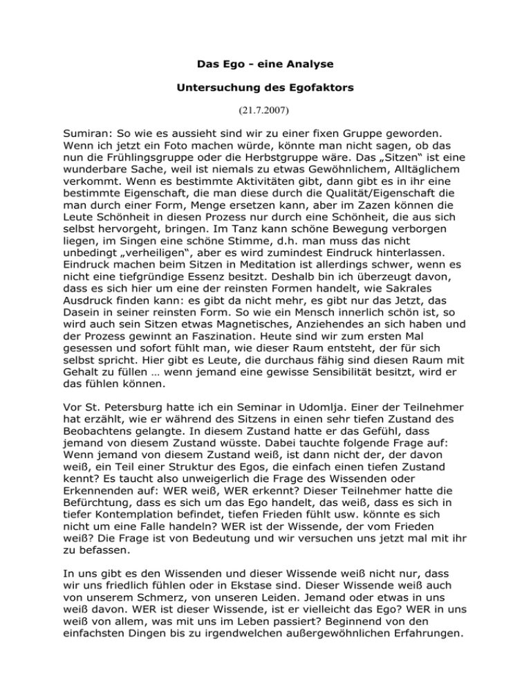 Das Ego - eine Analyse Untersuchung des Egofaktors (21.7.2007) Sumiran: So wie es aussieht sind wir zu einer fixen Gruppe geworden. Wenn ich jetzt ein Foto machen würde, könnte man nicht sagen, ob das nun die Frühlingsgruppe oder die Herbstgruppe wäre. Das „Sitzen“ ist eine wunderbare Sache, weil ist niemals zu etwas Gewöhnlichem, Alltäglichem verkommt. Wenn es bestimmte Aktivitäten gibt, dann gibt es in ihr eine bestimmte Eigenschaft, die man diese durch die Qualität/Eigenschaft die man durch einer Form, Menge ersetzen kann, aber im Zazen können die Leute Schönheit in diesen Prozess nur durch eine Schönheit, die aus sich selbst hervorgeht, bringen. Im Tanz kann schöne Bewegung verborgen liegen, im Singen eine schöne Stimme, d.h. man muss das nicht unbedingt „verheiligen“, aber es wird zumindest Eindruck hinterlassen. Eindruck machen beim Sitzen in Meditation ist allerdings schwer, wenn es nicht eine tiefgründige Essenz besitzt. Deshalb bin ich überzeugt davon, dass es sich hier um eine der reinsten Formen handelt, wie Sakrales Ausdruck finden kann: es gibt da nicht mehr, es gibt nur das Jetzt, das Dasein in seiner reinsten Form. So wie ein Mensch innerlich schön ist, so wird auch sein Sitzen etwas Magnetisches, Anziehendes an sich haben und der Prozess gewinnt an Faszination. Heute sind wir zum ersten Mal gesessen und sofort fühlt man, wie dieser Raum entsteht, der für sich selbst spricht. Hier gibt es Leute, die durchaus fähig sind diesen Raum mit Gehalt zu füllen … wenn jemand eine gewisse Sensibilität besitzt, wird er das fühlen können. Vor St. Petersburg hatte ich ein Seminar in Udomlja. Einer der Teilnehmer hat erzählt, wie er während des Sitzens in einen sehr tiefen Zustand des Beobachtens gelangte. In diesem Zustand hatte er das Gefühl, dass jemand von diesem Zustand wüsste. Dabei tauchte folgende Frage auf: Wenn jemand von diesem Zustand weiß, ist dann nicht der, der davon weiß, ein Teil einer Struktur des Egos, die einfach einen tiefen Zustand kennt? Es taucht also unweigerlich die Frage des Wissenden oder Erkennenden auf: WER weiß, WER erkennt? Dieser Teilnehmer hatte die Befürchtung, dass es sich um das Ego handelt, das weiß, dass es sich in tiefer Kontemplation befindet, tiefen Frieden fühlt usw. könnte es sich nicht um eine Falle handeln? WER ist der Wissende, der vom Frieden weiß? Die Frage ist von Bedeutung und wir versuchen uns jetzt mal mit ihr zu befassen. In uns gibt es den Wissenden und dieser Wissende weiß nicht nur, dass wir uns friedlich fühlen oder in Ekstase sind. Dieser Wissende weiß auch von unserem Schmerz, von unseren Leiden. Jemand oder etwas in uns weiß davon. WER ist dieser Wissende, ist er vielleicht das Ego? WER in uns weiß von allem, was mit uns im Leben passiert? Beginnend von den einfachsten Dingen bis zu irgendwelchen außergewöhnlichen Erfahrungen. WER weiß das alles? Ist es das Ego oder nicht das Ego? Was gibt es für Vorschläge von eurer Seite? Fr: Wenn es Erklärungen aus irgendwelchen Erläuterungen aus Texten gibt, dann …. Sumiran: Und wenn es diese nicht gibt? Fr: Wenn Liebe präsent ist und keine Anhaftung da ist, dann ist es nicht das Ego. Sumiran: Wer dann? Fr: Das Bewusstsein. Sumiran: Bewusstsein. Ja, das ist der Wissende, der über alles Bescheid weiß, nicht nur über innere Prozesse, sondern auch über äußere. Wenn etwa die Sonne aufgeht und wir wissen, dass die Sonne aufgeht, d.h. jemand weiß, dass die Sonne aufgegangen ist, das ist eine Art Wissen. Wenn ich weiß, wie hoch meine Körpertemperatur ist, ist das auch eine Art von Wissen und es gibt natürlich den Wissenden, der davon weiß. Man sagt, dass es die Natur des Bewusstseins ist – zu „wissen“. Das Bewusstsein spiegelt wider, wie ein Spiegel. In China erzählt man von einem alten Spiegel dessen Natur es ist zu wissen. Wenn ihr vor einem Spiegel steht, spiegelt dieser euch wider, d.h. er weiß davon, dass ihr vor ihm aufgetaucht seid. Die Widerspiegelung ist seine Art des Wissens, d.h. indem er euch wiederspiegelt, weiß er, dass ihr vor ihm steht. Eine andere Eigenschaft des Spiegels ist, dass er euer Bild nicht speichert und sich nicht daran erinnert. D.h. wenn ihr entsteht, wenn ihr seid, weiß er von euch, wenn ihr vor ihm nicht seid, dann weiß von euch gar nichts, weil ihr einfach nicht da seid. Diese zwei Eigenschaften – die Fähigkeit widerzuspiegeln mittels Wissen und die Fähigkeit sich nicht zu erinnern, d.h. nicht zu „verstauben“, keinen Staub bei sich anzusammeln, es sind dies Besonderheiten, die dieser Wissende besitzt. Wenn ein Mensch geboren wird oder eben irgendeine andere Form, weiß man davon, d.h. es entsteht ein Wissen darüber, dass etwas geboren wurde, irgendein Objekt ist erschienen und jemand weiß davon, es entsteht das Wissen oder das „sich bewusst machen“ des Körpers. Was ist das sich bewusst machen des Körpers? Das ist Wissen, d.h. jemand beginnt davon zu wissen, dass es einen Körper gibt, und mittels dieses Körpers machen wir bestimmte Erfahrungen. In Wirklichkeit existiert dieser Wissende und die Natur oder die Welt, mit einem Wort das, was man im Osten Prakriti nennt. Der Wissende weiß von der Welt, er erfährt sie, folglich entsteht die Welt für ihn. Auch über uns, durch uns weiß „jemand“ von dieser Welt, jemand weiß von unserem Körper und weiß von anderen Menschen, über die Sonne über die Sterne. D.h. es gibt den Wissenden, den man Nirguna (das was jenseits der Gunas ist) nennt, man nennt ihn auch Shiva, und es gibt die Welt, Prakriti oder Shakti, wovon der Wissende weiß. Das heißt also, dass es zwei Erscheinungen oder Phänomene gibt: Prakriti, die Natur und Shiva, also der, der von dieser Natur weiß. Es ist also noch nicht die Rede vom individuellen Wissenden. Die Natur spiegelt sich im Spiegel des Absoluten wider. Folglich existiert der Spiegel auch, weil ja jemand von dieser Natur, von dieser Welt weiß. Diese zwei Erscheinungen, die Natur und der 