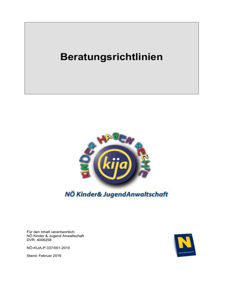 Beratungsrichtlinien Für den Inhalt verantwortlich: NÖ Kinder & Jugend Anwaltschaft DVR: 4006258 NÖ-KIJA-P-337/001-2010 Stand: Februar 2016 Beratungsrichtlinien der NÖ Kinder & Jugend Anwaltschaft (NÖ kija) Inhalt Einleitung ................................................................................................................ 3 I. Der gesetzliche Auftrag Beratung ................................................................ 6 I.1. Bundesgesetz................................................................................................. 6 I.2. Landesverfassungsgesetz ............................................................................ 6 I.3. Landesgesetz ................................................................................................. 7 I.3.1. Gegenstand der Beratungen ............................................................. 7 I.3.2. Zielgruppe der Beratungen .............................................................. 10 I.3.3. Hilfe, Mittler ..................................................................................... 12 I.3.4. Unabhängigkeit ............................................................................... 12 I.3.5. Vertrauliche anonyme und kostenlose Beratung ............................. 13 I.3.6. Zugang zur Beratung....................................................................... 14 I.3.7. Sinn und Ziel der kinderrechtlichen Beratung .................................. 15 I.3.7.1. für Kinder und Jugendliche .............................................................. 15 I.3.7.2. Generell, auch für Erwachsene ....................................................... 16 I.3.8. Kinderrechtliche Defizite, Kinderrechtsverletzungen ....................... 17 I.3.9. Auskunftsrechte............................................................................... 20 I.3.10. Verschwiegenheitsverpflichtung ...................................................... 21 I.3.11. Grundsatz Kindeswohl .................................................................... 22 II. Methoden und Techniken der Beratung .................................................... 29 II.1. Grundsätzliches ........................................................................................... 29 II.2. Gesprächstechniken – Sozialarbeiterische Methoden ............................. 31 II.2.1. Aufgabe der Sozialarbeit ................................................................. 31 II.2.2. Personenzentrierte Gesprächsführung nach C. Rogers .................. 34 II.2.3. Fallintervision .................................................................................. 36 II.2.4. Hilfe zur Selbsthilfe.......................................................................... 37 Anhänge ................................................................................................................ 39 Leitbild (Anhang 1) ................................................................................................ 40 Bundes-Kinder- und Jugendhilfegesetz (Anhang 2) .............................................. 41 Bundesverfassungsgesetz über die Rechte von Kindern - BVG (Anhang 3) ........ 43 Landesverfassungsgesetz (Anhang 4) .................................................................. 44 NÖ Kinder- und Jugendhilfegesetz (NÖKJHG) 2013 (Anhang 5) ......................... 45 Kinderrechte der UN-KRK (Anhang 6) .................................................................. 47 Weitere Rechte von Kindern und Jugendlichen (Anhang 7).................................. 49 Recht auf gewaltfreie Erziehung (Anhang 8)......................................................... 50 Kindeswohl im ABGB (Anhang 9) ......................................................................... 51 Judikatur zum Kindeswohl (Anhang 10) ................................................................ 52 General Comment zum Thema Kindeswohl (Anhang 11) ..................................... 55 Checkliste zur Überprüfung des Kindeswohls (Anhang 12) .................................. 56 Fünf Standards zur Beschreibung des Kindeswohls (Anhang 13) ........................ 57 Literatur (Anhang 14) ............................................................................................ 58 Stand: Jänner 2016 2 Beratungsrichtlinien der NÖ Kinder & Jugend Anwaltschaft (NÖ kija) Einleitung Die vorliegenden Beratungsrichtlinien der NÖ kija haben das Ziel, eine einheitliche Vorgehensweise aller Beraterinnen und Berater, in der kinderrechtlichen Beratungstätigkeit der NÖ kija zu bewirken, und zu gewährleisten. Es hat die Funktion, den gesetzlichen Auftrag1 Beratung der NÖ kija konzeptionell, professionell auszugestalten. Es wird fortlaufend, jedenfalls intern, evaluiert und weiterentwickelt, und mit dem jeweils aktuellen Datum in LAKIS unter NÖ-KIJA-P-337/001-2010 gespeichert. An dieser Stelle ein herzliches Danke an Prof.(FH) Kurt Fellöcker, MA, MSc, DSA, Psychotherapeut (PD) für seine fachliche Beteiligung bei der Erstellung. Die NÖ kija bietet, als unabhängige Ombudsstelle für Kinder und Jugendliche, die der UN KRK verpflichtet ist2, durch Beratung, eine kinderrechtliche Abklärung im konkreten Einzelfall, und wenn möglich kinderrechtliche Lösungsansätze, im Sinne von Hilfe zur Selbsthilfe. Die NÖ kija ist keine Kriseneinrichtung und kann daher keine Krisenberatung bieten, jedoch unter Berücksichtigung der ev. psycho-sozialen Ausnahmesituationen an geeignete Stellen verweisen. Jede die, jeder der bei der NÖ kija in Beratung war, soll eine neue Perspektive haben3. 1 früher §§ 6-8 NÖ JWG 1991 idgf, jetzt §§ 79-81 NÖKJHG, LGBl. 9270-0 UN-KRK, BGBl. 7/1993 3 Zitat aus dem Leitbild der NÖ kija, 3. Absatz: „Wir unterstützen Kinder und ihre Eltern in kritischen Lebenssituationen durch vertrauliche, anonyme und kostenlose Beratung, Information und Hilfe. Jeder hat eine neue Perspektive.“ (siehe Anhang) 2 Stand: Jänner 2016 3 Beratun