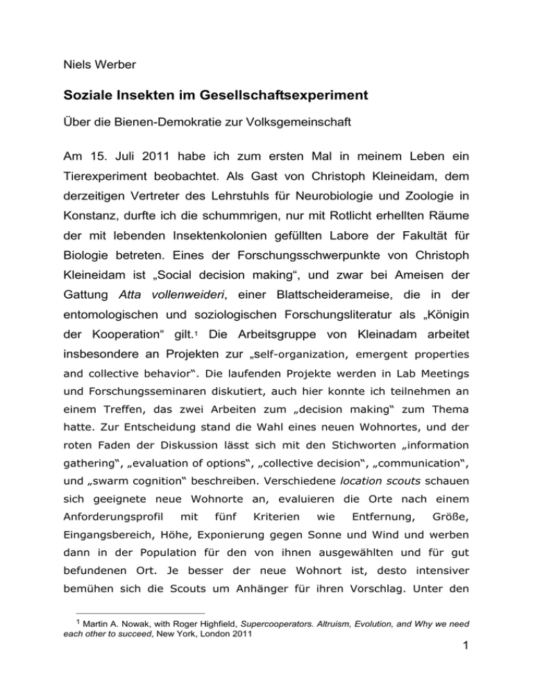 Niels Werber Soziale Insekten im Gesellschaftsexperiment Über die Bienen-Demokratie zur Volksgemeinschaft Am 15. Juli 2011 habe ich zum ersten Mal in meinem Leben ein Tierexperiment beobachtet. Als Gast von Christoph Kleineidam, dem derzeitigen Vertreter des Lehrstuhls für Neurobiologie und Zoologie in Konstanz, durfte ich die schummrigen, nur mit Rotlicht erhellten Räume der mit lebenden Insektenkolonien gefüllten Labore der Fakultät für Biologie betreten. Eines der Forschungsschwerpunkte von Christoph Kleineidam ist „Social decision making“, und zwar bei Ameisen der Gattung Atta vollenweideri, einer Blattscheiderameise, die in der entomologischen und soziologischen Forschungsliteratur als „Königin der Kooperation“ gilt.1 Die Arbeitsgruppe von Kleinadam arbeitet insbesondere an Projekten zur „self-organization, emergent properties and collective behavior“. Die laufenden Projekte werden in Lab Meetings und Forschungsseminaren diskutiert, auch hier konnte ich teilnehmen an einem Treffen, das zwei Arbeiten zum „decision making“ zum Thema hatte. Zur Entscheidung stand die Wahl eines neuen Wohnortes, und der roten Faden der Diskussion lässt sich mit den Stichworten „information gathering“, „evaluation of options“, „collective decision“, „communication“, und „swarm cognition“ beschreiben. Verschiedene location scouts schauen sich geeignete neue Wohnorte an, evaluieren die Orte nach einem Anforderungsprofil mit fünf Kriterien wie Entfernung, Größe, Eingangsbereich, Höhe, Exponierung gegen Sonne und Wind und werben dann in der Population für den von ihnen ausgewählten und für gut befundenen Ort. Je besser der neue Wohnort ist, desto intensiver bemühen sich die Scouts um Anhänger für ihren Vorschlag. Unter den 1 Martin A. Nowak, with Roger Highfield, Supercooperators. Altruism, Evolution, and Why we need each other to succeed, New York, London 2011 1 konkurrierenden Vorschlägen setzt sich mit hoher Wahrscheinlichkeit derjenige durch, der nahezu optimale Bedingungen aufweist, und der Schwarm fällt die für sein Gesamtwohl nützlichste Entscheidung und zieht dort ein. Die Wortwahl lässt fast vergessen, dass es sich nicht um Menschen handelt, sondern um Insekten, und dass hier nicht eine Familie einen Umzug diskutiert, sondern ein Schwarm das Problem der nest site selection löst. Damit bin ich bereits beim Thema, denn die Experimente zum „social decision making“ sind Gesellschaftsexperimente. Und sobald man nur aus den Schwärmen der Bienen und Ameisen eine soziologische oder politologische Lehre zieht, handelt es sich um solche Experimente, deren Ergebnisse auch für uns Menschen Konsequenzen haben. Zu der im Konstanzer Forschungsseminar diskutierten Literatur gehörte auch die im Jahre 2010 erschienene Monographie Honeybee Democracy von Thomas D. Seeley, der sich ebenfalls mit dem Problem der nest site selection experimentell (und nicht etwa nur mathematisch, etwa spieltheoretisch) beschäftigt hat. Seeley hat auf einer von Bienen unbewohnten Insel, dem vor der Küste von New Hampshire liegende Appledore Island, eine Menge unterschiedlich gestalteter künstlicher „nest boxes“ verteilt und seine mitgebrachten und von ihm ausgesetzten Bienenvölker dabei beobachtet, welchen Wohnort sie sich wählen. Die „homeless insects“, schreibt Seeley über die Kernthese seiner Studie, „will do something truly amazing; they will hold a democratic debate to choose their new home.“2 Truely amazing ist aber natürlich vor allem. wie Seeley es schafft, vom Zählen seiner Bienen zu dieser Behauptung zu kommen, sie wählten in einer „demokratischen Debatte“ ihre neue Heimat. Dieser auf den ersten Blick vielleicht etwas beckmesserisch anmutende Verweis auf seine Wortwahl rechtfertigt sich noch auf der gleichen Seite durch den Anspruch Seeleys, sein Buch wende sich nicht 2 Thomas D. Seeley, Honeybee Democracy, Princeton, Oxford 2010, S. 1. 2 allein an Biologen, sondern auch an „social scientists“.3 Die Lehren für den Menschen und seine Gesellschaft zieht er selbst. Denn nach seiner Beschreibung der Experimente auf Appledore Island, ihrer Modellierung mit der Hilfe statistischer Verfahren und der Erklärung des „decision making“ mit der Hilfe der zur Zeit ubiquitären „threshhold“-Theorie,4 kehrt Seeley von den Insekten zu den Menschen zurück. Mit einer Anspielung auf den berühmten Psalm des Alten Testaments – „ Go to the ant, thou sluggard; Consider her ways, and be wise“ – beginnt Seeley sein Kapitel über Swarm Smarts mit der Empfehlung: „Let us now consider what lessons we human can learn from honeybees about how to structure a desicion-making group so that the knowledge and brainpower of ist members is efficiently marshaled to produce good collective choices.“5 Als Dekan seines Departments für Neurobiologie und Verhaltsforschung der Cornell University habe er umgesetzt, was von den Bienen zu lernen sei.6 Er kommt zu fünf Lektionen, die auf „intriguing resemblances between honeybee swarms and New England town meetings“7 beruhen und daher für Bienen und Menschen gleichermaßen gelten: Lesson 1: Compose the decision-making group of individuals with shared interests and mutual respect. Lesson 2: Minimize the leader’s inflience on the group’s thinking Lesson 3: Seek diverse solutions to the problem Lesson 4: aggregate the group’s knowledge through debate Lesson 5: Use quorum responses for cohesion, accuracy, and speed8 3 4 5 6 7 8 Ebd., S: 1. Ebd., S. 8. Ebd., S. 218. Ebd., S. 219. Ebd., S. 219. Ebd., S. 220, 221, 224, 226, 230. 3 Die Ähnlichkeiten liegen, zumindest für Seeley, auf der Hand: alle Bienen haben das gleiche Interesse, für den Schwarm den optimalen Ort für ein neues Nest zu finden, keine Biene wird eine andere geringer achten, wenn sie einen anderen Vorschlag macht, die Königin folgt der Entscheidung des Schwarms, mehrere Vorschläge werden gemacht und auf der Grundlage Entscheidung gem