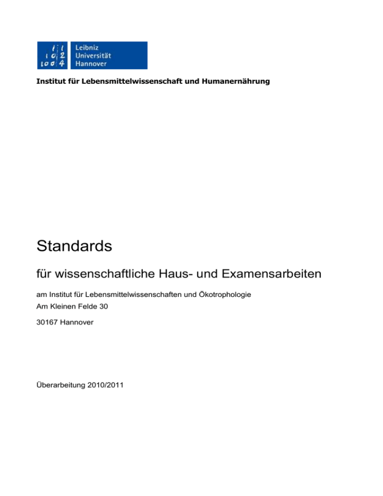 Institut für Lebensmittelwissenschaft und Humanernährung Standards für wissenschaftliche Haus- und Examensarbeiten am Institut für Lebensmittelwissenschaften und Ökotrophologie Am Kleinen Felde 30 30167 Hannover Überarbeitung 2010/2011 Institut für Lebensmittelwissenschaft und Humanernährung Inhalt 1 WOZU STANDARDS? ....................................................................................................... 3 2 AUFBAU UND GESTALTUNG .......................................................................................... 4 2.1 Titelblatt ........................................................................................................................ 4 2.2 Seiten- und Schriftformatierung .................................................................................. 4 2.3 Gliederung einer schriftlichen Arbeit .......................................................................... 6 2.3.1 Formale Aspekte einer Gliederung ............................................................................. 6 2.3.2 Inhaltliche Aspekte einer Gliederung .......................................................................... 7 3 3.1 ZITATE UND ZITIERWEISEN .......................................................................................... 10 Zitierweisen im wissenschaftlichen Kontext ............................................................ 11 3.2 Kurzbeleg im Text (Amerikanische Zitierweise) ....................................................... 11 3.2.1 Autorenangaben ....................................................................................................... 11 3.3 Unbekannte Autoren oder unpersonifizierte Autorenschaft ................................... 13 3.3.1 Angabe der Seitenzahlen ......................................................................................... 13 3.4 Hinweise für wörtliche Zitate ..................................................................................... 14 3.4.1 Vollständige wörtliche Zitate ..................................................................................... 14 3.4.2 Auslassungen bei wörtlichen Zitaten......................................................................... 15 3.4.3 Ergänzungen und Anpassungen bei wörtlichen Zitaten ............................................ 15 3.4.4 Zitate im wörtlichen Zitat ........................................................................................... 16 4 LITERATURAUSWAHL UND LITERATURDOKUMENTATION ...................................... 18 4.1 Literaturauswahl......................................................................................................... 18 4.2 Was gehört in das Literaturverzeichnis? .................................................................. 19 4.3 Ordnung im Literaturverzeichnis .............................................................................. 19 4.4 Bibliographische Daten für das Literaturverzeichnis .............................................. 20 4.5 Erstellen des Literaturverzeichnisses....................................................................... 24 5 BENOTUNGSSCHEMA UND BEURTEILUNGSKRITERIEN .......................................... 26 6 VERZEICHNISSE ............................................................................................................ 27 6.1 Abbildungsverzeichnis .............................................................................................. 27 6.2 Tabellenverzeichnis ................................................................................................... 27 2 Institut für Lebensmittelwissenschaft und Humanernährung 1 Wozu Standards? Die häufigen Fragen und vielfachen Verunsicherungen der Studierenden haben uns veranlasst, in dieser Handreichung Standards für wissenschaftliche Arbeiten am Institut für Lebensmittelwissenschaft und Humanernährung zusammenzufassen. Auf den nachfolgenden Seiten sind Orientierungshilfen formuliert, die bei einer Haus- oder Examensarbeit am Institut für Lebensmittelwissenschaft und Humanernährung allgemein berücksichtigt werden sollen. Im Einzelfall sind je nach Themenstellung noch weitere Rahmenbedingungen zu beachten. Dies betrifft insbesondere Arbeiten mit experimentellem Charakter. Hierzu bitte immer Rücksprache mit dem Dozenten halten. Wir verweisen darauf, dass in anderen wissenschaftlichen Bereichen, andere Standards gelten können. 3 Institut für Lebensmittelwissenschaft und Humanernährung 2 Aufbau und Gestaltung 2.1 Titelblatt Das Titelblatt enthält die Angaben über: Das Thema (Titel mit eingrenzendem Untertitel) Art der Arbeit Wissenschaftliches Arbeiten Zeitpunkt der Erstellung Hausarbeit zum Seminar.... Seminar / evtl. Dozent, bzw. Prüfer Autor: Name, Matrikelnummer SS 1999 Vorgelegt von Name: Mat.-Nr.... Abbildung 1: Muster für ein Titelblatt einer wissenschaftlichen Arbeit 2.2 Seiten- und Schriftformatierung Ab Seite 2 des Dokumentes sollen folgende Seitenformate und Schriftformate verwendet werden: Tabelle 1: Seiten- und Schriftformatierung Rand oben 2,0 cm Rand unten 2,0 cm Rand links 2,5 cm Rand rechts 2,5 cm Seitennummerierung Arabisch / Fußzeile rechts unten, ab Seite 2 – letzte Seite Schrifttyp Serifenlose Schrift (Arial, Verdana, Tahoma) Schriftgrad Standard 11 oder 12 Zeilenabstand im Fließtext: 1,5 zeilig / Blocksatz Aufzählungen: 1 zeilig / linksbündig 4 Institut für Lebensmittelwissenschaft und Humanernährung Nachstehend einige Vorschläge für die Dokument- und die Formatvorlagen der Gliederungsabschnitte. Diese können in Word unter ‚Formatvorlagen und Formatierung’ einheitlich für ein Dokument oder eine Dokumentvorlage festgelegt werden. Tabelle 2: Formatvorlagen für Gliederungsebenen (Fortsetzung nächste Seite) Formatvorlage Überschrift 1 = 1 Formatierungsbeispiele Standard 16; fett; linksbündig; 1 zeilig; hängend; 24 pt nach; immer mit neuer Seite beginnend; automatische Gliederungsnummerierung Überschrift 2 = 1.2 S