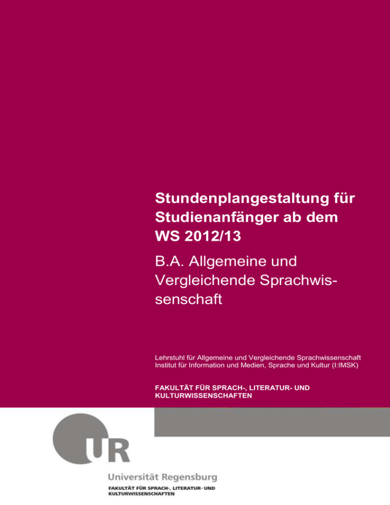 Stundenplangestaltung für Studienanfänger ab dem WS 2012/13 B.A. Allgemeine und Vergleichende Sprachwissenschaft Lehrstuhl für Allgemeine und Vergleichende Sprachwissenschaft Institut für Information und Medien, Sprache und Kultur (I:IMSK) FAKULTÄT FÜR SPRACH-, LITERATUR- UND KULTURWISSENSCHAFTEN 1 Wir freuen uns sehr, dass Sie sich für ein Studium der Allgemeinen und Vergleichenden Sprachwissenschaft an der Universität Regensburg entschieden haben! Dieses Dokument soll Ihnen den Einstieg ins Studium erleichtern, indem es Ihnen die wichtigsten Informationen, die Sie für Ihren Studienstart benötigen, bereitstellt. Es soll Ihnen vor allem dabei helfen, Ihren Studienverlauf zu planen sowie Ihren Stundenplan zu erstellen. Wir weisen Sie daraufhin, dass dieses Dokument zwar mit aller Sorgfalt erstellt wurde, jedoch nicht die für Sie geltenden Studiendokumente ersetzen kann. Daher wird Ihnen zu Beginn dieses Dokuments aufgezeigt, wo Sie die wichtigsten Studiendokumente finden. Wir bitten Sie ausdrücklich, sich diese anzusehen! Inhaltsverzeichnis: 1. Was sind die wichtigsten Materialien zum Studium und wo finde ich diese? 2. Wie ist das Studium aufgebaut? 3. Welche Module und Kurse muss ich in meinem Studium absolvieren? 4. Wie erstelle ich meinen Stundenplan? 5. Welche Kurse werden im ersten Semester empfohlen? 6. Welche Kurse muss/kann ich im Rahmen der 20 freien Leistungspunkte absolvieren? 7. Wie finde ich den Raum, in dem mein Kurs stattfindet? 8. Wo finde ich die Kursmaterialien? 9. Wie errechnet sich meine Abschlussnote? 10. Wer kann mir bei Fragen und Problemen helfen? 1. Was sind die wichtigsten Materialien zum Studium und wo finde ich diese? 2 Bevor Sie Ihr Studium beginnen, sollten Sie sich mit den für Sie geltenden Studiendokumenten beschäftigen. Zentral sind dabei vor allem folgende zwei Dokumente: • Die Bachelorprüfungs- und Studienordnung für die Philosophischen Fakultäten I – III. Gültig für Studienanfänger des WS 2012/13 ist der „Text der Ordnung in der Fassung der Änderungssatzung vom 14. März 2012“. Diese Prüfungsordnungen finden Sie unter diesem Link. • Die Modulbeschreibungen der Fächer, die Sie studieren. Die Modulbeschreibungen für Bachelor of Arts-Studiengänge finden Sie unter diesem Link. Bevor Sie Ihr Studium beginnen, erhalten Sie zudem wertvolle Informationen über die Webseiten Ihrer Fächer. Auf der Webseite des Lehrstuhls für Allgemeine und Vergleichende Sprachwissenschaft finden Sie zum Beispiel alle wichtigen Ansprechpartner, die angebotenen Lehrveranstaltungen oder auch einen exemplarischen Studienverlauf mit Empfehlungen für das 1. Semester. Über die Webseite des I:IMSK gelangen Sie zudem leicht auf die Webseiten der weiteren Studiengänge des Instituts. Im I:IMSK-Forum werden Ihnen alle aktuellen Informationen bereitgestellt. Zudem finden Sie hier auch Ankündigungen der Fachschaft und Praktikumsangebote. 2. Wie ist das Studium aufgebaut? Dauer des Studiums Die Regelstudienzeit des B.A.-Studiums beträgt 6 Fachsemester (Urlaubssemester zählen nicht als Fachsemester). Falls Sie Ihr Studium nicht innerhalb dieser 6 Semester abschließen können, ist das jedoch kein Problem: Sie dürfen 8 Fachsemester bis zu Ihrem Abschluss benötigen ohne einen Antrag auf Verlängerung Ihres Studiums stellen zu müssen. Grundsätzlicher Aufbau des Studiums Bei der Einschreibung zu Ihrem B.A.-Studium haben Sie sich für eine bestimmte Fächerkombination entschieden. Allgemein gilt für alle Fächerkombinationen: • Sie müssen für Ihren Abschluss insgesamt 180 Leistungspunkte (LP) erwerben. • Davon müssen Sie 90 LP in Ihrem 1. Hauptfach absolvieren. • Die B.A.-Arbeit muss in Ihrem 1. Hauptfach geschrieben werden. Für die B.A.-Arbeit erhalten Sie 10 LP. 3 • 20 LP müssen/können Sie im Rahmen der freien Leistungspunkte absolvieren. • Die restlichen 60 LP müssen Sie in Ihrem 2. Hauptfach oder in Ihren Nebenfächern absolvieren. Hintergrundinformation: Was ist ein Leistungspunkt (LP)? 1 LP entspricht 25-30 Arbeitsstunden (inkl. Vor- u. Nachbereitung der Kurse, Lernen für die Prüfung etc.). Für einen Kurs mit z.B. 6 LP müssen Sie somit mit einer gesamten Arbeitsbelastung von 150-180 Stunden rechnen, die sich auf die Vorlesungszeit (und manchmal auch die vorlesungsfreie Zeit) verteilt. Die unterschiedlichen Kombinationsmöglichkeiten Ihrer Fächer 1. Variante: 2 Hauptfächer 2. Variante: 1 Hauptfach, 2 Nebenfächer 3. Welche Module und Kurse muss ich in meinem Studium absolvieren? Module Das B.A.-Studium ist modularisiert. D.h. Sie erwerben die in Ihrem Fach benötigten Leistungspunkte, indem Sie bestimmte Module absolvieren. Ein Modul besteht dabei immer aus mindestens 2 Lehrveranstaltungen und kann normalerweise innerhalb von 2 Semestern absolviert werden. Bezüglich der Module wird unterschieden zwischen: • Pflichtmodulen Diese Module müssen Sie im Rahmen Ihres Studiums absolvieren. 4 • Wahlpflichtmodulen Hier können Sie sich aus mehreren Modulen diejenigen auswählen, die Sie am meisten interessieren. Dabei gilt jedoch: Sie müssen eine bestimmte Anzahl an Modulen auswählen. Je nachdem, ob Sie Allgemeine und Vergleichende Sprachwissenschaft als 1. Hauptfach, 2. Hauptfach oder Nebenfach studieren, müssen Sie unterschiedliche Module absolvieren. Welche dies jeweils sind, erfahren Sie in der für Sie gültigen Prüfungsordnung und auf den nächsten Seiten. Allgemeine und Vergleichende Sprachwissenschaft als 1. Hauptfach Studieren Sie Allgemeine und Vergleichende Sprachwissenschaft als 1. Hauptfach, müssen Sie im Rahmen Ihres Studiums folgende Module absolvieren (Pflichtmodule): Modul-Nr. Modulbezeichnung LP AVS-M01 Basismodul I: Grundlagen und Methoden der AVS 12 AVS-M02 Basismodul II: Grundlagen und Methoden der AVS 14 bis 16 AVS-M03 Struktur einer nicht-indogermanischen Sprache 10 AVS-M04 Aufbaumodul: Grundlagen und Methoden der AVS 15 Zusätzlich müssen Sie 1 weiteres Modul absolvieren. Hierbei können Sie selbst 