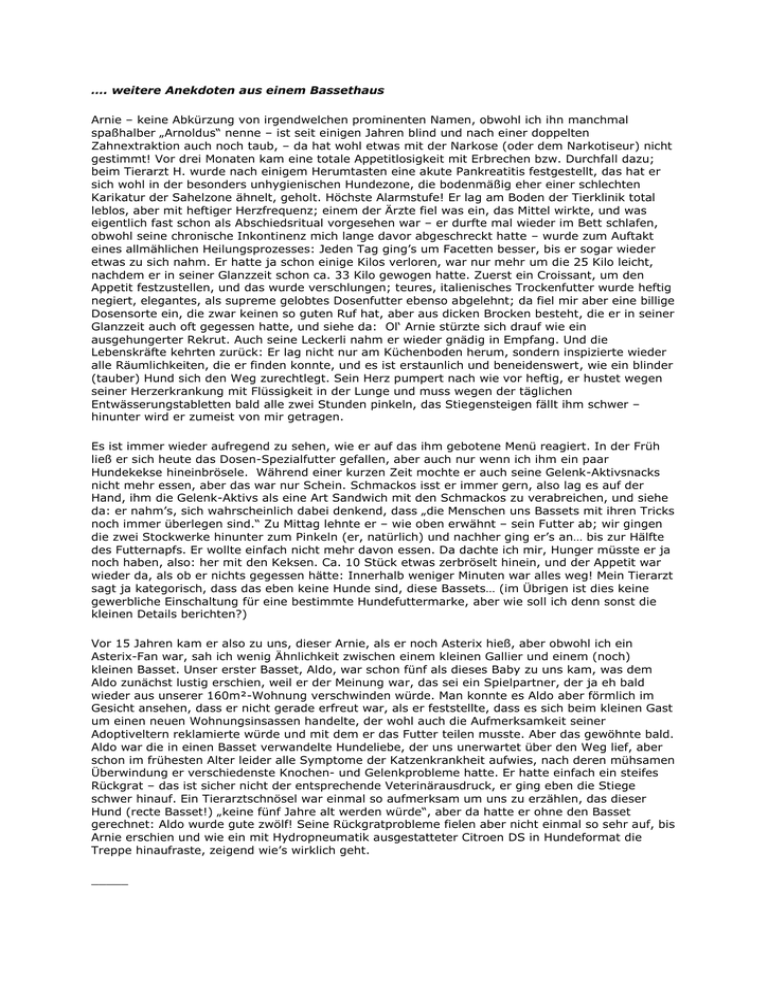 …. weitere Anekdoten aus einem Bassethaus Arnie – keine Abkürzung von irgendwelchen prominenten Namen, obwohl ich ihn manchmal spaßhalber „Arnoldus“ nenne – ist seit einigen Jahren blind und nach einer doppelten Zahnextraktion auch noch taub, – da hat wohl etwas mit der Narkose (oder dem Narkotiseur) nicht gestimmt! Vor drei Monaten kam eine totale Appetitlosigkeit mit Erbrechen bzw. Durchfall dazu; beim Tierarzt H. wurde nach einigem Herumtasten eine akute Pankreatitis festgestellt, das hat er sich wohl in der besonders unhygienischen Hundezone, die bodenmäßig eher einer schlechten Karikatur der Sahelzone ähnelt, geholt. Höchste Alarmstufe! Er lag am Boden der Tierklinik total leblos, aber mit heftiger Herzfrequenz; einem der Ärzte fiel was ein, das Mittel wirkte, und was eigentlich fast schon als Abschiedsritual vorgesehen war – er durfte mal wieder im Bett schlafen, obwohl seine chronische Inkontinenz mich lange davor abgeschreckt hatte – wurde zum Auftakt eines allmählichen Heilungsprozesses: Jeden Tag ging’s um Facetten besser, bis er sogar wieder etwas zu sich nahm. Er hatte ja schon einige Kilos verloren, war nur mehr um die 25 Kilo leicht, nachdem er in seiner Glanzzeit schon ca. 33 Kilo gewogen hatte. Zuerst ein Croissant, um den Appetit festzustellen, und das wurde verschlungen; teures, italienisches Trockenfutter wurde heftig negiert, elegantes, als supreme gelobtes Dosenfutter ebenso abgelehnt; da fiel mir aber eine billige Dosensorte ein, die zwar keinen so guten Ruf hat, aber aus dicken Brocken besteht, die er in seiner Glanzzeit auch oft gegessen hatte, und siehe da: Ol‘ Arnie stürzte sich drauf wie ein ausgehungerter Rekrut. Auch seine Leckerli nahm er wieder gnädig in Empfang. Und die Lebenskräfte kehrten zurück: Er lag nicht nur am Küchenboden herum, sondern inspizierte wieder alle Räumlichkeiten, die er finden konnte, und es ist erstaunlich und beneidenswert, wie ein blinder (tauber) Hund sich den Weg zurechtlegt. Sein Herz pumpert nach wie vor heftig, er hustet wegen seiner Herzerkrankung mit Flüssigkeit in der Lunge und muss wegen der täglichen Entwässerungstabletten bald alle zwei Stunden pinkeln, das Stiegensteigen fällt ihm schwer – hinunter wird er zumeist von mir getragen. Es ist immer wieder aufregend zu sehen, wie er auf das ihm gebotene Menü reagiert. In der Früh ließ er sich heute das Dosen-Spezialfutter gefallen, aber auch nur wenn ich ihm ein paar Hundekekse hineinbrösele. Während einer kurzen Zeit mochte er auch seine Gelenk-Aktivsnacks nicht mehr essen, aber das war nur Schein. Schmackos isst er immer gern, also lag es auf der Hand, ihm die Gelenk-Aktivs als eine Art Sandwich mit den Schmackos zu verabreichen, und siehe da: er nahm’s, sich wahrscheinlich dabei denkend, dass „die Menschen uns Bassets mit ihren Tricks noch immer überlegen sind.“ Zu Mittag lehnte er – wie oben erwähnt – sein Futter ab; wir gingen die zwei Stockwerke hinunter zum Pinkeln (er, natürlich) und nachher ging er’s an… bis zur Hälfte des Futternapfs. Er wollte einfach nicht mehr davon essen. Da dachte ich mir, Hunger müsste er ja noch haben, also: her mit den Keksen. Ca. 10 Stück etwas zerbröselt hinein, und der Appetit war wieder da, als ob er nichts gegessen hätte: Innerhalb weniger Minuten war alles weg! Mein Tierarzt sagt ja kategorisch, dass das eben keine Hunde sind, diese Bassets… (im Übrigen ist dies keine gewerbliche Einschaltung für eine bestimmte Hundefuttermarke, aber wie soll ich denn sonst die kleinen Details berichten?) Vor 15 Jahren kam er also zu uns, dieser Arnie, als er noch Asterix hieß, aber obwohl ich ein Asterix-Fan war, sah ich wenig Ähnlichkeit zwischen einem kleinen Gallier und einem (noch) kleinen Basset. Unser erster Basset, Aldo, war schon fünf als dieses Baby zu uns kam, was dem Aldo zunächst lustig erschien, weil er der Meinung war, das sei ein Spielpartner, der ja eh bald wieder aus unserer 160m²-Wohnung verschwinden würde. Man konnte es Aldo aber förmlich im Gesicht ansehen, dass er nicht gerade erfreut war, als er feststellte, dass es sich beim kleinen Gast um einen neuen Wohnungsinsassen handelte, der wohl auch die Aufmerksamkeit seiner Adoptiveltern reklamierte würde und mit dem er das Futter teilen musste. Aber das gewöhnte bald. Aldo war die in einen Basset verwandelte Hundeliebe, der uns unerwartet über den Weg lief, aber schon im frühesten Alter leider alle Symptome der Katzenkrankheit aufwies, nach deren mühsamen Überwindung er verschiedenste Knochen- und Gelenkprobleme hatte. Er hatte einfach ein steifes Rückgrat – das ist sicher nicht der entsprechende Veterinärausdruck, er ging eben die Stiege schwer hinauf. Ein Tierarztschnösel war einmal so aufmerksam um uns zu erzählen, das dieser Hund (recte Basset!) „keine fünf Jahre alt werden würde“, aber da hatte er ohne den Basset gerechnet: Aldo wurde gute zwölf! Seine Rückgratprobleme fielen aber nicht einmal so sehr auf, bis Arnie erschien und wie ein mit Hydropneumatik ausgestatteter Citroen DS in Hundeformat die Treppe hinaufraste, zeigend wie’s wirklich geht. _____ Hundeballspiel – ein Symbol für Vitalität Einige Wochen sind vergangen, Arnie hat sein beliebtes Ballspiel wieder aufgenommen. Als kleiner Hund (ich weiß, es ist ein Basset, aber zuweilen muss man ja auch auf Synonyme ausweichen) brachte ich ihm das Balli-Apportieren bei: Wir haben ein lang gestrecktes Vorzimmer, wo ich einen kleinen roten Ball zur Türe hin rollte, und Klein-Arnie wie ein Asterix im Zaubertrankrausch hinterher! Da zeigten sich schon früh seine besonderen Eigenschaften, die bestimmt auch genetisch bedingt sind; immerhin wurde sein Bruder Aristide, der in Budapest bei beider Mutter blieb, ein bekannter internationaler Champion. Arnie entwickelte ein besonderes Verhältnis zu seinem Balli; allein schon bei der Erwähnung dieses Zauberwortes in Sätzen wie „Wo ist dein Balli?“, begab er sich emsig auf die Su