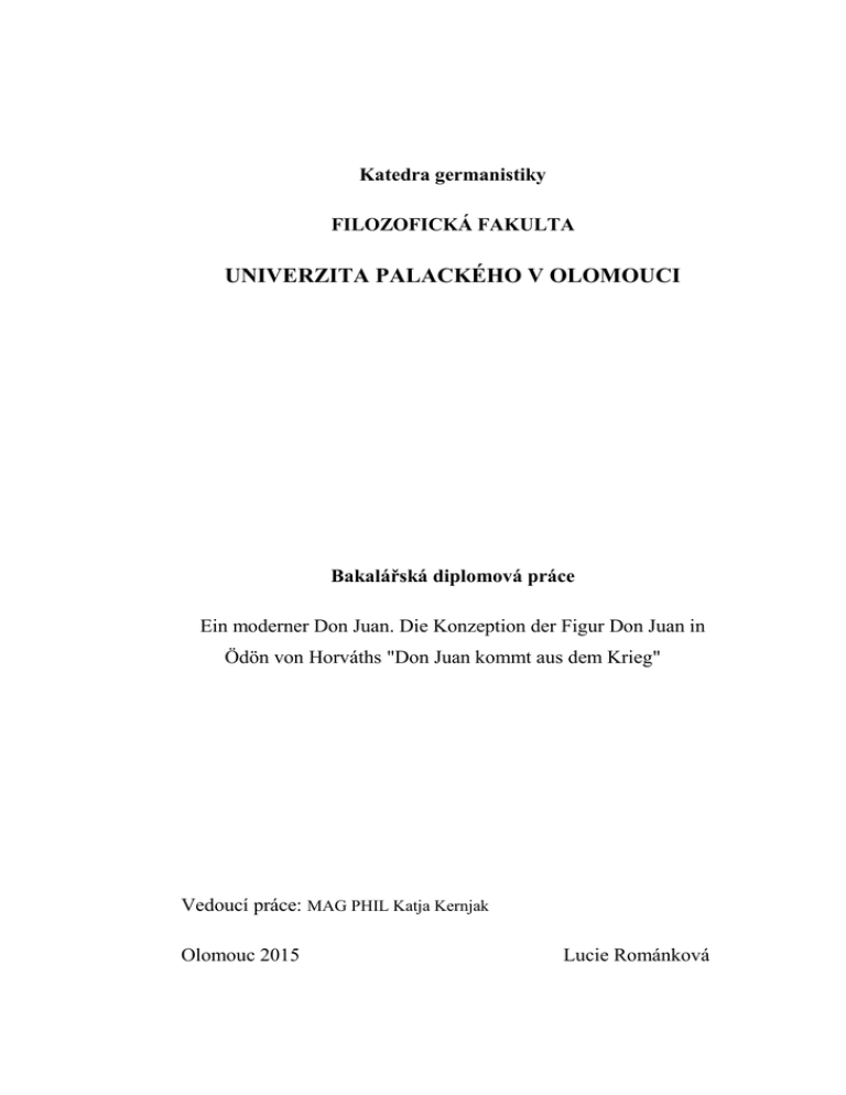 Katedra germanistiky FILOZOFICKÁ FAKULTA UNIVERZITA PALACKÉHO V OLOMOUCI Bakalářská diplomová práce Ein moderner Don Juan. Die Konzeption der Figur Don Juan in Ödön von Horváths "Don Juan kommt aus dem Krieg" Vedoucí práce: MAG PHIL Katja Kernjak Olomouc 2015 Lucie Románková Prohlašuji, že jsem diplomovou práci vypracovala samostatně a uvedla v ní předepsaným způsobem všechny použité prameny a literaturu. V Olomouci dne ………….. Poděkování Zde chci poděkovat MAG PHIL Katji Kernjak za vedení bakalářské práce, nasměrování a velkou míru trpělivosti. INHALTSVERZEICHNIS Obsah INHALTSVERZEICHNIS ................................................................................. 4 1 EINLEITUNG ................................................................................................. 5 2 TRADITIONELLE AUFFASUNG DER DON JUAN FIGUR ...................... 6 2.1 Die Entstehung Don Juans als literarische Figur ...................................... 6 2.2 Die Handlung : El Burlador de Sevilla y Convidado de Piedra ............... 7 2.3 Die charakteristische Merkmale Don Juans ............................................. 8 von Tirso de Molina ....................................................................................... 8 2.3.1 Don Juans Attraktivität ..................................................................... 8 2.3.2 Don Juans Mittel der Verführung ................................................... 12 2.4 Typische Merkmale der Zeit in der spanischen Literatur ....................... 15 3 WEITERE FASSUNGEN............................................................................. 17 3.1 Don Juan Fassung von Molière .............................................................. 18 3.2 Don Juan Fassung von Da Ponte/Mozart ............................................... 19 3.3 Andere Versionen ................................................................................... 20 4 ÖDÖN HORVÁTH, SEINE ZEIT UND DIE DON JUAN FASSUNG ...... 22 4.1 Hotváths Leben ....................................................................................... 22 4.2 Horváths Schaffen im Kontext seiner Zeit ............................................. 23 4.3 Don Juan kommt aus dem Krieg ............................................................ 24 4.4 Handlung ................................................................................................ 25 4.4.1 Erster Akt: Der Krieg ist aus ........................................................... 26 4.4.2 Zweiter Akt: Im Taumel der Inflation ............................................. 26 4.4.3 Dritter Akt: Der Schneemann.......................................................... 27 5 DIE KONZEPTION DER FIGUR DON JUAN VON HORVÁTH ............. 28 5.1 Don Juan als Verführer ........................................................................... 28 5.2 Don Juans Attraktivität ........................................................................... 31 5.3 Don Juans Beziehung zu den Frauen ..................................................... 33 5.4 Don Juans Ideal ...................................................................................... 36 5.5 Ehre ........................................................................................................ 40 5.6 Don Juan als Frevler ............................................................................... 43 5.7 Don Juans Gewissen ............................................................................... 44 6 SCHLUSSFOLGERUNGEN ........................................................................ 46 7 RESUMÉ ...................................................................................................... 48 8 LITERATURVERZEICHNIS ...................................................................... 50 9 ANOTACE .................................................................................................... 52 1 EINLEITUNG Wie schon der Name des Helden im Titel des Werkes vorsagt, die Hauptfigur weist auf die lange Tradition des Don Juan Stoffes an. Das Ziel dieser Arbeit ist, die Konzeption dieser Figur zu definieren. Dementsprechend kann man nicht vermeiden, die Don Juan Fassungen zu erwähnen, die die Schöpfung der allgemein bekannten literarischen Figur bestimmten. Aus diesem Grund beinhaltet die Arbeit die Konzeption der Figur Don Juan von Tirso de Molinas Werk El burlador de Sevilla y convivado de piedra, die die erste bekannte Don Juan Fassung ist. Weiter werden andere Fassungen erwähnt, die zum Bildung des Don Juan Fassung, von Einigen als „Don Juan Mythos“ bezeichnet, beigetragen haben. Diese im gewissen Maß abgeschlossene Darstellung der Figur wird in der Arbeit als „klassisch“ bezeichnet. Ähnlich wird auch über der „klassischen Fassung“ gesprochen. In den weitern Kapitolen wird sich die Arbeit mit dem Werk Don Juan kommt aus dem Krieg von Tirso de Molina beschäftigen. Die Konzeption der Figur wird durch Vergleich mit der „klassischen Fassung“ bestimmt. Zu diesem Zweck werde ich die Figur in den Kontexten analysieren, die für die Figur typisch sind. Es geht zum Beispiel um die Darstellung Don Juans als Verführer oder Frevler, die Ehre und die Beziehung zu den Frauen. 5 2 TRADITIONELLE AUFFASUNG DER DON JUAN FIGUR Eher ich über Figur Don Juan von dem Werk von Horváth sprechen werde, es ist nötig sich mit der Entstehung der Don Juan Figur allgemein zu beschäftigen, ebenso wie mit den Zügen, die für die Figur charakteristisch sind, weil, wie bekannt, Horváths Werk ist nicht das erste Werk, wo wir uns mit Don Juan Figur begegnen. Don Juan Figur hat eine lange Tradition und man kann sagen, die Figur ist unter den Schriftstellern beliebt. Im Vergleich zur ersten Fassung variieren seine Eigenschaften und Züge, aber seine Substanz, die ihn unverwechselbar macht und die für ihn kennzeichnend ist, bleibt. Man kann die Figur im Horváths Drama nicht untersuchen 