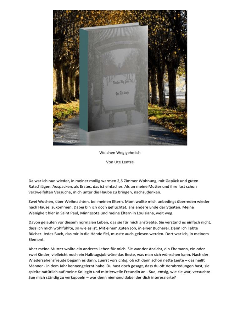 Welchen Weg gehe ich Von Ute Lentze Da war ich nun wieder, in meiner mollig warmen 2,5 Zimmer Wohnung, mit Gepäck und guten Ratschlägen. Auspacken, als Erstes, das ist einfacher. Als an meine Mutter und ihre fast schon verzweifelten Versuche, mich unter die Haube zu bringen, nachzudenken. Zwei Wochen, über Weihnachten, bei meinen Eltern. Mom wollte mich unbedingt überreden wieder nach Hause, zukommen. Dabei bin ich doch geflüchtet, ans andere Ende der Staaten. Meine Wenigkeit hier in Saint Paul, Minnesota und meine Eltern in Louisiana, weit weg. Davon gelaufen vor diesem normalen Leben, das sie für mich anstrebte. Sie verstand es einfach nicht, dass ich mich wohlfühlte, so wie es ist. Mit einem guten Job, in einer Bücherei. Denn ich liebte Bücher. Jedes Buch, das mir in die Hände fiel, musste auch gelesen werden. Dort war ich, in meinem Element. Aber meine Mutter wollte ein anderes Leben für mich. Sie war der Ansicht, ein Ehemann, ein oder zwei Kinder, vielleicht noch ein Halbtagsjob wäre das Beste, was man sich wünschen kann. Nach der Wiedersehensfreude begann es dann, zuerst vorsichtig, ob ich denn schon nette Leute – das heißt Männer - in dem Jahr kennengelernt habe. Du hast doch gesagt, dass du oft Verabredungen hast, sie spielte natürlich auf meine Kollegin und mittlerweile Freundin an - Sue, emsig, wie sie war, versuchte Sue mich ständig zu verkuppeln – war denn niemand dabei der dich interessierte? Wie gesagt, zuerst vorsichtig, aber im Lauf der zweiten Woche wurde sie immer drängender „Claire Garret du wirst 25 Jahre! Einmal musst du dich für einen Mann entscheiden, du kannst nicht dein ganzes Leben, mit deinen Büchern verbringen.“ Da war es also, die alt bekannten Worte. Ich weiß nicht, wie oft der Versuch fehlschlug, es meiner Mutter begreiflich zu machen. Für mich bestand keineswegs das Verlangen nach einer Beziehung, an erster Stelle. Das war schon immer so, weder in meiner Highschool Zeit, noch später im College. Während meine Freundinnen sich immer wieder frisch verliebten und neue Flammen sammelten, konnte ich mich mit ihren Freunden und Abgelegten stundenlang unterhalten. Es war nicht einer dabei, der mir Herzklopfen bereitete und genauso sahen es die Jungs – du bist ein echt netter Kumpel. Ich vermisste und vermisse dieses ganze Beziehungsdrama nicht, doch Mom war da nun mal anderer Ansicht. Deshalb bin ich geflohen und habe mir ein Leben aufgebaut mit meinen Büchern, meiner Arbeit. Kopfschüttelnd die Gedanken an meine Mom verbannend, nahm ich das Telefon, um Molly die stellvertretende Leiterin, anzurufen. Kaum erwartend übermorgen wieder arbeiten, zu können. „Hallo Molly ich bin´s …“ „Oh, Claire gut das Du anrufst. Bist du schon zu Hause? Denn du musst morgen schon kommen. Sue hat sich gestern krankgemeldet, tut mir leid deinen letzten Urlaubstag zu vermiesen, aber ich schaffe es allein einfach nicht.“ Entschuldigte sich Molly wortreich. „Kein Problem, was hat Sue denn?“ Wollte ich wissen. „Grippe, sie hörte sich wirklich schlimm an. Ich dank dir, bis morgen.“ Eilig beendete Molly das Gespräch. So wie Molly sich anhörte, stand sie unter Druck. Bestimmt einiges zu tun! Der kurze Blick auf die Uhr verriet mir, es lohnte sich keineswegs, Molly jetzt noch zu zur Hand gehen. Also dann morgen. Schön! Für mich hieß das einen Tag früher anfangen. Jetzt aber noch einmal raus und einkaufen. Denn den Rest der Woche würde ich bestimmt nicht mehr dazu kommen. Warm eingewickelt, denn es war draußen eisig machte ich mich auf den Weg. Zum Glück lag der Supermarkt gleich um die Ecke und nahm mir vor, diesmal nicht zu schlendern. Ein paar Schnellgerichte und einige Snacks für zwischendurch, ab in den Einkaufswagen damit. Denn ohne Sue wurden die Mittagspausen in der Bücherei verlegt. Allein ein Cafe oder Imbiss zu besuchen, kam keinesfalls infrage. Unter vielen Menschen fühlte ich mich immer allein, geradezu verlassen. Was noch? Über die Regale schauend, sollten ein paar Vitamine genau das richtige sein. Machte kehrt und Wums …, rammte in jemanden hinein. Direkt hinter mir musste jemand gestanden haben. „Entschuldigen Sie bitte, ich habe sie nicht gesehen“, stammelnd und gänzlich erschrocken, so etwas war mir noch nie passiert. Total fassungslos starrten mich die grünsten Augen, die ich je gesehen habe, an. „Das nächste Mal passen sie aber besser auf!“ Wurde ich unverschämt angefaucht. „Darauf können sie sich verlassen!“ erwiderte ich, jetzt wütend! Was bildete der sich ein! Steht direkt hinter mir und wundert sich, wenn er angerempelt wird. So ein eingebildeter Schnösel! Hochnäsig ging ich an ihm vorbei, was du kannst, kann ich schon lange. Aber anstatt sich wegen seines Benehmens zu schämen, fing der Typ an zu lachen. An der Kasse hallte das Lachen des Schnösels noch immer in meinen Ohren nach. Sauer auf mich, wegen solch einer Lappalie, die gute Laune zu verlieren. Vergiss es! Freu dich lieber, morgen gehst du wieder arbeiten munterte ich mich selbst auf und bezahlte meinen Einkauf. Da stand er ja! Direkt am Ausgang, als ob er auf mich warten würde. Mit einem hintergründigen Gesichtsausdruck verfolgte er jede meiner Bewegungen. Mit Herzklopfen verstaute ich meine Einkäufe und verließ den Markt, ohne diesem Herrn weitere Beachtung zu schenken. Abgehetzt kam ich zu meiner Wohnung, mit dem untrüglichen Gefühl verfolgt, zu werden. Als ob ein grünes Augenpaar mich ständig beobachtete. Langsam schüttelte ich diesen Eindruck ab und machte es mir bequem, nach zwei Wochen endlich daheim. Zitternd vor Kälte betrat ich am nächsten Morgen, durch einen Nebeneingang speziell für Angestellte, die Bücherei. Molly stellte mir ohne Kommentar einen heißen Kaffee auf den Tisch. Während ich mich, von meinem Schal, Handschuhen, Mütze und Jacke befreite, erzählte sie schon die Neuigkeiten der letzten vierzehn Tage. Es war ein warmes behagliches Gefühl wieder hier zu sein. Der Duft der Bücher, di