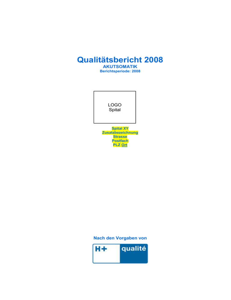 Qualitätsbericht 2008 AKUTSOMATIK Berichtsperiode: 2008 LOGO Spital Spital XY Zusatzbezeichnung Strasse Postfach PLZ Ort Nach den Vorgaben von 1 Inhaltsverzeichnis 1 2 3 Inhaltsverzeichnis .................................................................................................................................... 2 Einleitung ................................................................................................................................................. 3 Q-Organisation des Spitals im Überblick ................................................................................................. 4 3.1 Kontaktangaben .............................................................................................................................. 4 3.2 Qualitätsverantwortliche / Q-Team ................................................................................................. 4 3.3 Organisatorische Einbindung des Qualitätsmanagements im Spital .............................................. 4 4 Kennzahlen .............................................................................................................................................. 5 4.1 Versorgungsstufe ............................................................................................................................ 5 4.2 Personalressourcen ........................................................................................................................ 5 4.3 Fallzahlen ........................................................................................................................................ 5 4.4 Weitere Leistungskennzahlen ......................................................................................................... 6 4.5 Top Ten-Diagnose stationär............................................................................................................ 6 4.6 Top Ten- Eingriffe ........................................................................................................................... 7 4.7 Altersstatistik ................................................................................................................................... 7 4.8 Kennzahlen zur Einschätzung des Patientenkollektives ................................................................. 8 4.9 Mortalitätszahlen ............................................................................................................................. 8 4.9.1 Spitaleigene Mortalitätserhebung ........................................................................................... 8 4.9.2 Mortalitätszahlen BAG / Helios ............................................................................................... 8 4.9.3 Umgang mit Todesfällen im Spital .......................................................................................... 8 5 Zufriedenheitsmessungen ....................................................................................................................... 9 5.1 Patientenzufriedenheit PEQ Kurzfragebogen ................................................................................. 9 5.1.1 Gesamtzufriedenheitsmessung .............................................................................................. 9 5.1.2 Detaillierter Ausweis ............................................................................................................... 9 5.2 Andere Patientenzufriedenheits-Messprogramme ......................................................................... 9 5.3 Mitarbeiterzufriedenheit ................................................................................................................. 10 5.4 Zuweiserzufriedenheit ................................................................................................................... 10 6 Qualitätsindikatoren ............................................................................................................................... 11 6.1 Rehospitalisation (Wiedereintritte) ................................................................................................ 11 6.1.1 Potentiell vermeidbare Rehospitalisationsrate innert 30 Tagen, mit SQLape ..................... 11 6.1.2 Beteiligung an anderen Messprogrammen zum Thema Rehospitalisation.......................... 11 6.2 Infektionen ..................................................................................................................................... 11 6.2.1 Postoperative Wundinfekte nach Swiss Noso / IVQ ............................................................ 11 6.2.2 Beteiligung an anderen Infektions-Messprogrammen.......................................................... 12 6.2.3 Präventionsmassnahmen ..................................................................................................... 12 6.3 Komplikationen .............................................................................................................................. 12 6.3.1 Beteiligung an Messprogrammen ......................................................................................... 12 6.3.2 Präventionsmassnahmen ..................................................................................................... 12 6.4 Pflegeindikator „Stürze“ ................................................................................................................. 13 6.4.1 Beteiligung an Messprogrammen ......................................................................................... 13 6.4.2 Präventionsmassnahmen ..................................................................................................... 13 6.5 Pflegeindikator „Dekubitus“ (Wundliegen) .................................................................................... 14 6.5.1 Beteiligung an anderen Messprogrammen .......................................................................... 14 6.5.2 Präventionsmassnahm
