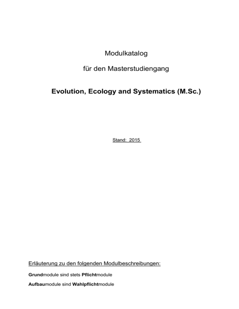 Modulkatalog für den Masterstudiengang Evolution, Ecology and Systematics (M.Sc.) Stand: 2015 Erläuterung zu den folgenden Modulbeschreibungen: Grundmodule sind stets Pflichtmodule Aufbaumodule sind Wahlpflichtmodule Evolution Modulnummer Modultitel MEES. E 1 Evolutionstheorie Modul-Verantwortlicher Voraussetzung für die Zulassung zum Modul Verwendbarkeit (Voraussetzung für) Art des Moduls (Grundmodul, Aufbaumodul) Häufigkeit des Angebots (Zyklus) Dauer des Moduls Zusammensetzung des Moduls / Lehrformen (V, Ü, S, P, E) Fischer keine Leistungspunkte (ECTS credits) 10 LP Arbeitsaufwand (work load in h): – Präsenzstunden – Selbststudium (einschl. Prüfungsvorbereitung) Inhalte Lern- und Qualifikationsziele Voraussetzungen für die Zulassung zur Modulprüfung Voraussetzung für die Vergabe von Leistungspunkten; Prüfungsleistungen (Notengewichtung in %) Zulassung zum Modul MEES. T 1 Grundmodul jährlich 2 Semester (WS, SS) S: 6 SWS – 90 h Präsenz – 210 h Selbststudium Das Modul vermittelt und vertieft die Kenntnisse über evolutionäre Muster und die Evolutionsfaktoren. Es behandelt Makroevolution, Artbildung, Biogeographie sowie die wissenschaftliche Einordnung und Interpretation von Fossilen. Auch die gesellschaftliche Bedeutung der Evolutionsbiologie wird behandelt. Die Seminare vermitteln einen Einblick in die historische Entwicklung der Evolutionsbiologie und führen in die klassischen Werke bedeutender Evolutionsbiologen (z.B. Darwin, Wallace, Vertreter der "Modern Synthesis") ein. Überblick über die moderne Evolutionstheorie und deren historische Entwicklung; Einordnung von klassischen Werken der Evolutionsbiologie in das heutige Theoriegebäude; fachlich fundierte Argumentation in der gesellschaftlichen Diskussion der Evolutionsbiologie; Präsentation und Diskussion von wissenschaftlichen Ausarbeitungen; verbesserte Vortragstechnik und Präsentationsmethodik aktive Teilnahme an allen Modulveranstaltungen, drei Seminarvorträge (jeweils 1/3 der Note) Modulnummer Modultitel MEES. E 2 Evolutionäre Biologie Modul-Verantwortlicher Voraussetzung für die Zulassung zum Modul Verwendbarkeit (Voraussetzung für) Art des Moduls (Grundmodul, Aufbaumodul) Häufigkeit des Angebots (Zyklus) Dauer des Moduls Zusammensetzung des Moduls / Lehrformen (V, Ü, S, P, E) Halle keine Leistungspunkte (ECTS credits) Arbeitsaufwand (work load in h): – Präsenzstunden – Selbststudium (einschl. Prüfungsvorbereitung) Inhalte Lern- und Qualifikationsziele Voraussetzungen für die Zulassung zur Modulprüfung Voraussetzung für die Vergabe von Leistungspunkten; Prüfungsleistungen (Notengewichtung in %) Zulassung zum Modul MEES. T 1 Grundmodul jährlich 2 Semester (WS, SS) V: 1 SWS V/S: 3 SWS S: 4 SWS 10 LP – 120 h Präsenz – 180 h Selbststudium Im Zentrum des Moduls steht die fachübergreifende Sichtweise von evolutionären Prozessen auf den Gebieten Pflanzenbiogeographie, Ökologie und Tierverhalten. Es vermittelt damit die enge Verbindung zwischen Evolution und Ökologie. Unter dem Aspekt der Phylogeographie werden die Ausbreitungsbiologie der Pflanzen und Pflanzenareale als Ausdruck evolutionärer Prozesse erschlossen. Die Evolution des Tierverhaltens thematisiert die adaptive FitnessOptimierung. Im Oberseminar werden aktuelle evolutionäre Fragestellungen anhand von Originalarbeiten aus den drei Fachgebieten Spezielle Zoologie, Biodiversität und Evolution der Pflanzen und Ökologie vertieft. fachübergreifende Sichtweise evolutiver Prozesse und des Zusammenhangs zwischen evolutiven Mechanismen und Musterbildung; tiefergehendes und von der Organismengruppe unabhängiges Verständnis der grundlegenden Mechanismen der Evolution; Analyse und Verbesserung des persönlichen Vortragsstils; Fähigkeit zum kritischen Lesen und zur Interpretation von wissenschaftlichen Originalarbeiten; Übersicht über aktuelle Fragestellungen der Evolutionsbiologie; wissenschaftliche Diskussionsfähigkeit auf hohem fachlichen Niveau aktive Teilnahme an allen Modulveranstaltungen Klausur zur Vorlesung Evolutionäre Ökologie (50%); Beitrag zum Oberseminar Evolutionäre Biologie (50%); Leistungsnachweis zu den Seminaren Biogeographie der Pflanzen und Verhaltensökologie Modulnummer Modultitel MEES. E 3 Populationsgenetik Modul-Verantwortlicher Voraussetzung für die Zulassung zum Modul Verwendbarkeit (Voraussetzung für) Art des Moduls (Grundmodul, Aufbaumodul) Häufigkeit des Angebots (Zyklus) Dauer des Moduls Zusammensetzung des Moduls / Lehrformen (V, Ü, S, P, E) Heckel Belegung der Module MEES. E 1 und E 2 Leistungspunkte (ECTS credits) 5 LP Arbeitsaufwand (work load in h): – Präsenzstunden – Selbststudium (einschl. Prüfungsvorbereitung) Inhalte Lern- und Qualifikationsziele Voraussetzungen für die Zulassung zur Modulprüfung Voraussetzung für die Vergabe von Leistungspunkten; Prüfungsleistungen (Notengewichtung in %) Zulassung zum Modul MEES. T 1 in Fachrichtungen Spezielle Zoologie und Ökologie Aufbaumodul den jährlich 2 Semester (WS, SS) V: 4 SWS – 60 h Präsenz – 90 h Selbststudium Das Modul führt in theoretische und empirische Populationsgenetik mit Hilfe klassischer und genomischer Techniken ein. Behandelte Aspekte sind u.a. Methoden zur Messung und Analyse genetischer Variation in natürlichen Populationen sowie die Wechselwirkungen zwischen natürlicher Selektion, Mutation, Paarungssystemen, genetischer Drift und Rekombination, die die evolutionären Änderungen von Allelfrequenzen verursachen. Weitere Themen sind die molekulare Evolution von Protein- und DNASequenzen, die QTL-Analyse von quantitativen Merkmalen, vergleichende Genomik von Pro- und Eukaryoten. Mechanismen der Artbildung, Verwandtenselektion und inklusive Fitness, die Evolution von Altruismus, Evolution der sexuellen Fortpflanzung und des Geschlechterverhältnisses, Genetik und die Erhaltung von Arten sowie die Populationsgenetik und die Evolution des modernen Menschen. Erwerb grundlegender Kenntnisse der Populatio