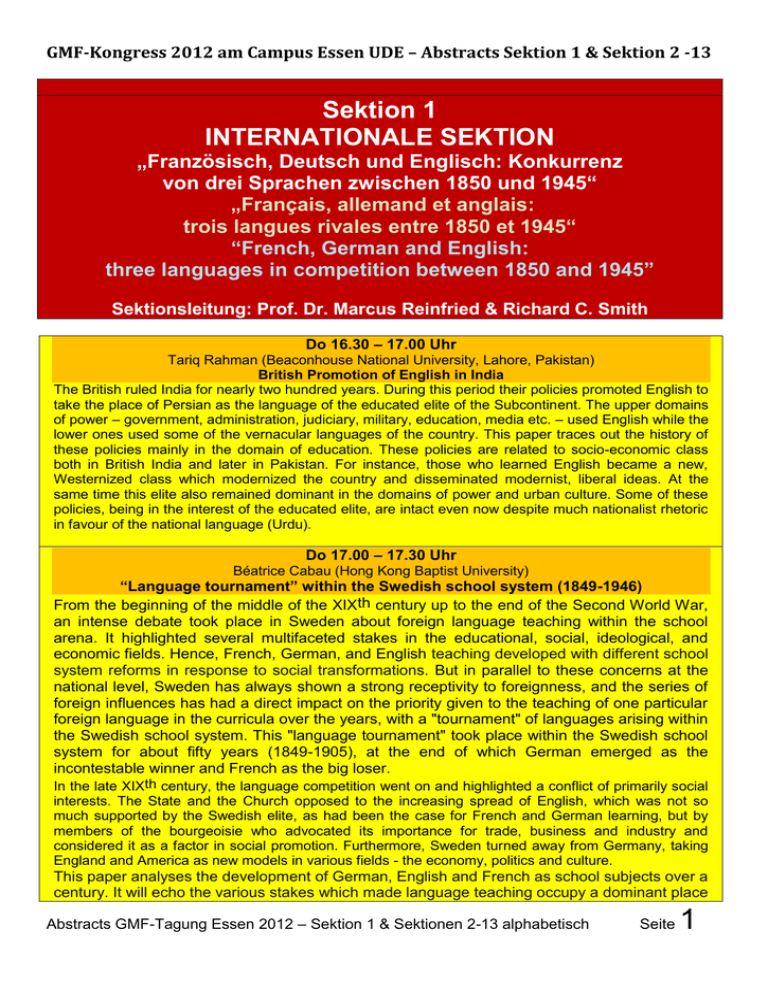 GMF-Kongress 2012 am Campus Essen UDE – Abstracts Sektion 1 & Sektion 2 -13 Sektion 1 INTERNATIONALE SEKTION „Französisch, Deutsch und Englisch: Konkurrenz von drei Sprachen zwischen 1850 und 1945“ „Français, allemand et anglais: trois langues rivales entre 1850 et 1945“ “French, German and English: three languages in competition between 1850 and 1945” Sektionsleitung: Prof. Dr. Marcus Reinfried & Richard C. Smith Do 16.30 – 17.00 Uhr Tariq Rahman (Beaconhouse National University, Lahore, Pakistan) British Promotion of English in India The British ruled India for nearly two hundred years. During this period their policies promoted English to take the place of Persian as the language of the educated elite of the Subcontinent. The upper domains of power – government, administration, judiciary, military, education, media etc. – used English while the lower ones used some of the vernacular languages of the country. This paper traces out the history of these policies mainly in the domain of education. These policies are related to socio-economic class both in British India and later in Pakistan. For instance, those who learned English became a new, Westernized class which modernized the country and disseminated modernist, liberal ideas. At the same time this elite also remained dominant in the domains of power and urban culture. Some of these policies, being in the interest of the educated elite, are intact even now despite much nationalist rhetoric in favour of the national language (Urdu). Do 17.00 – 17.30 Uhr Béatrice Cabau (Hong Kong Baptist University) “Language tournament” within the Swedish school system (1849-1946) From the beginning of the middle of the XIXth century up to the end of the Second World War, an intense debate took place in Sweden about foreign language teaching within the school arena. It highlighted several multifaceted stakes in the educational, social, ideological, and economic fields. Hence, French, German, and English teaching developed with different school system reforms in response to social transformations. But in parallel to these concerns at the national level, Sweden has always shown a strong receptivity to foreignness, and the series of foreign influences has had a direct impact on the priority given to the teaching of one particular foreign language in the curricula over the years, with a "tournament" of languages arising within the Swedish school system. This "language tournament" took place within the Swedish school system for about fifty years (1849-1905), at the end of which German emerged as the incontestable winner and French as the big loser. In the late XIXth century, the language competition went on and highlighted a conflict of primarily social interests. The State and the Church opposed to the increasing spread of English, which was not so much supported by the Swedish elite, as had been the case for French and German learning, but by members of the bourgeoisie who advocated its importance for trade, business and industry and considered it as a factor in social promotion. Furthermore, Sweden turned away from Germany, taking England and America as new models in various fields - the economy, politics and culture. This paper analyses the development of German, English and French as school subjects over a century. It will echo the various stakes which made language teaching occupy a dominant place Abstracts GMF-Tagung Essen 2012 – Sektion 1 & Sektionen 2-13 alphabetisch Seite 1 in the Swedish school system from the mid-XIXth century. It will focus on the position and role of language teaching in the transformation from an elitist education into a democratic school infrastructure after World War II. Do 17.45 – 18.15 Uhr Nicola McLelland (University of Nottingham) German and French in competition in British schools (1850-1945) This paper will trace the uneasy relationship between French and German in British schools from the 1850s, when these languages were first included in public examinations, to 1945. Teachers of French and German (who were often the same people in any case) banded together to make the case for “modern languages” against Classics, and shared ideas about teaching practice in the Modern Languages Association, but they were also inevitably competing for the same learners in a crowded school curriculum. At some points, German seemed in the ascendancy, as when the national importance of trade with, or in competition with, Germany was recognized, or when the case was made for German to become the first foreign language in some regions at least. At other times – especially in the first two decades of the twentieth century – there was genuine anxiety that German might not have a future in schools at all. The 1930s saw a renewed upswing in the popularity of German alongside French. The considerable inertia in the system – French teachers were easier to find, so French would continue to be taught first – has resonance for formulating educational policy today. The paper draws on a range of primary materials, including published discussions in Modern Language Association’s journal, archives of examinations and syllabi, and textbooks, and is part of a larger project on the history of German teaching and learning in the UK, funded by the UK’s Arts and Humanities Research Council, German Through English Eyes. Do 18.15 – 18.45 Uhr Sabine Doff (Universität Bremen) English and/or French at Higher Schools for Girls (1870-1900) in Germany: Contrast, Complement or Cooperation? This paper focuses on the salient role which English as a school subject (and its specific didactic profile) played in the process of establishing a state system of higher education for girls in Germany during the last third of the 19th century. Distinct contents for female learners often went hand in hand with a specific methodological design which partly matched and partly contrasted the standards developed in French, the subj
