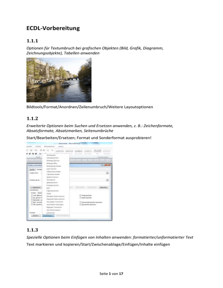 ECDL-Vorbereitung 1.1.1 Optionen für Textumbruch bei grafischen Objekten (Bild, Grafik, Diagramm, Zeichnungsobjekte), Tabellen anwenden Bildtools/Format/Anordnen/Zeilenumbruch/Weitere Layoutoptionen 1.1.2 Erweiterte Optionen beim Suchen und Ersetzen anwenden, z. B.: Zeichenformate, Absatzformate, Absatzmarken, Seitenumbrüche Start/Bearbeiten/Ersetzen; Format und Sonderformat ausprobieren! 1.1.3 Spezielle Optionen beim Einfügen von Inhalten anwenden: formatierter/unformatierter Text Text markieren und kopieren/Start/Zwischenablage/Einfügen/Inhalte einfügen Seite 1 von 17 Vorbereitung ECDL 1.2.1 Zeilenabstände in Absätzen festlegen: Mindestens, Genau, Mehrfach 1.2.2 Optionen zum Zeilen- und Seitenumbruch in Absätzen anwenden, entfernen Seite 2 von 17 Vorbereitung ECDL 1.2.3 In Listen mit mehreren Ebenen Optionen zur Gliederung, Nummerierung anwenden, ändern 1.3.1 Zeichenformatvorlage erstellen, ändern, aktualisieren Zeichenformatvorlagen werden durch ein „a“ gekennzeichnet! Seite 3 von 17 Vorbereitung ECDL 1.3.2 Absatzformatvorlage erstellen, ändern, aktualisieren 1.4.1 Mehrspaltensatz anwenden; Anzahl der Spalten im Spaltensatz ändern Text markieren/Seitenlayout/Seite einrichten/Spalten 1.4.2 Breite und Abstand der Spalten ändern; Zwischenlinien einfügen, entfernen Text markieren/Seitenlayout/Seite einrichten/Spalten/Weitere Spalten/ Seite 4 von 17 Vorbereitung ECDL 1.4.3 Spaltenumbruch einfügen, löschen Einfügen: Seitenlayout/Seite einrichten/Umbrüche Löschen: Spaltenumbruch markieren und Entf drücken 1.5.1 Tabellenformatvorlagen anwenden Tabelle einfügen/Tabellentools/Entwurf/Tabellenformatvorlagen 1.5.2 Zellen in einer Tabelle verbinden, teilen Tabelle einfügen/Tabellentools/Layout/Zusammenführen 1.5.3 Zellenbegrenzung, Ausrichtung und Textrichtung anpassen Tabelle einfügen/Tabellentools/Layout/Ausrichtung 1.5.4 Überschriftenzeile auf jeder Seite automatisch wiederholen Tabelle einfügen/Überschrift eingeben in Zelle A1 (vorher A1 und A2 verbinden)/Zeilen bis auf die 2. Seite ausweiten/Tabellentools/Layout/Daten/Überschriften wiederholen Seite 5 von 17 Vorbereitung ECDL 1.5.5 Seitenumbruch in Zeilen zulassen, nicht zulassen Wenn man diese Option aktiviert, erfolgt innerhalb einer Zelle auch ein Seitenumbruch (wenn sich der Text nicht anders ausgeht). Ist diese Option deaktiviert, beginnt die gesamte Zeile auf der nächsten Seite. 1.5.6 Sortieren nach einer Spalte, nach mehr als einer Spalte Tabelle einfügen/Tabellentools/Layout/Daten/Sortieren C A B 1.5.7 Mit Trennzeichen getrennten Text in eine Tabelle umwandeln Text eingeben mit Enter oder Komma usw./Text markieren/Einfügen/Tabellen/Tabelle/Text in Tabelle umwandeln A B C 1.5.8 Tabelle in Text umwandeln Tabelle markieren/Tabellentools/Layout/Daten/In Text konvertieren A B C Seite 6 von 17 Vorbereitung ECDL 2.1.1 Beschriftung unter/über einem grafischen Objekt, einer Tabelle einfügen Objekt markieren/Verweise/Beschriftungen/Beschriftung einfügen – Beschriftung, Bezeichnung, Position, … beachten 2.1.2 Bezeichnung für Beschriftung hinzufügen, entfernen Objekt markieren/Verweise/Beschriftungen/Beschriftung einfügen – Bezeichnung nicht in der Beschriftung verwenden 2.1.3 Format für Nummerierung der Beschriftung ändern Objekt markieren/Verweise/Beschriftungen/Beschriftung einfügen/Nummerierung/Format auswählen Seite 7 von 17 Vorbereitung ECDL 2.1.4 Fuß- und Endnoten einfügen, bearbeiten Verweise/Fußnoten/Fußnote einfügen bzw. Endnote einfügen 2.1.5 Fußnote in Endnote umwandeln; Endnote in Fußnote umwandeln Fuß- oder Endnote einfügen/Fuß- oder Endnotenzeichen „unten“ – das heißt, nicht im Text selbst markieren/Kontextmenü (rechte Maustaste)/In Endnoten umwandeln – oder umgekehrt! 2.2.1 Inhaltsverzeichnis basierend auf bestimmten Überschriften oder anderen Formatvorlagen erstellen, aktualisieren Formatvorlagen vergeben/Verweise/Inhaltsverzeichnis/Inhaltsverzeichnis/Inhaltsverzeichnis einfügen/Optionen … Wenn man im Dokument andere Formatvorlagen (z. B. eigene Formatvorlagen) verwendet hat, wählt man die Schaltfläche Optionen, löscht 1/2/3 bei Überschrift 1/2/3 und vergibt die Ebenen bei den eigenen verwendeteten Formatvorlagen. Aktualisieren mit F9 2.2.2 Abbildungsverzeichnis auf Basis von Formatvorlagen erstellen, aktualisieren Abbildungen beschriften/Verweise/Beschriftungen/Abbildungsverzeichnis einfügen Aktualisieren mit F9 2.2.3 Indexeintrag (Haupteintrag, Untereintrag) festlegen, löschen Seite 8 von 17 Vorbereitung ECDL In ein Wort stellen/Verweise/Index/Eintrag festlegen/Haupteintrag oder Untereintrag eingeben/Festlegen/Schließen 2.2.4 Index erstellen, aktualisieren Indexeinträge zuerst festlegen/Verweise/Index/Index einfügen/OK Aktualisieren mit F9 2.3.1 Textmarke hinzufügen und löschen Anzeigen von Textmarken: Datei/Optionen/Erweitert/Dokumentinhalt anzeigen/Textmarken anzeigen Einfügen: Einfügen/Hyperlinks/Textmarke/Textmarkennamen eingeben/Hinzufügen Ansteuern: Einfügen/Hyperlinks/Textmarke/Textmarkennahmen markieren/Gehe zu/Schließen oder mit F5 Löschen: Einfügen/Hyperlinks/Textmarke/Textmarke markieren/Löschen/Schließen 2.3.2 Querverweis zu nummeriertem Element, Überschrift, Textmarke, Abbildung und Tabelle erstellen, löschen Einfügen: Cursor positionieren/offene Klammer einfügen und einen Pfeil von den Sonderzeichen einfügen/Verweise/Beschriftungen/Querverweis/Optionen eingeben/Einfügen/Schließen/Klammer schließen Ansteuern: mit gedrückter Strg-Taste auf den Querverweis klicken – man kommt zur verwiesenen Stelle (Überschrift, Abbildung, Tabelle …) Löschen: Im Text markieren und entfernen 2.3.3 Einem Indexeintrag einen Querverweis hinzufügen Verweise/Index/Eintrag festlegen/Optionen Querverweis 3.1.1 Felder für Autor, Pfad und Dateiname, Dateigröße oder Eingabefeld FILL-IN einfügen, löschen Siehe top office Band 2, Seite 106 bis 108 3.1.2 Formel zur Berechnung einer Summe in einer Tabelle einfügen Tabelle einfügen/