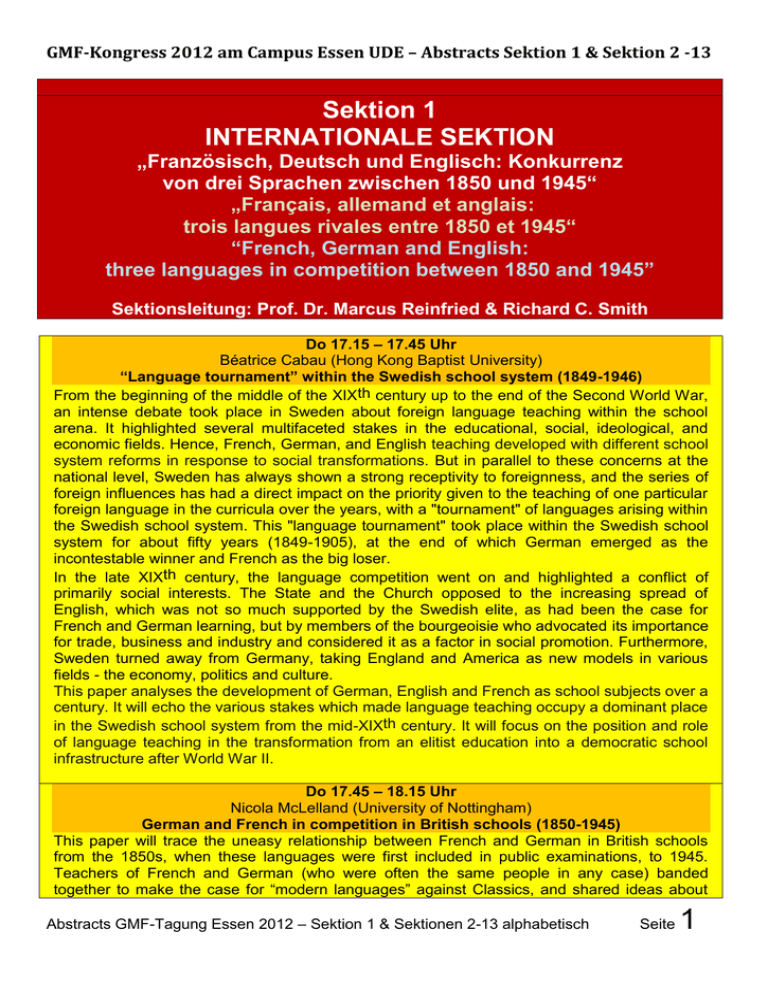 GMF-Kongress 2012 am Campus Essen UDE – Abstracts Sektion 1 & Sektion 2 -13 Sektion 1 INTERNATIONALE SEKTION „Französisch, Deutsch und Englisch: Konkurrenz von drei Sprachen zwischen 1850 und 1945“ „Français, allemand et anglais: trois langues rivales entre 1850 et 1945“ “French, German and English: three languages in competition between 1850 and 1945” Sektionsleitung: Prof. Dr. Marcus Reinfried & Richard C. Smith Do 17.15 – 17.45 Uhr Béatrice Cabau (Hong Kong Baptist University) “Language tournament” within the Swedish school system (1849-1946) From the beginning of the middle of the XIXth century up to the end of the Second World War, an intense debate took place in Sweden about foreign language teaching within the school arena. It highlighted several multifaceted stakes in the educational, social, ideological, and economic fields. Hence, French, German, and English teaching developed with different school system reforms in response to social transformations. But in parallel to these concerns at the national level, Sweden has always shown a strong receptivity to foreignness, and the series of foreign influences has had a direct impact on the priority given to the teaching of one particular foreign language in the curricula over the years, with a "tournament" of languages arising within the Swedish school system. This "language tournament" took place within the Swedish school system for about fifty years (1849-1905), at the end of which German emerged as the incontestable winner and French as the big loser. In the late XIXth century, the language competition went on and highlighted a conflict of primarily social interests. The State and the Church opposed to the increasing spread of English, which was not so much supported by the Swedish elite, as had been the case for French and German learning, but by members of the bourgeoisie who advocated its importance for trade, business and industry and considered it as a factor in social promotion. Furthermore, Sweden turned away from Germany, taking England and America as new models in various fields - the economy, politics and culture. This paper analyses the development of German, English and French as school subjects over a century. It will echo the various stakes which made language teaching occupy a dominant place in the Swedish school system from the mid-XIXth century. It will focus on the position and role of language teaching in the transformation from an elitist education into a democratic school infrastructure after World War II. Do 17.45 – 18.15 Uhr Nicola McLelland (University of Nottingham) German and French in competition in British schools (1850-1945) This paper will trace the uneasy relationship between French and German in British schools from the 1850s, when these languages were first included in public examinations, to 1945. Teachers of French and German (who were often the same people in any case) banded together to make the case for “modern languages” against Classics, and shared ideas about Abstracts GMF-Tagung Essen 2012 – Sektion 1 & Sektionen 2-13 alphabetisch Seite 1 teaching practice in the Modern Languages Association, but they were also inevitably competing for the same learners in a crowded school curriculum. At some points, German seemed in the ascendancy, as when the national importance of trade with, or in competition with, Germany was recognized, or when the case was made for German to become the first foreign language in some regions at least. At other times – especially in the first two decades of the twentieth century – there was genuine anxiety that German might not have a future in schools at all. The 1930s saw a renewed upswing in the popularity of German alongside French. The considerable inertia in the system – French teachers were easier to find, so French would continue to be taught first – has resonance for formulating educational policy today. The paper draws on a range of primary materials, including published discussions in Modern Language Association’s journal, archives of examinations and syllabi, and textbooks, and is part of a larger project on the history of German teaching and learning in the UK, funded by the UK’s Arts and Humanities Research Council, German Through English Eyes. Do 18.00 – 18.30 Uhr Sabine Doff (Universität Bremen) English and/or French at Higher Schools for Girls (1870-1900) in Germany: Contrast, Complement or Cooperation? This paper focuses on the salient role which English as a school subject (and its specific didactic profile) played in the process of establishing a state system of higher education for girls in Germany during the last third of the 19th century. Distinct contents for female learners often went hand in hand with a specific methodological design which partly matched and partly contrasted the standards developed in French, the subject which had so far dominated the field. English soon took over the "pool position" in modern language teaching for girls around the end of the century during the period of the "Neusprachliche Reformbewegung". The paper presents a critical analysis of the approach and design of teaching modern languages (French and in particular English) at higher schools for girls mainly based on articles in contemporary journals and school programs ("Schulprogrammschriften") pertinent to the field. Fr 09.00 – 09.30 Uhr Tim Giesler (Universität Bremen) School languages between economy and politics – the foreign language curriculum at Bremen schools (1850 to 1900) The German school system has a strong federal tradition in which the single German states differ fundamentally. Within Germany, the Hanseatic City of Bremen sets a fine example for economic and political reasons for the introduction of different foreign languages: In the mid19th century, economy had an immediate influence on politics in the trade republic – the senators almost exclusively came from the upper class which again consis