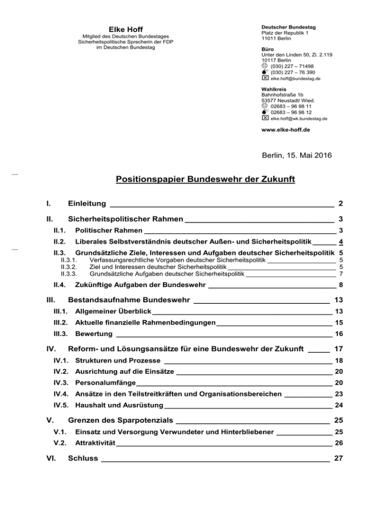 Elke Hoff Mitglied des Deutschen Bundestages Sicherheitspolitische Sprecherin der FDP im Deutschen Bundestag Deutscher Bundestag Platz der Republik 1 11011 Berlin Büro Unter den Linden 50, Zi. 2.119 10117 Berlin (030) 227 – 71498 (030) 227 – 76 390 [email protected] Wahlkreis Bahnhofstraße 1b 53577 Neustadt/ Wied. 02683 – 96 98 11 02683 – 96 98 12 [email protected] www.elke-hoff.de Berlin, 15. Mai 2016 __ Positionspapier Bundeswehr der Zukunft __ I. Einleitung ___________________________________________________ 2 II. Sicherheitspolitischer Rahmen __________________________________ 3 II.1. Politischer Rahmen ________________________________________________ 3 II.2. Liberales Selbstverständnis deutscher Außen- und Sicherheitspolitik ______ 4 II.3. Grundsätzliche Ziele, Interessen und Aufgaben deutscher Sicherheitspolitik 5 II.3.1. II.3.2. II.3.3. II.4. III. Verfassungsrechtliche Vorgaben deutscher Sicherheitspolitik ___________________ 5 Ziel und Interessen deutscher Sicherheitspolitik ______________________________ 5 Grundsätzliche Aufgaben deutscher Sicherheitspolitik _________________________ 7 Zukünftige Aufgaben der Bundeswehr ________________________________ 8 Bestandsaufnahme Bundeswehr _______________________________ 13 III.1. Allgemeiner Überblick _____________________________________________ 13 III.2. Aktuelle finanzielle Rahmenbedingungen _____________________________ 15 III.3. Bewertung ______________________________________________________ 16 IV. Reform- und Lösungsansätze für eine Bundeswehr der Zukunft _____ 17 IV.1. Strukturen und Prozesse __________________________________________ 18 IV.2. Ausrichtung auf die Einsätze _______________________________________ 20 IV.3. Personalumfänge _________________________________________________ 20 IV.4. Ansätze in den Teilstreitkräften und Organisationsbereichen ____________ 23 IV.5. Haushalt und Ausrüstung __________________________________________ 24 V. Grenzen des Sparpotenzials ___________________________________ 25 V.1. Einsatz und Versorgung Verwundeter und Hinterbliebener ______________ 25 V.2. Attraktivität ______________________________________________________ 26 VI. Schluss ____________________________________________________ 27 I. Einleitung Für die FDP-Bundestagsfraktion bleibt die Bundeswehr auch in Zukunft ein wichtiges und unverzichtbares Instrument deutscher Sicherheitspolitik. Wir wollen daher die Leistungsfähigkeit der Bundeswehr sowohl für den Schutz Deutschlands und seiner Bürger als auch für die internationale Krisenvorsorge, Krisenverhütung und Krisenbewältigung erhalten und stärken. Die Bundeswehr benötigt hierfür dringend neue Strukturen, Prozesse und Personalumfänge, die dem Wandel der sicherheitspolitischen Herausforderungen und den nationalen Interessen unseres Landes im 21. Jahrhundert Rechnung tragen. Die FDP hat deshalb nach der erfolgreichen Bundestagswahl 2009 im Koalitionsvertrag den Bundesminister der Verteidigung damit beauftragt, eine Kommission einzusetzen, die bis Ende 2010 einen Vorschlag für die Eckpunkte einer neuen Organisationsstruktur der Bundeswehr inklusive der Straffung der Führungs- und Verwaltungsstrukturen erarbeiten soll. Aufgrund der Notwendigkeit, deutliche Einsparungen schon im Verteidigungshaushalt 2011 vorzunehmen, ist der Bundesminister der Verteidigung gezwungen, einzelne Strukturentscheidungen vorzuziehen und auch Eingriffe in laufende Beschaffungsvorhaben vorzunehmen. Sowohl das aktuelle und das zukünftige Aufgabenspektrum der Bundeswehr als auch die spürbare Reduzierung des Verteidigungsetats in den nächsten vier Jahren zwingt die Bundesregierung zu einer umfassenden Überprüfung der Strukturen und Fähigkeiten der Bundeswehr. Auch wenn die Aufgabendefinition, die sich aus dem Weißbuch des Jahres 2006 und den Verteidigungspolitischen Richtlinien (VPR) aus dem Jahre 2003 ergibt, grundsätzlich aufrechterhalten werden sollte, wird sich die Bundeswehr darauf einrichten müssen, dass sich bestehende Fähigkeitslücken vertiefen und neue entstehen können. Die geplanten Haushaltseinsparungen haben zwingende Auswirkungen auf die zukünftige Personalstärke der Bundeswehr, auf das Stationierungskonzept, auf den deutschen Beitrag zu aktuellen und zukünftigen Beschaffungskooperationen, auf die Verpflichtungen in Auslandseinsätzen (Beendigung UNIFIL, Überführung KFOR in EULEX, Überführung EUFOR Bosnien in EUPM)1, auf den zu leistenden Beitrag Deutschlands zum UN Standby Arrangement, zur NATO Response Force (NRF), zur EU Battle Group (European Headline Goal), zur nationalen Risikovorsorge sowie auf solche Fähigkeiten, die Deutschland gegenüber der NATO und der EU angemeldet hat. Deshalb ist im Rahmen der Ausrüstungsplanung mehr denn je das Wünschenswerte vom Notwendigen zu unterscheiden. Struktur und Ausrüstungsplanung müssen sich konsequent an den wahrscheinlichen Bedrohungen und Einsätzen der Zukunft sowie an Bündnisverpflichtungen orientieren. Diese Rahmenbedingungen können nur 1 United Nations Interim Force in Lebanon = UNIFIL; Kosovo Force = KFOR; Rechtsstaatlichkeitsmission der Europäischen Union im Kosovo = EULEX; European Union Force in Bosnien und Herzegowina = EUFOR; European Union Police Mission = EUPM 2 durch eine politisch zu verantwortende Risikoabwägung und die daraus resultierenden Strukturentscheidungen erstellt werden. Schlagwörter: - Überprüfung des Aufgabenspektrums der Bundeswehr - Ausrichtung der Strukturen, Prozesse und Personalumfänge an Einsatzrealität - Überprüfung des gesamten Personalumfanges - Überprüfung des deutschen Beitrages an aktuellen und zukünftigen internationalen Beschaffungskooperationen - Überprüfung des Stationierungskonzeptes - Überprüfung von Möglichkeiten zur Beendigung oder weiteren Reduzierung der deutschen Beiträge zu aktuellen Auslandseinsätzen - Überprüfung der Möglichkeit zur Finanzierung zukünftiger oder bestehender Auslandseinsätze aus dem allgemeinen Haus