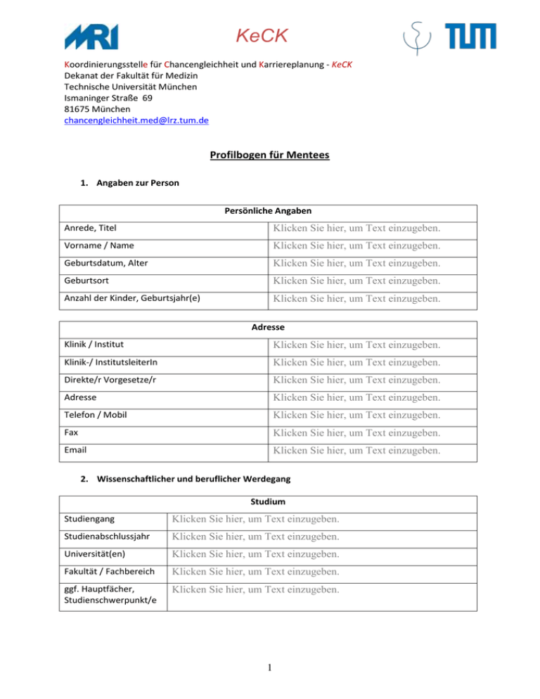 KeCK Koordinierungsstelle für Chancengleichheit und Karriereplanung - KeCK Dekanat der Fakultät für Medizin Technische Universität München Ismaninger Straße 69 81675 München [email protected] Profilbogen für Mentees 1. Angaben zur Person Persönliche Angaben Anrede, Titel Klicken Sie hier, um Text einzugeben. Vorname / Name Klicken Sie hier, um Text einzugeben. Geburtsdatum, Alter Klicken Sie hier, um Text einzugeben. Geburtsort Klicken Sie hier, um Text einzugeben. Anzahl der Kinder, Geburtsjahr(e) Klicken Sie hier, um Text einzugeben. Adresse Klinik / Institut Klicken Sie hier, um Text einzugeben. Klinik-/ InstitutsleiterIn Klicken Sie hier, um Text einzugeben. Direkte/r Vorgesetze/r Klicken Sie hier, um Text einzugeben. Adresse Klicken Sie hier, um Text einzugeben. Telefon / Mobil Klicken Sie hier, um Text einzugeben. Fax Klicken Sie hier, um Text einzugeben. Email Klicken Sie hier, um Text einzugeben. 2. Wissenschaftlicher und beruflicher Werdegang Studium Studiengang Klicken Sie hier, um Text einzugeben. Studienabschlussjahr Klicken Sie hier, um Text einzugeben. Universität(en) Klicken Sie hier, um Text einzugeben. Fakultät / Fachbereich Klicken Sie hier, um Text einzugeben. ggf. Hauptfächer, Studienschwerpunkt/e Klicken Sie hier, um Text einzugeben. 1 Akademische Laufbahn Promotion Dr. Titel (Fach, Jahr) Klicken Sie hier, um Text einzugeben. Note Klicken Sie hier, um Text einzugeben. Institution Klicken Sie hier, um Text einzugeben. Thema Klicken Sie hier, um Text einzugeben. Habilitation Anmeldung erfolgt ☐ Ja,Datum: ☐ Geplant, Datum: Klicken Sie hier, um Text einzugeben. Klicken Sie hier, um Text einzugeben. ☐ Nein Bitte nennen Sie die wichtigsten Stationen Ihres beruflichen Werdegangs Institution Stellenbezeichnung Zeitraum Klicken Sie hier, um Text Klicken Sie hier, um Text Klicken Sie hier, um Text einzugeben. einzugeben. einzugeben. Klicken Sie hier, um Text Klicken Sie hier, um Text Klicken Sie hier, um Text einzugeben. einzugeben. einzugeben. Klicken Sie hier, um Text Klicken Sie hier, um Text Klicken Sie hier, um Text einzugeben. einzugeben. einzugeben. Klicken Sie hier, um Text Klicken Sie hier, um Text Klicken Sie hier, um Text einzugeben. einzugeben. einzugeben. Klicken Sie hier, um Text Klicken Sie hier, um Text Klicken Sie hier, um Text einzugeben. einzugeben. einzugeben. Bitte nennen Sie Ihre bisherigen Auslandsaufenthalte Ort Institution/Funktion Zeitraum Klicken Sie hier, um Text Klicken Sie hier, um Text Klicken Sie hier, um Text einzugeben. einzugeben. einzugeben. Klicken Sie hier, um Text Klicken Sie hier, um Text Klicken Sie hier, um Text einzugeben. einzugeben. einzugeben. Klicken Sie hier, um Text Klicken Sie hier, um Text Klicken Sie hier, um Text einzugeben. einzugeben. einzugeben. Klicken Sie hier, um Text Klicken Sie hier, um Text Klicken Sie hier, um Text einzugeben. einzugeben. einzugeben. 2 Bitte benennen Sie Ihr aktuelles Forschungsthema bzw. Ihr Habilitationsthema Klicken Sie hier, um Text einzugeben. Bitte geben Sie eine kurzen Überblick über Ihre klinische Tätigkeit (falls zutreffend) Klicken Sie hier, um Text einzugeben. Bitte nennen Sie Preise, Stipendien und / oder Auszeichnungen, die Sie erhalten haben Klicken Sie hier, um Text einzugeben. Bitte benennen Sie Forschungsverbände, in die Sie eingebunden sind Klicken Sie hier, um Text einzugeben. Publikationstätigkeit / Drittmitteleinwerbung Klicken Sie hier, um Text einzugeben. Anzahl Ihrer Publikationen davon Klicken Sie hier, um Text einzugeben. ☐als Erstautor: ☐als Letztautor: Gesamt-Impactfaktoren (ca. ) Klicken Sie hier, um Text einzugeben. Haben Sie bereits selbstständig Drittmittel eingeworben? Bitte nennen Sie die Summe (ca.) DFG Klicken Sie hier, um Text einzugeben. BMBF Klicken Sie hier, um Text einzugeben. EU Klicken Sie hier, um Text einzugeben. Stiftungen Klicken Sie hier, um Text einzugeben. Industrie Klicken Sie hier, um Text einzugeben. Sonstige Klicken Sie hier, um Text einzugeben. 3. Karrierevorstellungen Karriereziel ☐akademische Laufbahn; angestrebte Position: Klicken Sie hier, um Text einzugeben. ☐klinische Laufbahn; angestrebte Position: Klicken Sie hier, um Text einzugeben. 3 ☐Clinician Scientist, angestrebte Position: Klicken Sie hier, um Text einzugeben. Nächster geplanter Karriereschritt Klicken Sie hier, um Text einzugeben. 4. Teilnahme am Mentoring-Programm Haben Sie bereits an einem Mentoring Programm als Mentee teilgenommen? ☐Ja ☐Nein Wenn ja, an welchem?: Klicken Sie hier, um Text einzugeben. Bitte schildern Sie kurz, was Sie zur Teilnahme am KeCK_mentoring-Programm motiviert Klicken Sie hier, um Text einzugeben. Bitte schildern Sie kurz, welche Erwartungen Sie an das Mentoring-Programm und Ihre MentorIn haben Klicken Sie hier, um Text einzugeben. 5. Begleit- und Qualifizierungsprogramm Workshops / Seminare Zu den folgenden Themen wünsche ich mir Veranstaltungen: Bitte bewerten Sie die Veranstaltungen von 1 bis 18 in den jeweiligen Kästen und vergeben immer nur eine Bewertung: 1 = sehr wichtig, 18 = ganz unwichtig ☐Konfliktmanagement ☐Bewerbungs- und Berufstraining ☐Scientific Writing ☐Forschungsförderung und Drittmittelaquise ☐Work-Life-Balance ☐Führungskompetenz 4 ☐Gender- und Diversitymanagement in der Forschung, Führung und Lehre ☐Präsentation / Tagungsteilnahme ☐Potentialanalyse ☐Leitung von Besprechungen ☐Rhetorik ☐Social Media und wissenschaftliche Karriere ☐Hochschuldidaktik ☐Vereinbarkeit von Wissenschaft und Familie ☐Personalführung ☐Sonstiges: Klicken Sie hier, um Text ☐Doppel-Karriere-Paare ☐Laufbahnplanung einzugeben. 6. Mentoring Aus welchem Bereich wünschen Sie sich Ihre Mentorin / Ihren Mentor ☐Klinische Forschung ☐ Klinik ☐ Grundlagenforschung ☐ Industrie ☐Niedergelassener Arzt ☐ Sonstiges: Klicken Sie hier, um Text einzugeben. Aus welchem Fachgebiet wünschen Sie sich Ihre Mentorin / Ihren Mentor (Bitte unterstreichen Sie Ihre Präferenz in den jeweiligen F