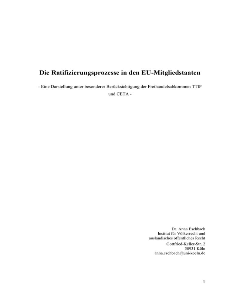 Die Ratifizierungsprozesse in den EU-Mitgliedstaaten - Eine Darstellung unter besonderer Berücksichtigung der Freihandelsabkommen TTIP und CETA - Dr. Anna Eschbach Institut für Völkerrecht und ausländisches öffentliches Recht Gottfried-Keller-Str. 2 50931 Köln [email protected] 1 Inhaltsverzeichnis Inhaltsverzeichnis ....................................................................................................................... 2 I. Einleitung ......................................................................................................................... 4 1) Das Zustandekommen völkerrechtlicher Verträge ................................................... 4 2) Die Freihandelsabkommen TTIP und CETA ........................................................... 5 II. Die innerstaatlichen Zustimmungsverfahren .................................................................. 6 1) Belgien ...................................................................................................................... 7 2) Bulgarien ................................................................................................................... 8 3) Dänemark .................................................................................................................. 9 4) Deutschland ............................................................................................................. 11 5) Estland..................................................................................................................... 13 6) Finnland .................................................................................................................. 14 7) Frankreich ............................................................................................................... 15 8) Griechenland ........................................................................................................... 17 9) Irland ....................................................................................................................... 18 10) Italien ...................................................................................................................... 19 11) Kroatien ................................................................................................................... 20 12) Lettland ................................................................................................................... 21 13) Litauen .................................................................................................................... 22 14) Luxemburg .............................................................................................................. 23 15) Malta ....................................................................................................................... 24 16) Niederlande ............................................................................................................. 25 17) Österreich ................................................................................................................ 27 18) Polen ....................................................................................................................... 27 19) Portugal ................................................................................................................... 29 20) Rumänien ................................................................................................................ 31 21) Schweden ................................................................................................................ 32 22) Slowakei .................................................................................................................. 33 23) Slowenien ................................................................................................................ 34 24) Spanien .................................................................................................................... 35 25) Tschechien .............................................................................................................. 36 26) Ungarn..................................................................................................................... 37 2 27) Vereinigtes Königreich ........................................................................................... 39 28) Zypern ..................................................................................................................... 40 III. Zusammenfassung ....................................................................................................... 41 1) Zu der Notwendigkeit eines Zustimmungsgesetzes ................................................ 43 2) Zu der Möglichkeit einer Volksabstimmung .......................................................... 47 Literaturverzeichnis .................................................................................................................. 52 3 I. Einleitung Seit Monaten beschäftigt sich die europäische Öffentlichkeit in zahlreichen Debatten mit der Notwendigkeit der Ratifizierung von Handelsabkommen wie TTIP (Trans-Atlantic Trade and Investment Partnership) und CETA (Comprehensive Economic and Trade Agreement) durch die einzelnen Mitgliedstaaten der Europäischen Union. Die Voraussetzung einer zusätzlichen nationalen Ratifizierung stellt eine große Hürde dar, die es für die Freihandelsabkommen TTIP und CETA zu überwinden gälte. Insbesondere dort, wo anstelle einer parlamentarischen Zustimmung Volksabstimmungen vorgesehen sein können, kann es sich für die Freihandelsabkommen um eine unüberwindbare Voraussetzung handeln. Stoßen sie in der europäischen Bevölkerung doch vornehmlich auf vehemente Ablehnung. Zunächst wird ein kurzer Überblick über das Zustandekommen von völkerrechtlichen Verträgen und den Regelungsinhalt von TTIP und CETA gegeben. Danach gibt das vorli