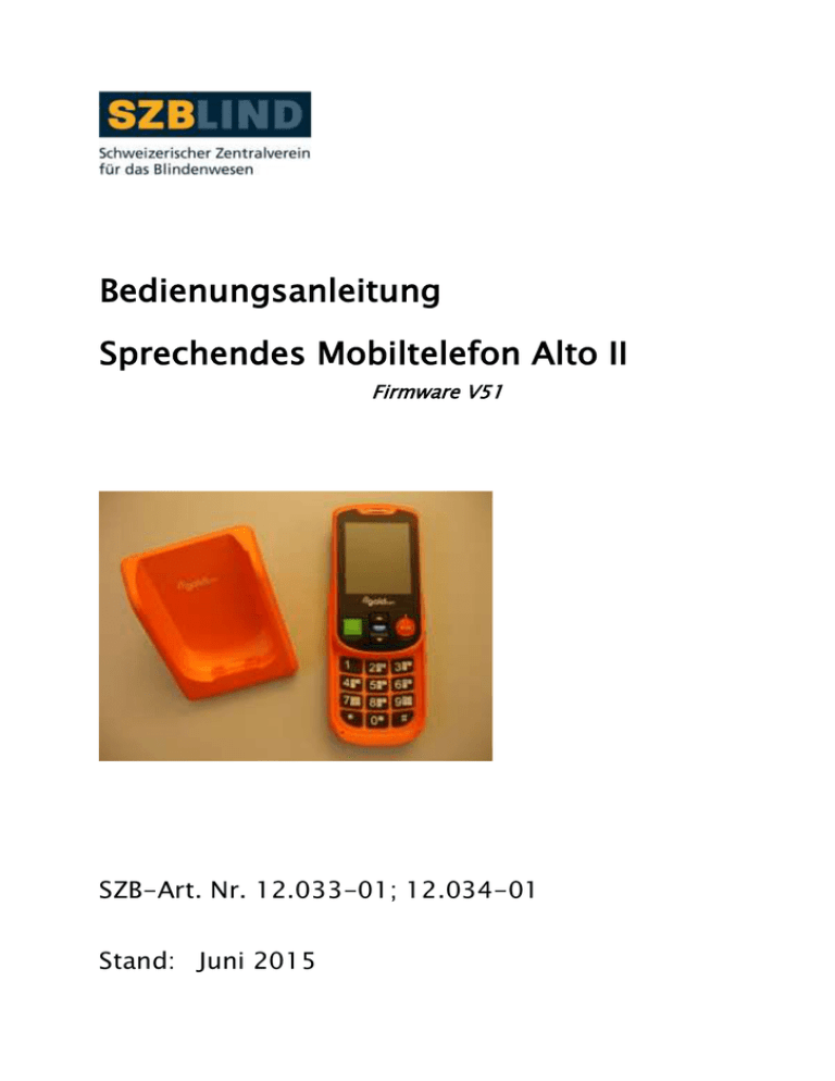 Bedienungsanleitung Sprechendes Mobiltelefon Alto II Firmware V51 SZB-Art. Nr. 12.033-01; 12.034-01 Stand: Juni 2015 Bewahren Sie diese Anleitung für den späteren Gebrauch auf. Das Dokument hat die Versionsnummer V51_EN38DE08 und wurde im Juni 2015 erstellt. Diese Bedienungsanleitung existiert in Englisch, Deutsch und Französisch und ist über unsere Webseite erhältlich: www.goldgmt.com/de Sie wurde basierend auf einem Leitfaden des Royal National Institute for the Blind (RNIB) im Vereinigten Königreich und von Odin Mobile in den USA verfasst. Wir danken RNIB und Odin Mobile, dass wir ihre Versionen als Grundlage der vorliegenden Bedienungsanleitung verwenden durften. Inhaltsverzeichnis 1 Allgemeine Beschreibung ............................... 10 1.1 Lieferumfang ................................................. 12 1.2 Grundaufbau des Telefons ............................. 12 1.2.1 Vorderseite .................................................... 12 1.2.2 Rechte Seite ................................................... 14 1.2.3 Linke Seite ..................................................... 15 1.2.4 Untere Seite ................................................... 15 1.2.5 Rückseite ....................................................... 16 1.2.6 Bildschirmanzeige .......................................... 16 2 Erste Schritte.................................................. 19 2.1 SIM-Karte und Batterie einlegen ..................... 20 2.1.1 Batteriefachabdeckung abnehmen ................. 20 2.1.2 Batterien einlegen/ersetzen ........................... 20 2.1.3 Batterie herausnehmen .................................. 21 2.1.4 SIM-Karte einlegen/entfernen ........................ 21 2.1.5 Batteriefachabdeckung einsetzen ................... 23 2.2 Aufladen und Ladezustand der Batterie .......... 23 2.2.1 Tischladestation installieren .......................... 24 2.2.2 Tischladestation............................................. 25 2.2.3 Direktaufladung am Telefon........................... 26 2.3 Telefon an- und ausschalten ......................... 27 3 Grundfunktionen ........................................... 29 3.1 Anruf absetzen .............................................. 29 3.2 Anruf annehmen ............................................ 31 3.3 Anruf beenden ............................................... 32 3.4 Freisprecheinrichtung/Lautsprecher .............. 32 4 Erweiterte Funktionen und Einstellungen ....... 32 4.1 Telefonmenü.................................................. 32 4.1.1 Menünavigation ............................................. 33 4.1.2 Oberste Menüebene ....................................... 34 4.1.3 Menüstruktur ................................................. 34 4.2 Anrufe ........................................................... 35 4.3 Kontakte/Adressbuch .................................... 38 4.3.1 Kontakt hinzufügen ....................................... 39 4.3.2 Einen Kontakt anrufen ................................... 44 4.3.3 Einen Kontakt bearbeiten oder löschen .......... 46 4.4 Textnachrichten ............................................. 48 4.4.1 Eine Textnachricht lesen ................................ 48 4.4.2 Eine Textnachricht schreiben und senden ...... 50 4.4.3 Verwaltung des Posteingangs ........................ 56 4.4.4 Verwaltung des Postausgangs ........................ 58 4.4.5 Kontakt einer Textnachricht anlegen.............. 59 4.5 Einstellungen ................................................. 60 4.5.1 Datum............................................................ 61 4.5.2 Uhrzeit ........................................................... 61 4.5.3 Sprechende Hilfe ............................................ 62 4.5.4 Sprechgeschwindigkeit .................................. 63 4.5.5 Kontrast ......................................................... 63 4.5.6 Helligkeit ....................................................... 64 4.5.7 Sprache .......................................................... 64 4.5.8 S.O.S. ............................................................. 65 4.5.8.1 Hinzufügen/Ändern einer Notrufnummer 65 4.5.9 Klingelton ...................................................... 68 4.5.10 ...............................................................................................................................Summer ...................................................................... 69 4.5.11 ...................................................................................................................... Zeitansage ...................................................................... 70 4.6 Alarme ........................................................... 70 4.6.1 Datum............................................................ 71 4.6.2 Uhrzeit ........................................................... 71 4.6.3 Klingelton ...................................................... 72 4.6.4 Wiederholung................................................. 72 4.6.5 Erinnern ......................................................... 73 4.7 Integrierte Hilfe .............................................. 74 5 Steuercodes ................................................... 74 6 Technische Spezifikation................................ 76 6.1 Zertifizierungen ............................................. 78 7 Allgemeine Geschäftsbedingungen ................ 79 7.1 Garantie ......................................................... 79 8 FAQ – Häufig gestellte Fragen ........................ 79 8.1 Batterie/Ladegerät/Autonomie....................... 79 8.1.1 Welche Stromstecker werden mit dem Telefon geliefert? ........................................................ 79 8.1.2 Muss ich die Ladestation (Ladeschale) mitnehmen, wenn ich verreise? ...................... 81 8.1.3 Wie lange hält die Batterie? ............................ 81 8.1.4 Welche Lebensdauer hat die Batterie?............