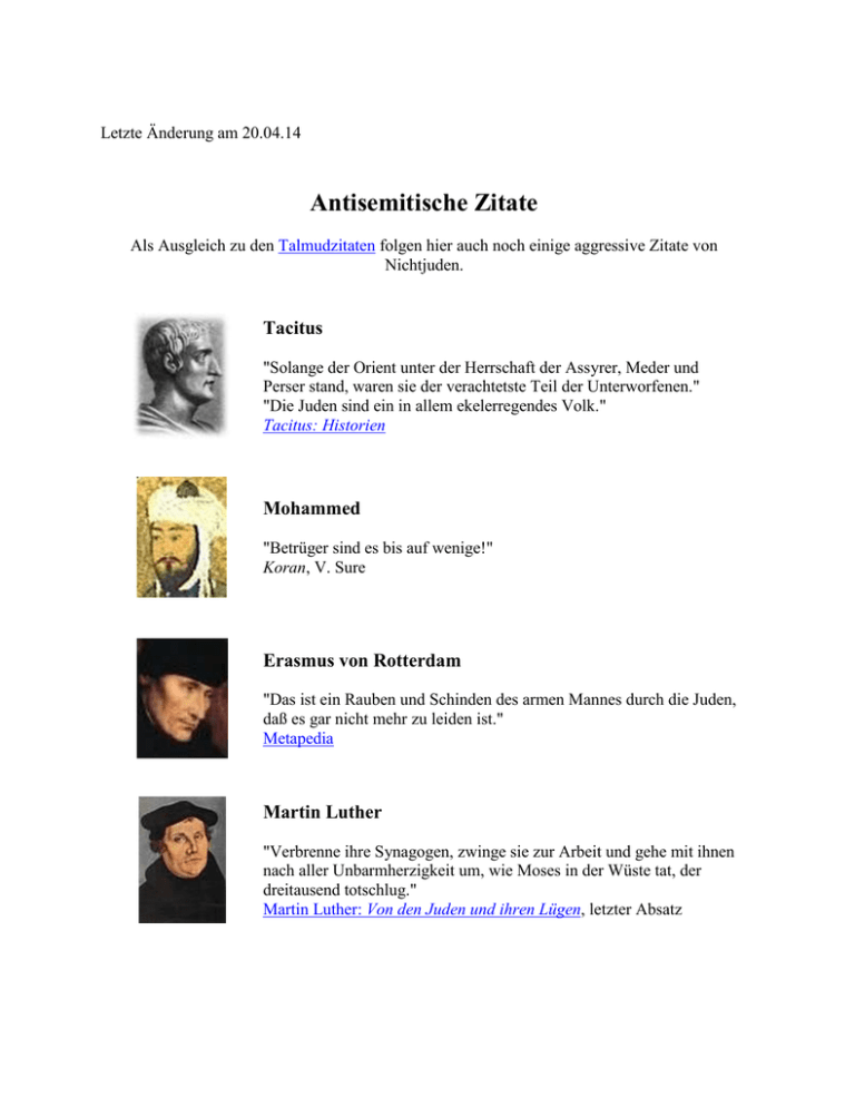 Letzte Änderung am 20.04.14 Antisemitische Zitate Als Ausgleich zu den Talmudzitaten folgen hier auch noch einige aggressive Zitate von Nichtjuden. Tacitus "Solange der Orient unter der Herrschaft der Assyrer, Meder und Perser stand, waren sie der verachtetste Teil der Unterworfenen." "Die Juden sind ein in allem ekelerregendes Volk." Tacitus: Historien Mohammed "Betrüger sind es bis auf wenige!" Koran, V. Sure Erasmus von Rotterdam "Das ist ein Rauben und Schinden des armen Mannes durch die Juden, daß es gar nicht mehr zu leiden ist." Metapedia Martin Luther "Verbrenne ihre Synagogen, zwinge sie zur Arbeit und gehe mit ihnen nach aller Unbarmherzigkeit um, wie Moses in der Wüste tat, der dreitausend totschlug." Martin Luther: Von den Juden und ihren Lügen, letzter Absatz Paracelsus "Was jüdische Ärzte handeln und ausrichten, das nimmt ein lügenhaftig End." Ludwig Englert: Paracelsus - Mensch und Arzt, Limpert, Berlin 1941, S. 88 Giordano Bruno "Die Juden sind eine so pestilenzialische, aussätzige und gemeingefährliche Rasse, daß sie schon vor ihrer Geburt ausgerottet zu werden verdienen." Giordano Bruno: Die Vertreibung der triumphierenden Bestie, 2. Aufl., Berlin und Leipzig, ca. 1907, S. 180 Georg Christoph Lichtenberg "Der Jude ist ein unersättlicher, habgieriger Betrüger." Wikipedia Immanuel Kant "Die Juden sind eine Nation von Betrügern." Immanuel Kant: Anthropologie in pragmatischer Hinsicht, §44, Fußnote Voltaire "Die Juden sind die allergrößten Lumpen, die jemals die Oberfläche der Erde besudelt haben." ursulahomann.de Adolf Freiherr Knigge "Ist man seines Kaufs mit einem Trödeljuden völlig einig, so wird er doch noch versuchen, uns zu hintergehen." Adolf Freiherr Knigge: Über den Umgang mit Menschen, ISBN 3-45831973-5, S. 379 Maria Theresia "Ich kenne keine ärgere Pest für den Staat als diese Nation, wegen der Kunst, durch Betrug, Wucher und Geldvertrag die Leute in den Bettelstand zu bringen." Eigenhändiges Schreiben an die Hofkanzlei im Jahre 1777 (lt. Metapedia) Friedrich II. "Die Juden sind von allen Sekten die gefährlichste und man muss verhindern, dass ihre Zahl wächst." Der Spiegel, 45/2011, S. 83 Napoleon "Die Juden sind eine niedrige, heruntergekommene, aller Schlechtigkeiten fähige Nation." Metapedia "Die jüdische Nation geht seit Moses Zeiten ihrer ganzen Anlage nach auf Wucher und Erpressung aus." Metapedia Johann Gottfried Herder "Die Juden sind eine parasitische Pflanze auf den Stämmen anderer Nationen." Rainer Erb, Werner Bergmann: Nachtseite der Judenemanzipation, S. 212 (lt. Wikipedia) Johann Gottlieb Fichte "Fast durch alle Länder von Europa verbreitet sich ein mächtiger, feindselig gesinnter Staat, der mit allen übrigen im beständigen Kriege steht, und der in manchen fürchterlich schwer auf die Bürger drückt; es ist das Judentum." Fichtes Werke, VI. Band, S. 149, Berlin 1845 Hermann von Scharff-Scharffenstein "Das aber bildet eben den Grundcharakter dieser Nation, daß sie allem eigenen und fremden Staatsleben sich feindlich entgegenstellen und wie Parasiten an alle Völker sich anklammern, ohne diesen anders zu lohnen, als indem sie dieselben zu Grunde richten…Die Juden wollen die Herrschaft über Deutschland, ja über die ganze Welt erlangen. Deshalb werden sie nicht gehen, denn ‚hier‘ können sie wie Vampyre das Blut der Christen saugen und in Palästina finden sie keine." Rainer Erb, Werner Bergmann: Nachtseite der Judenemanzipation, S. 198 und 202 (lt. Wikipedia) Eduard Meyer "Wir hassen nicht den Glauben der Juden, wie sie uns glauben machen möchten, sondern die häßlichen Besonderheiten dieser Asiaten, die nicht mit der Taufe abgelegt werden können." Eduard Meyer: Gegen Ludwig Börne, den Wahrheit-, Recht- und Ehrvergessenen Schriftsteller aus Paris (lt. Wikipedia) Ernst Moritz Arndt "Die Juden als Juden passen nicht in diese [deutsche] Welt und in diese Staaten hinein, und darum will ich nicht, dass sie auf eine ungebührliche Weise in Deutschland vermehrt werden. Ich will es aber auch deswegen nicht, weil sie ein durchaus fremdes Volk sind und weil ich den germanischen Stamm so sehr als möglich von fremdartigen Bestandteilen rein zu erhalten wünsche." ernst-moritz-arndt.de Johann Heinrich Pestalozzi "Hat je ein Jude aufgehört, alle Menschen, die nicht Juden sind, zu verachten und sie gelegentlich auch zu bestehlen?" Sämtliche Werke, Bd 11., Walter De Gruyter 1933, Nachdruck von 1998 (ISBN 978-3-11-009489-3), S. 45 Johann Wolfgang von Goethe "Sie haben einen Glauben, der sie berechtigt, die Fremden zu berauben." Johann Wolfgang von Goethe: Das Jahrmarktsfest zu Plundersweilern (In heutigen Ausgaben soll das Zitat zum Teil fehlen.) Jakob Friedrich Fries "Fragt doch einmal Mann vor Mann herum, ob nicht jeder Bauer, jeder Bürger sie als Volksverderber und Brotdiebe haßt und verflucht." Rainer Erb, Werner Bergmann: Nachtseite der Judenemanzipation, S. 114 (lt. Wikipedia) Hepp-Hepp-Unruhen "Allen Juden Tod und Verderben, ihr müsst fliehen oder sterben!" Wikipedia Arthur Schopenhauer "Juden sind grosse Meister im Lügen." Arthur Schopenhauer: Parerga und Paralipomena, Bd. II, §174, Fußnote (ab der zweiten Auflage) "Den Juden Anteil am Staate einzuräumen ist absurd; sie sind und bleiben ein uns fremdes, orientalisches Volk; sie müssen daher stets nur als ansässige Fremde gelten." Franz J. Scheidl: Deutschland und die Juden in Vergangenheit und Gegenwart "Das Vaterland des Juden sind die übrigen Juden." Metapedia Ludwig Feuerbach "Ihr Prinzip, ihr Gott ist das praktischste Prinzip von der Welt - der Egoismus, und zwar der Egoismus in der Form der Religion. Der Egoismus ist der Gott, der seine Diener nicht zuschanden werden läßt." http://www.kreudenstein-online.de Pierre-Joseph Proudhon "Der Jude ist der Feind der menschlichen Art. Man muß diese Rasse nach Asien verweisen oder vernichten." Pierre-Joseph Proudhon: Carnets, 26 décembre 1847 (Notizbücher, 26. Dezember 1847) (lt. Wikipedia) Michail Al