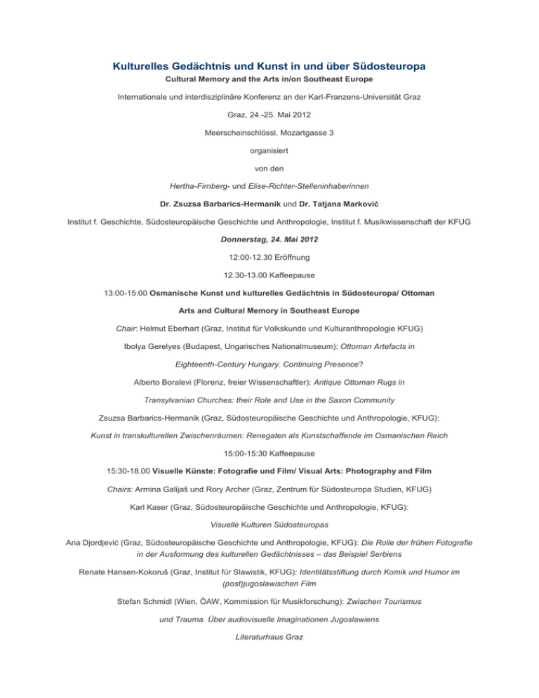 Kulturelles Gedächtnis und Kunst in und über Südosteuropa Cultural Memory and the Arts in/on Southeast Europe Internationale und interdisziplinäre Konferenz an der Karl-Franzens-Universität Graz Graz, 24.-25. Mai 2012 Meerscheinschlössl, Mozartgasse 3 organisiert von den Hertha-Firnberg- und Elise-Richter-Stelleninhaberinnen Dr. Zsuzsa Barbarics-Hermanik und Dr. Tatjana Marković Institut f. Geschichte, Südosteuropäische Geschichte und Anthropologie, Institut f. Musikwissenschaft der KFUG Donnerstag, 24. Mai 2012 12:00-12.30 Eröffnung 12.30-13.00 Kaffeepause 13:00-15:00 Osmanische Kunst und kulturelles Gedächtnis in Südosteuropa/ Ottoman Arts and Cultural Memory in Southeast Europe Chair: Helmut Eberhart (Graz, Institut für Volkskunde und Kulturanthropologie KFUG) Ibolya Gerelyes (Budapest, Ungarisches Nationalmuseum): Ottoman Artefacts in Eighteenth-Century Hungary. Continuing Presence? Alberto Boralevi (Florenz, freier Wissenschaftler): Antique Ottoman Rugs in Transylvanian Churches: their Role and Use in the Saxon Community Zsuzsa Barbarics-Hermanik (Graz, Südosteuropäische Geschichte und Anthropologie, KFUG): Kunst in transkulturellen Zwischenräumen: Renegaten als Kunstschaffende im Osmanischen Reich 15:00-15:30 Kaffeepause 15:30-18.00 Visuelle Künste: Fotografie und Film/ Visual Arts: Photography and Film Chairs: Armina Galijaš und Rory Archer (Graz, Zentrum für Südosteuropa Studien, KFUG) Karl Kaser (Graz, Südosteuropäische Geschichte und Anthropologie, KFUG): Visuelle Kulturen Südosteuropas Ana Djordjević (Graz, Südosteuropäische Geschichte und Anthropologie, KFUG): Die Rolle der frühen Fotografie in der Ausformung des kulturellen Gedächtnisses – das Beispiel Serbiens Renate Hansen-Kokoruš (Graz, Institut für Slawistik, KFUG): Identitätsstiftung durch Komik und Humor im (post)jugoslawischen Film Stefan Schmidl (Wien, ÖAW, Kommission für Musikforschung): Zwischen Tourismus und Trauma. Über audiovisuelle Imaginationen Jugoslawiens Literaturhaus Graz 20:00 Jüdische Literatur und Musik Südosteuropas/ Jewish Literature and Music in Southeast Europe Lesung von Gordana Kuić (Belgrad): The Scent of Rain in the Balkans [Miris kiše na Balkanu] Aron Saltiel (Graz) singt Sephardische Lieder aus Südosteuropa und erzählt über Feldforschungen in Südosteuropa in den 1970er und 1980er Jahren Diskussion geführt von Klaus-Jürgen Hermanik (Südosteuropäische Geschichte und Anthropologie, KFUG) Freitag, 25. Mai 2012 09:00-11.00 Musik und Theater in und über Südosteuropa/ Music and Theatre in/on Southeast Europe Chair: Zsuzsa Barbarics-Hermanik (Graz, Südosteuropäische Geschichte und Anthropologie, KFUG) Michael Walter (Graz, Institut für Musikwissenschaft, KFUG): Der ungeeignete geeignete Nationalheld: Die Oper Nikola Šubić Zrinjski von Ivan Zajc Tatjana Marković (Graz, Institut für Musikwissenschaft, KFUG): Cultural Memories in the Southeast European Operas: Between Victories and Traumas Michael Hüttler (Wien, Don Juan Archiv): Theater und kulturelles Gedächtnis: Die "Schlacht um Belgrad" auf der Bühne 11.00-11.30 Kaffeepause 11.30-13.30 Die (Re)Konstruktion nationaler Identitäten in der Kunst/ The (Re)Construction of National Identity in the Arts Chair: Tatjana Marković (Graz, Institut für Musikwissenschaft, KFUG) Maximilian Hartmuth (Istanbul, Netherlands Instituut in Turkije): The Vitae of South Slav Artists: An Essay in Cultural Memory Building Jernej Weiss (Universität Ljubljana/ Universität Maribor): Musical Life in Slovenia: A Case of "German" Philharmonic Society Srðjan Atanasovski (Belgrad, Serbische Akademie der Wissenschaften und Künste; Kunstuniversität Belgrad: Kaval and Serbian Homeland: Forging the Memory of a Landscape 13:30-15:00 Mittagessen 15.00-17.00 Minderheitenkunst sowie Kunst im öffentlichen Raum/ Minority Arts and Arts in Public Spaces Chair: Gerald Lamprecht (Graz, Centrum für Jüdische Studien, KFUG) Klaus-Jürgen Hermanik (Graz, Südosteuropäische Geschichte und Anthropologie, KFUG): Die identitätsstiftende Rolle von Literatur, bildender und darstellender Kunst für Minderheiten im südöstlichen Europa Christoph Breser (Graz, Institut für Kunstgeschichte, KFUG / Aida Abadzić Hodzić: (Sarajevo, Institut für Kunstgeschichte, Universität Sarajevo): Architektonische Rekonstruktion als Baukunst? Über das Wiederfinden von historischen Wirklichkeiten in Südosteuropa Peter Stachel (Wien, ÖAW, Institut für Kulturwissenschaften und Theatergeschichte): Die Produktion einer Hauptstadt. Denkmäler in Zagreb nach 1865 17:00-17:30 Kaffeepause 17.30-19.00 Roundtable: Diskussion über die Rolle und Verantwortung der Kunst für das kulturelle Gedächtnis Südosteuropas geleitet und moderiert von Tatjana Marković (Graz, Institut für Musikwissenschaft, KFUG) und Maximilian Hartmuth (Istanbul, Netherlands Instituut in Turkije) TeilnehmerInnen: Gordana Kuić (Schriftstellerin, Belgrade), Aron Saltiel (Musiker, Graz), Igor F. Petković (freischaffender Künstler, Novi Sad), Max Aufischer (bildender Künstler und Photograph, Kulturvermittlung Steiermark), Barbara Marković (Schriftstellerin, Stadtschreiberin der Stadt Graz ab September 2011, Belgrad/Graz), Mirela Ivičević Komponistin, Split/Wien), Jelena Popržan (Musikerin, Novi Sad/Wien), Alberto Boralevi (Kunsthändler, Florenz) Ab 19.00 Uhr Empfang