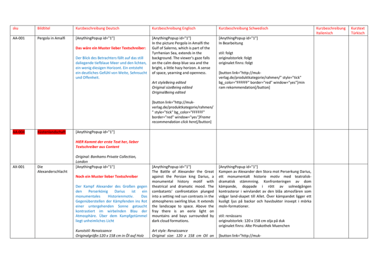 sku Bildtitel Kurzbeschreibung Deutsch Kurzbeschreibung Englisch Kurzbeschreibung Schwedisch AA-001 Pergola in Amalfi [AnythingPopup id="1"] [AnythingPopup id="1"] In the picture Pergola in Amalfi the Gulf of Salerno, which is part of the Tyrrhenian Sea, extends in the background. The viewer's gaze falls on the calm deep blue sea and the bright, a little hazy horizon. A sense of space, yearning and openness. [AnythingPopup id="1"] In Bearbeitung Das wäre ein Muster lieber Textschreiber: Der Blick des Betrachters fällt auf das still daliegende tiefblaue Meer und den lichten, ein wenig diesigen Horizont. Ein entsteht ein deutliches Gefühl von Weite, Sehnsucht und Offenheit. Art styleBeing edited Original sizeBeing edited OriginalBeing edited stil: folgt originalstorlek: folgt originalet finns: folgt [button link="http://mukverlag.de/produktkategorie/rahmen/" style="tick" bg_color="FFFFFF" border="red" window="yes"]min ram rekommendation[/button] [button link="http://mukverlag.de/produktkategorie/rahmen/ " style="tick" bg_color="FFFFFF" border="red" window="yes"]Frame recommendation click here[/button] AA-004 Küstenlandschaft [AnythingPopup id="1"] HIER Kommt der erste Text her, lieber Textschreiber aus Content AX-001 Die Alexanderschlacht Original: Bonhams Private Collection, London [AnythingPopup id="1"] Der Kampf Alexander des Großen gegen den Perserkönig Darius ist ein monumentales Historienmotiv. Das Gegenüberstellen der Kämpfenden ins Rot einer untergehenden Sonne getaucht kontrastiert im wirbelnden Blau der Atmosphäre. Über dem Kampfgetümmel liegt unheimliches Licht [AnythingPopup id="1"] The Battle of Alexander the Great against the Persian king Darius, a monumental history motif with theatrical and dramatic mood. The combatants' confrontation plunged into a setting red sun contrasts in the atmospheres swirling blue. It extends the landscape to space. Above the fray there is an eerie light on mountains and bays surrounded by dark cloud formations. Kunststil: Renaissance Originalgröße:120 x 158 cm in Öl auf Holz Art style: Renaissance Original size: 120 x 158 cm Oil on Noch ein Muster lieber Textschreiber [AnythingPopup id="1"] Kampen av Alexander den Stora mot Perserkung Darius, ett monumentalt historie motiv med teatraliskdramatisk stämmning. Konfronteringen av dom kämpande, doppade i rött av solnedgången kontrasterar i wirvlandet av den blåa atmosfären som vidgar land-skapet till Allet. Över kämpandet ligger ett kusligt ljus på backar och havsbukter insvept i mörka moln-formationer. stil: renässans originalstorlek: 120 x 158 cm olja på duk originalet finns: Alte Pinakothek Muenchen [button link="http://muk- Kurzbeschreibung Italienisch Kurztext Türkisch Original: Alte Pinakothek München wood Original: Old Pinakothek Munich verlag.de/produktkategorie/rahmen/" style="tick" bg_color="FFFFFF" border="red" window="yes"]min ram rekommendation[/button] [button link="http://mukverlag.de/produktkategorie/rahmen/ " style="tick" bg_color="FFFFFF" border="red" window="yes"]Frame recommendation click here[/button] BC-M01 BE-001 Junge mit Flöte Goethe in der Campagna [AnythingPopup id="1"] [AnythingPopup id="1"] Being edited [AnythingPopup id="1"] In Bearbeitung Art style: Being edited Original size: Being edited Original: Being edited stil: folgt originalstorlek: folgt originalet finns: folgt [button link="http://mukverlag.de/produktkategorie/rahmen/ " style="tick" bg_color="FFFFFF" border="red" window="yes"]Frame recommendation click here[/button] [button link="http://mukverlag.de/produktkategorie/rahmen/" style="tick" bg_color="FFFFFF" border="red" window="yes"]min ram rekommendation[/button] [AnythingPopup id="1"] Johann Tischbein war ein vielseitiges Talent. Portraitist, Landschaftsmaler und Historienmaler. Das bedeutende Bild Goethes auf der Rast in der Campagne (1787) zeigt, wie der Maler das klassische Ideal in großer Bildform zu verwirklichen verstand. [AnythingPopup id="1"] Johann Tischbein was a versatile talent. Portraitist, landscape painter and history painter. The significant image Goethe in der Campagna (1787) shows how the painter knew how to realize the classical ideal in large image form. [AnythingPopup id="1"] Johann Tischbein var ett mångsidigt talang. porträttmålare, landskaps- och historiemålare. Goethes betydande bild, Rasten i Champagne (1787) visar hur målaren förstod att förverkliga detta klassiska ideal i stort bildformat. Kunststil: Klassizismus Originalgröße: 206 x 164 cm in Öl auf Leinwand Original: Städelsches Kunstinstitut, Frankfurt Art style: Classicism Original size: 206 x 164 cm oil on canvas Original: Städel Institute of Art, Frankfurt [button link="http://mukverlag.de/produktkategorie/rahmen/ " style="tick" bg_color="FFFFFF" border="red" window="yes"]Frame recommendation click here[/button] stil: klassicism originalstorlek: 206x 164 cm olja på duk originalet finns: Städelsches Kunstinstitut, Frankfurt [button link="http://mukverlag.de/produktkategorie/rahmen/" style="tick" bg_color="FFFFFF" border="red" window="yes"]Frame recommendation click here[/button] BG-001 Mademoiselle Lanthelme [AnythingPopup id="1"] Kunststil: Viktorianische Kunst Original: Nationalgalerie Rom [AnythingPopup id="1"] Being edited Art style: Victorian Art Original sizeBeing edited Original: National Gallery of Rome [button link="http://mukverlag.de/produktkategorie/rahmen/ " style="tick" bg_color="FFFFFF" border="red" window="yes"]Frame recommendation click here[/button] BG-002 Der Clichy-Platz [AnythingPopup id="1"] [AnythingPopup id="1"] Being edited Art style: Victorian Art Original sizeBeing edited OriginalBeing edited Kunststil: Viktorianische Kunst [button link="http://mukverlag.de/produktkategorie/rahmen/ " style="tick" bg_color="FFFFFF" border="red" window="yes"]Frame recommendation click here[/button] BJF-001 Das Künstleratelier [AnythingPopup id="1"] Figurenbetontes Motiv im Atelierlicht. Das Colorit ist dezent gehalten. Licht u