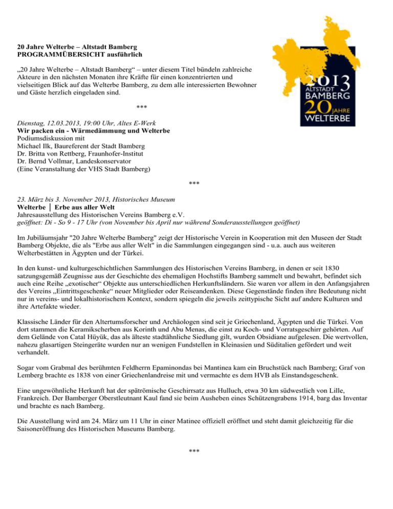 20 Jahre Welterbe – Altstadt Bamberg PROGRAMMÜBERSICHT ausführlich „20 Jahre Welterbe – Altstadt Bamberg“ – unter diesem Titel bündeln zahlreiche Akteure in den nächsten Monaten ihre Kräfte für einen konzentrierten und vielseitigen Blick auf das Welterbe Bamberg, zu dem alle interessierten Bewohner und Gäste herzlich eingeladen sind. *** Dienstag, 12.03.2013, 19:00 Uhr, Altes E-Werk Wir packen ein - Wärmedämmung und Welterbe Podiumsdiskussion mit Michael Ilk, Baureferent der Stadt Bamberg Dr. Britta von Rettberg, Fraunhofer-Institut Dr. Bernd Vollmar, Landeskonservator (Eine Veranstaltung der VHS Stadt Bamberg) *** 23. März bis 3. November 2013, Historisches Museum Welterbe │ Erbe aus aller Welt Jahresausstellung des Historischen Vereins Bamberg e.V. geöffnet: Di - So 9 - 17 Uhr (von November bis April nur während Sonderausstellungen geöffnet) Im Jubiläumsjahr "20 Jahre Welterbe Bamberg" zeigt der Historische Verein in Kooperation mit den Museen der Stadt Bamberg Objekte, die als "Erbe aus aller Welt" in die Sammlungen eingegangen sind - u.a. auch aus weiteren Welterbestätten in Ägypten und der Türkei. In den kunst- und kulturgeschichtlichen Sammlungen des Historischen Vereins Bamberg, in denen er seit 1830 satzungsgemäß Zeugnisse aus der Geschichte des ehemaligen Hochstifts Bamberg sammelt und bewahrt, befindet sich auch eine Reihe „exotischer“ Objekte aus unterschiedlichen Herkunftsländern. Sie waren vor allem in den Anfangsjahren des Vereins „Eintrittsgeschenke“ neuer Mitglieder oder Reiseandenken. Diese Gegenstände finden ihre Bedeutung nicht nur in vereins- und lokalhistorischem Kontext, sondern spiegeln die jeweils zeittypische Sicht auf andere Kulturen und ihre Artefakte wieder. Klassische Länder für den Altertumsforscher und Archäologen sind seit je Griechenland, Ägypten und die Türkei. Von dort stammen die Keramikscherben aus Korinth und Abu Menas, die einst zu Koch- und Vorratsgeschirr gehörten. Auf dem Gelände von Catal Hüyük, das als älteste stadtähnliche Siedlung gilt, wurden Obsidiane aufgelesen. Die wertvollen, nahezu glasartigen Steingeräte wurden nur an wenigen Fundstellen in Kleinasien und Süditalien gefördert und weit verhandelt. Sogar vom Grabmal des berühmten Feldherrn Epaminondas bei Mantinea kam ein Bruchstück nach Bamberg; Graf von Lemberg brachte es 1838 von einer Griechenlandreise mit und vermachte es dem HVB als Einstandsgeschenk. Eine ungewöhnliche Herkunft hat der spätrömische Geschirrsatz aus Hulluch, etwa 30 km südwestlich von Lille, Frankreich. Der Bamberger Oberstleutnant Kaul fand sie beim Ausheben eines Schützengrabens 1914, barg das Inventar und brachte es nach Bamberg. Die Ausstellung wird am 24. März um 11 Uhr in einer Matinee offiziell eröffnet und steht damit gleichzeitig für die Saisoneröffnung des Historischen Museums Bamberg. *** -4- 23. März bis 3. November 2013, Historisches Museum Museumsgeschichten │(1)75 Jahre Historisches Museum Bamberg geöffnet: Di - So 9 - 17 Uhr (von November bis April nur während Sonderausstellungen geöffnet) Das Historische Museum Bamberg kann 2013 gleich zwei Jubiläen feiern: Als eine der frühesten deutschen Museumsgründungen kann die Einrichtung der Gemäldegalerie vor 175 Jahren bezeichnet werden; 75 Jahre gibt es den Standort des Museums in der Alten Hofhaltung. 1838 schenkte der Domvikar Joseph Hemmerlein der Stadt Bamberg 118 Gemälde. Diese Bilder wurden als „Städtische Kunst- und Gemäldesammlung“ im Bürgerspital auf dem Michelsberg ausgestellt und bilden den Grundstein zu den Museen der Stadt Bamberg. Später kamen Zustiftung zahlreicher Kunst- und Kulturgüter hinzu (Schellenberger, Betz, Dorn, Schönlein, Heunisch). Heute besitzt die Stadt Bamberg ca. 3000 Gemälde und 5000 Grafiken. Genau 100 Jahre später zog dann das Fränkische Heimatmuseum in der Alten Hofhaltung ein. Im damaligen Zeitgeschmack wurden die städtischen Kunstgegenstände mit der sehr heterogenen Sammlung des Historischen Vereins und vielen Neuankäufen aus dem Kunst- und Antiquitätenhandel präsentiert. Es ist also im Jahre 2013 ein Doppeljubiläum zu feiern: 175 Jahre Eröffnung der Städtischen Kunstsammlung und 75 Jahre Eröffnung des Fränkischen Heimatmuseums (ab 1957 umbenannt in Historisches Museum Bamberg) *** 13. bis 14.04.2013, Audimax der Universität am Markusplatz Archäologietagung Ober- und Unterfranken Bamberg Veranstalter: Bayerisches Landesamt für Denkmalpflege, Universität Bamberg, Stadt Bamberg (Stadtarchäologie) Die Fachtagung bietet Beiträge zur Archäologie in Ober- und Unterfranken 2013, beschreibt und Maßnahmen, Projekte und Interpretationen und beinhaltet eine Exkursion zu Bodendenkmälern in der näheren Umgebung Bambergs. Weitere Informationen: www.stadtarchaeologie.bamberg.de Anmeldung bis zum 25. März 2013: Tagung ohne Exkursion oder Tagung mit Exkursion bei: Bayerisches Landesamt für Denkmalpflege Referat B IV – Praktische Bodendenkmalpflege, Ober- und Unterfranken Schloss Seehof 96117 Memmelsdorf Telefon: 0951/4095-40 Fax-Nr.: 0951/4095-42 E-Mail: [email protected] [email protected] *** -5- ab 15. April 2013, An der Universität 2 (U2), Raum 00.25, Zeit: montags, 20:00-22:00 Uhr „WeltkulturerbeN“ Ringvorlesung im Sommersemester 2013 Formen, Funktionen und Objekte kulturellen Erinnerns im und an das Mittelalter (Organisation: Prof. Dr. Andrea Schindler, Prof. Dr. Andrea Stieldorf, ZEMA, Universität Bamberg) Im Jahre 1993 wurde die Stadt Bamberg wegen ihres einzigartigen historischen Altstadt-Ensembles in das Weltkulturerbe der UNESCO aufgenommen. Ein weiteres Programm der UNESCO stellt wichtige historische Dokumente in den Blickpunkt der Öffentlichkeit. Mit dem Weltdokumentenerbe sollen diese Zeugnisse zum einen der Öffentlichkeit zugänglich gemacht, zum anderen aber auch vor Zerstörung geschützt werden. Zu den Beiträgen aus Deutschland zählen auch die Handschriftengruppe der Reichenau, von denen sich eini