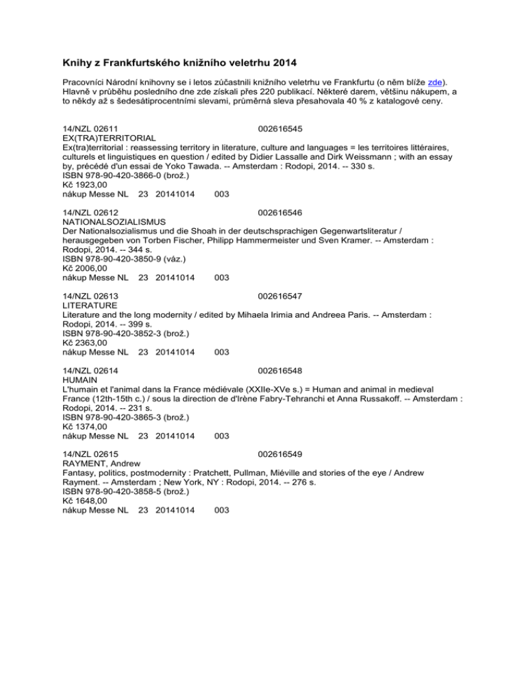 Knihy z Frankfurtského knižního veletrhu 2014 Pracovníci Národní knihovny se i letos zúčastnili knižního veletrhu ve Frankfurtu (o něm blíže zde). Hlavně v průběhu posledního dne zde získali přes 220 publikací. Některé darem, většinu nákupem, a to někdy až s šedesátiprocentními slevami, průměrná sleva přesahovala 40 % z katalogové ceny. 14/NZL 02611 002616545 EX(TRA)TERRITORIAL Ex(tra)territorial : reassessing territory in literature, culture and languages = les territoires littéraires, culturels et linguistiques en question / edited by Didier Lassalle and Dirk Weissmann ; with an essay by, précédé d'un essai de Yoko Tawada. -- Amsterdam : Rodopi, 2014. -- 330 s. ISBN 978-90-420-3866-0 (brož.) Kč 1923,00 nákup Messe NL 23 20141014 003 14/NZL 02612 002616546 NATIONALSOZIALISMUS Der Nationalsozialismus und die Shoah in der deutschsprachigen Gegenwartsliteratur / herausgegeben von Torben Fischer, Philipp Hammermeister und Sven Kramer. -- Amsterdam : Rodopi, 2014. -- 344 s. ISBN 978-90-420-3850-9 (váz.) Kč 2006,00 nákup Messe NL 23 20141014 003 14/NZL 02613 002616547 LITERATURE Literature and the long modernity / edited by Mihaela Irimia and Andreea Paris. -- Amsterdam : Rodopi, 2014. -- 399 s. ISBN 978-90-420-3852-3 (brož.) Kč 2363,00 nákup Messe NL 23 20141014 003 14/NZL 02614 002616548 HUMAIN L'humain et l'animal dans la France médiévale (XXIIe-XVe s.) = Human and animal in medieval France (12th-15th c.) / sous la direction de d'Irène Fabry-Tehranchi et Anna Russakoff. -- Amsterdam : Rodopi, 2014. -- 231 s. ISBN 978-90-420-3865-3 (brož.) Kč 1374,00 nákup Messe NL 23 20141014 003 14/NZL 02615 002616549 RAYMENT, Andrew Fantasy, politics, postmodernity : Pratchett, Pullman, Miéville and stories of the eye / Andrew Rayment. -- Amsterdam ; New York, NY : Rodopi, 2014. -- 276 s. ISBN 978-90-420-3858-5 (brož.) Kč 1648,00 nákup Messe NL 23 20141014 003 14/NZL 02616 002616552 FJÅGESUND, PETER The dream of the North : a cultural history to 1920 / Peter Fjågesund. -- Amsterdam : Rodopi, 2014. -573 s. ISBN 978-90-420-3837-0 (váz.) Kč 3435,00 nákup Messe NL 25 20141014 007 14/NZL 02617 002616553 AVENTURES Aventures et expériences littéraires : écritures des femmes en France au début du vingt-et-unième siècle / édité par Amaleena Damlé avec la collaboration de Gill Rye. -- Amsterdam ; New York : Rodopi, 2014. – 336 s. ISBN 978-90-420-3841-7 (brož.) Kč 2006,00 nákup Messe NL 23 20141014 003 14/NZL 02618 002509577 TRANSCULTURAL Transcultural identities in contemporary literature / edited by Irene Gilsenan Nordin, Julie Hansen, and Carmen Zamorano Llena. -- Amsterdam : Rodopi, 2013. -- xxvii, 284 s. ISBN 978-90-420-3735-9 (váz.) Kč 1786,00 nákup Messe NL 23 20141014 003 14/NZL 02619 002541279 PLANTS Plants and literature : essays in critical plant studies / edited by Randy Laist. -- Amsterdam : Rodopi, 2013. -- 270 s. ISBN 978-90-420-3748-9 (brož.) Kč 1566,00 nákup Messe NL 23 20141014 003 14/NZL 02620 002571586 VISION Vision and reality : Central Europe after Hitler / Richard Dove; Ian Wallace. -- Amsterdam : Rodopi, 2014. -- xiv, 251 s. ISBN 978-90-420-3815-8 (brož.) Kč 1538,00 nákup Messe NL 25 20141014 003 14/NZL 02621 002585609 PRONK-TIETHOFF, Saskia Elisabeth The Germanic loanwords in Proto-Slavic / Saskia Pronk-Tiethoff. -- Amsterdam [etc.] : Rodopi, 2013. -316 s. ISBN 978-90-420-3732-8 (váz.) 1923,- Kč nákup Messe NL 11 20141014 003 14/NZL 02622 002609353 SEMIOTICS The semiotics of animal representation / edited by Kadri Tüür and Morten Tønnessen. -- Amsterdam : Rodopi, 2014. -- 376 s. ISBN 978-90-420-3827-1 (brož.) 2198,- Kč nákup Messe NL 23 20141014 003 14/NZL 02623 002616312 VERSTEGEN, Ian Cognitive iconology : when and how psychology explains images / Ian Verstegen. -- Amsterdam : Rodopi, 2014. -- 194 s. ISBN 978-90-420-3824-0 (brož.) 1154,- Kč nákup Messe NL 02 20141014 003 14/NZL 02624 002616540 ARAB Arab voices in diaspora : critical perspectives on anglophone Arab literature / edited by Layla Al Maleh. -- Amsterdam ; New York : Rodopi, 2009. -- xii, 491 s. ISBN 978-90-420-2718-3 (váz.) 2748,- Kč nákup Messe NL 23 20141014 003 14/NZL 02625 002616541 NIEDERLÄNDISCHE Niederländische Autoren über Franz Kafka, 1922-1942 / eingeführt und herausgegeben von Cor de Back und Niels Bokhove. -- Amsterdam ; Atlanta, GA : Rodopi, 1993. -- lxviii, 168 s. ISBN 90-5183-543-4 (brož.) 1154,- Kč nákup Messe NL 23 20141014 001 14/NZL 02626 002616542 RECENT Recent advances in corpus linguistics : developing and exploiting corpora / edited by Lieven Vandelanotte ... [et al.]. -- Amsterdam ; Rodopi, 2014. -- viii, 349 s. ISBN 978-90-420-3871-4 (váz.) 2115,- Kč nákup Messe NL 11 20141014 003 14/NZL 02627 002616539 MINORITY Minority integration in Central Eastern Europe : between ethnic diversity and equality / edited and introduced by Timofey Agarin and Malte Brosig. -- Amsterdam ; New York, NY : Rodopi, 2009. -- 354 s. ISBN 978-90-420-2733-6 (váz.) 1978,- Kč nákup Messe NL 10 20141014 003 14/NZL 02628 002627136 BERNARDI, Rut - VIDESOTT, Paul Geschichte der ladinischen Literatur / Rut Bernardi, Paul Videsott. -- 2. aktualisierte Aufl. -- Bozen : Bolzano University Press, 2014. -- 2 Bd. in 3 (XII, 1502 S.) ISBN 978-88-6046063-9 (soubor : brož.) 696,- Kč nákup Messe IT 23 20141014 003 T. 1 14/NZL 02629 002627136 BERNARDI, Rut - VIDESOTT, Paul Geschichte der ladinischen Literatur / Rut Bernardi, Paul Videsott. -- 2. aktualisierte Aufl. -- Bozen : Bolzano University Press, 2014. -- 2 Bd. in 3 (XII, 1502 S.) ISBN 978-88-6046063-9 (soubor : brož.) 696,- Kč nákup Messe IT 23 20141014 003 T. 2/1 14/NZL 02630 BERNARDI, Rut - VIDESOTT, Paul 002627136 Geschichte der ladinischen Literatur / Rut Bernardi, Paul Videsott. -- 2. aktualisierte Aufl. -- Bozen : Bolzano University Press, 2014. -- 2 Bd. in 3 (XII, 1502 S.) ISBN 978-88-6046063-9 (soubor : brož.) 696,- Kč nákup Messe IT 23 20141014 003 T. 2/2 14/N