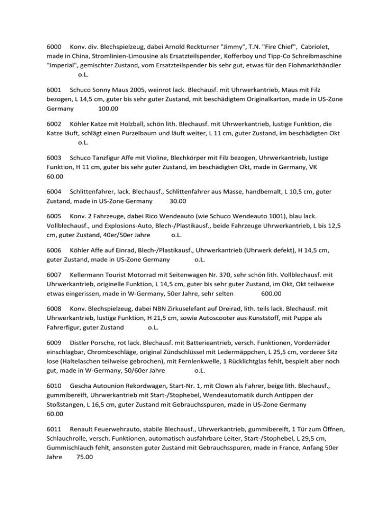 6000 Konv. div. Blechspielzeug, dabei Arnold Reckturner "Jimmy", T.N. "Fire Chief", Cabriolet, made in China, Stromlinien-Limousine als Ersatzteilspender, Kofferboy und Tipp-Co Schreibmaschine "Imperial", gemischter Zustand, vom Ersatzteilspender bis sehr gut, etwas für den Flohmarkthändler o.L. 6001 Schuco Sonny Maus 2005, weinrot lack. Blechausf. mit Uhrwerkantrieb, Maus mit Filz bezogen, L 14,5 cm, guter bis sehr guter Zustand, mit beschädigtem Originalkarton, made in US-Zone Germany 100.00 6002 Köhler Katze mit Holzball, schön lith. Blechausf. mit Uhrwerkantrieb, lustige Funktion, die Katze läuft, schlägt einen Purzelbaum und läuft weiter, L 11 cm, guter Zustand, im beschädigten Okt o.L. 6003 Schuco Tanzfigur Affe mit Violine, Blechkörper mit Filz bezogen, Uhrwerkantrieb, lustige Funktion, H 11 cm, guter bis sehr guter Zustand, im beschädigten Okt, made in Germany, VK 60.00 6004 Schlittenfahrer, lack. Blechausf., Schlittenfahrer aus Masse, handbemalt, L 10,5 cm, guter Zustand, made in US-Zone Germany 30.00 6005 Konv. 2 Fahrzeuge, dabei Rico Wendeauto (wie Schuco Wendeauto 1001), blau lack. Vollblechausf., und Explosions-Auto, Blech-/Plastikausf., beide Fahrzeuge Uhrwerkantrieb, L bis 12,5 cm, guter Zustand, 40er/50er Jahre o.L. 6006 Köhler Affe auf Einrad, Blech-/Plastikausf., Uhrwerkantrieb (Uhrwerk defekt), H 14,5 cm, guter Zustand, made in US-Zone Germany o.L. 6007 Kellermann Tourist Motorrad mit Seitenwagen Nr. 370, sehr schön lith. Vollblechausf. mit Uhrwerkantrieb, originelle Funktion, L 14,5 cm, guter bis sehr guter Zustand, im Okt, Okt teilweise etwas eingerissen, made in W-Germany, 50er Jahre, sehr selten 600.00 6008 Konv. Blechspielzeug, dabei NBN Zirkuselefant auf Dreirad, lith. teils lack. Blechausf. mit Uhrwerkantrieb, lustige Funktion, H 21,5 cm, sowie Autoscooter aus Kunststoff, mit Puppe als Fahrerfigur, guter Zustand o.L. 6009 Distler Porsche, rot lack. Blechausf. mit Batterieantrieb, versch. Funktionen, Vorderräder einschlagbar, Chrombeschläge, original Zündschlüssel mit Ledermäppchen, L 25,5 cm, vorderer Sitz lose (Haltelaschen teilweise gebrochen), mit Fernlenkwelle, 1 Rücklichtglas fehlt, bespielt aber noch gut, made in W-Germany, 50/60er Jahre o.L. 6010 Gescha Autounion Rekordwagen, Start-Nr. 1, mit Clown als Fahrer, beige lith. Blechausf., gummibereift, Uhrwerkantrieb mit Start-/Stophebel, Wendeautomatik durch Antippen der Stoßstangen, L 16,5 cm, guter Zustand mit Gebrauchsspuren, made in US-Zone Germany 60.00 6011 Renault Feuerwehrauto, stabile Blechausf., Uhrwerkantrieb, gummibereift, 1 Tür zum Öffnen, Schlauchrolle, versch. Funktionen, automatisch ausfahrbare Leiter, Start-/Stophebel, L 29,5 cm, Gummischlauch fehlt, ansonsten guter Zustand mit Gebrauchsspuren, made in France, Anfang 50er Jahre 75.00 6012 Konv. 3 Kellermann Fahrzeuge, dabei 402 VW Rotkreuz-Bus, guter Zustand im Okt, Felgen korridiert, 429 Mercedes Abschleppwagen, deutliche Gebrauchsspuren und 439 Mercedes Signal Feuerwehr, neuwertiger Zustand im Okt, alles lack. Blechausf., Friktionsantrieb, L bis 21,5 cm, made in W-Germany, 60/70er Jahre o.L. 6013 Konv. Märklin, dabei 2 x 8009 Krupp Südwerke Pritschen-Lkw und 2 x 8012 2-Achs-Anhänger für Pritschen-Lkw, alles azurblau mit Aluminiumfelgen, 1 Set bespielt mit Lackfehlern, aber noch gut, 1 Set in gutem bis sehr gutem Zustand mit nur kleinen Lackfehlern, im Okt, made in W-Germany, 50/60er Jahre o.L. 6014 Konv. 2 Märklin Fahrzeuge, dabei 8009 Krupp Südwerke Pritschen-Lkw, azurblau, mit Aluminiumfelgen und 8023 Magirus Feuerwehr, guter bis sehr guter Zustand, im Okt o.L. 6015 Schuco Replika Elektro Constructions MAN Feuerwehr mit Anhänger, versch. Funktionen, EAntrieb, komplett mit Fernbedienung, Batteriekasten und Zubehör, limitierte Auflage von 1000 Stück, neuwertiger Zustand im Okt, made in W-Germany, 2007 hergestellt o.L. 6016 Konv. 4 Kellermann Fahrzeuge und 1 Anhänger, Nr. 388 A Fernlaster mit Anhänger, 405 Trambus, 440 Mercedes 350 SL und 447 Mercedes 350 SL Cabriolet, lith. Blechausf. mit Friktionsantrieb, Trambus bespielt, aber noch gut, ansonsten sehr guter bis neuwrtiger Zustand sowie 1 Originalkarton Rollo Serie für Nr. 406 Fiat 600, dieser mit Gebrauchs- und Altersspuren, 1 Seitenlasche etwas beschädigt o.L. 6017 Batterieautomat Hase mit Telefon, teilweise Blechausf., schön lith., Hase mit Plüsch bezogen, originelle Funktion, H 24 cm, guter bis sehr guter Zustand, T. M., made in Japan, 50/60er Jahre o.L. 6018 Batterieautomat "Blushing Willy" Trinker mit Flasche und Glas, schön lith. Blechausf. mit Kunststoffbeschlägen, originelle Funktion, H 26,5 cm, sehr guter bis neuwertiger Zustand, Yone, made in Japan, 60er Jahre o.L. 6019 Batterieautomat Affe mit Tröte, teilweise Blech/Kunststoffausf., schön lith., mit Plüsch bezogen, originelle Funktion, H 24 cm, sehr guter Zustand, altersbed. Flecken im Gesicht, 1 Haltelasche am Batteriedeckel fehlt, Alps, made in Japan, 50/60er Jahre o.L. 6020 Oldtimer Landaulette Limousine, lith. Blechausf. mit Kunststoffbeschlägen, Batterieantrieb, gummibereift, L 25 cm, neuwertiger Zustand im Okt, Vitrinenmodell, etwas verstaubt, Alps, made in Japan, 60er Jahre o.L. 6021 Dux Borgward, blau lack. Blechausf. mit Uhrwerkantrieb, Bausatzauto, Chrombeschläge, L 12 cm, sehr guter Zustand, made in W-Germany, 50er Jahre o.L. 6022 Schuco Yes-No Affe, brauner Mohairplüsch, Blechkörper mit Blechgesicht, Kopf über Schwanz beweglich, Körper gegliedert, H 13 cm, sehr guter Zustand, made in Germany o.L. 6023 Fischkutter, Holzausf. mit Metallbeschlägen, 2 Masten, mit Fischkisten, Fischreusen usw., L 77 cm, H 68 cm, sehr guter Zustand, nur an Selbstabholer o.L. 6024 Günthermann Reisebus "Nibelungen Bus", rot lack. Blechausf. mit beigem Schiebedach, Uhrwerkantrieb, vor- und rückwärts fahrend, Vorderräder einschlagbar, Chrombeschläge altersbed. teilweise matt, L 28,5 cm, guter Zustand im Okt, am Okt fehlen die Seitenlaschen, bei Start/Stopphebel fehlt der kleine Kugelknopf 