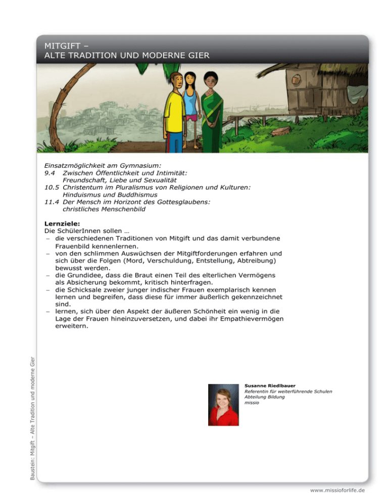 MITGIFT – ALTE TRADITION UND MODERNE GIER Einsatzmöglichkeit am Gymnasium: 9.4 Zwischen Öffentlichkeit und Intimität: Freundschaft, Liebe und Sexualität 10.5 Christentum im Pluralismus von Religionen und Kulturen: Hinduismus und Buddhismus 11.4 Der Mensch im Horizont des Gottesglaubens: christliches Menschenbild Baustein: Mitgift – Alte Tradition und moderne Gier Lernziele: Die SchülerInnen sollen … die verschiedenen Traditionen von Mitgift und das damit verbundene Frauenbild kennenlernen. von den schlimmen Auswüchsen der Mitgiftforderungen erfahren und sich über die Folgen (Mord, Verschuldung, Entstellung, Abtreibung) bewusst werden. die Grundidee, dass die Braut einen Teil des elterlichen Vermögens als Absicherung bekommt, kritisch hinterfragen. die Schicksale zweier junger indischer Frauen exemplarisch kennen lernen und begreifen, dass diese für immer äußerlich gekennzeichnet sind. lernen, sich über den Aspekt der äußeren Schönheit ein wenig in die Lage der Frauen hineinzuversetzen, und dabei ihr Empathievermögen erweitern. Susanne Riedlbauer Referentin für weiterführende Schulen Abteilung Bildung missio www.missioforlife.de 1. UNTERRICHTSEINHEIT: MITGIFT – GUT GEDACHT, SCHLECHT GEMACHT? Inhalt Methode Medien Einstieg: Sch vergleichen deutsche und indische Hochzeitsanzeigen SV M1-1/ M1-2 (Folie) Überleitung: L erläutert die Bedeutung der indischen Anzeigen. LV M1-1 / M1-2 / M1-3 EA M2 (AB) /TA/Heft Lehrerinfo: Indische Kontaktanzeigen sind nach verschiedenen Kategorien unterteilt (z. B. Kaste, Religion, Alter, Familienstand, Ethnie – vgl. M 1-3). In der Anzeige selbst wird meist genannt: Alter, Größe (Maßeinheit „1‘ ″ = Fuß = 30,48cm), Kaste oder Religion, aktueller Wohnsitz (ggf. mit Hintergrundaussage: Mumbai = Finanzmetropole; Brunei = Ausland und Ölvorkommen), Abschluss und Arbeitsplatz (z. B. „MBA″ = Master of buisness; Ausland und Höhe des Abschlusses/Jobs geben extra Punkte auf dem Heiratsmarkt), Vermögen der Familie, Voraussetzungen an PartnerIn (gleicher Hintergrund = Kaste, Religion, Ausbildung, Familienvermögen, evtl. Gruppenzugehörigkeit: z. B. „Malayalee″ = Ethnie in Kerala, Hautfarbe: „fair″ = schön = hellere Haut) Erarbeitung: AB zu Mitgift und Mitgiftmord wird bearbeitet und besprochen. Vertiefung: L: Hat die Mitgift auch positive Seiten? Lehrerinfo: Sch stellen sich auf einer gedachten Linie im Raum auf (1= „überhaupt nicht″ bis 10 = „absolut″). Sch mit ähnlicher Einschätzung tauschen sich über ihre Argumente aus und stellen sie der Klasse vor. Baustein: Mitgift – Alte Tradition und moderne Gier Schluss: Zum Schluss kann der L mit Bildern und Geschichten noch die persönlichen Schicksale, die mit dem „Mitgiftübel“ tragisch verbunden sind, illustrieren. So werden die Schüler auf einer affektiven Ebene mit der Problematik konfrontiert. Klassenbarometer UG Eindringliche Bilder und Reportagen finden sich im Buch „IN/VISIBLE – UN/SICHTBAR“ der preisgekrönten Fotografin Ann-Christine Woehrl. Die Fotos und Geschichten von Rinki aus Kalkutta und Sahera aus Nepalganj illustrieren die traurige Realität der Mitgift in Indien. Infos zum Buch finden Sie hier: http://edition.lammerhuber.at/buecher/in-visible Ausgewählte Fotos stellt Ann-Christine Woehrl auf ihrer Website zur Verfügung: http://www.ann-christine-woehrl.com/de/aktuell-untermenu www.missioforlife.de 1. UNTERRICHTSEINHEIT: WEGE ZU EINEM GESELLSCHAFTLICHEN WANDEL Tafelbild: MITGIFTMORD: ALTE TRADITION UND MODERNE GIER Südindien: Mitgift und Brautpreis Nordindien: Mitgift 1) 2) 3) Mann muss für Frau aufkommen Seine Familie bekommt ihr „Erbe″ als Entschädigung Er übernimmt das Recht vom Vater, über sie zu bestimmen. Mitgift = Erbe, das zur Absicherung im Besitz der Frau bleibt Brüder für Beschaffung mitverantwortlich Nur über weibliche Linie vererbbar Onkel/Bruder verwalten Mitgift und sind verantwortlich für das Wohl der Braut Nordostindien: Brautpreis Frau arbeitet in seiner Familie mit Mann bezahlt ihre Familie aus Briten (Kolonialisierung): Mann darf Mitgift verwalten Alte Tradition Baustein: Mitgift – Alte Tradition und moderne Gier Moderne Gier Dowry evil: Mitgift staatlich verboten wird als „Geschenk″ getarnt Beispiele: Geld, Schmuck, Landbesitz, Autos, Haushaltsgeräte, Häuser Wirtschaftlicher Aufschwung Hohe Mitgiftforderungen Verschuldung der Brautfamilie Mädchen bringen sich selber um, um Familie zu entlasten Tötung neugeborener Mädchen und Abtreibung weiblicher Föten, um zu sparen Nachforderungen von Mitgift Gewalt bis hin zur Ermordung der Braut (Mitgiftmord) neue Braut mit neuer Mitgift www.missioforlife.de Baustein: Mitgift – Alte Tradition und moderne Gier „KONTAKTANZEIGEN″ M1-1 www.missioforlife.de Baustein: Mitgift – Alte Tradition und moderne Gier „KONTAKTANZEIGEN″ M1-2 www.missioforlife.de Baustein: Mitgift – Alte Tradition und moderne Gier „KONTAKTANZEIGEN″ M1-3 DAGMAR HELLMANN-RAJANAYAGAM M2 MITGIFT IN INDIEN – GESTERN UND HEUTE Baustein: Mitgift – Alte Tradition und moderne Gier Immer wieder hören wir aus Indien erschreckende Nachrichten über Frauen und Mädchen, die bei sog. ‚dowry-deaths’ – Mitgiftmorde – ums Leben kommen. Was aber verbirgt sich hinter dem Wort Mitgift, und warum sollte jemand deswegen umgebracht werden? Mitgift Mitgift kommt aus dem Altgermanischen, wo „gift″ eine Gabe bedeutete (wie im Englischen ‚gift’). Eine Mitgift war also eine ‚Mitgabe’, etwas, was einer Tochter bei ihrer Heirat mitgegeben wurde. Das waren oft persönliche Gegenstände, Kleidung, Schmuck, Haushaltswaren usw. Bei reicheren Familien umfasste diese ‚Mitgabe’ aber oft auch Geldsummen, Haus- und Landbesitz. Diesen Brauch gab es also nicht nur in Indien, sondern auch in Europa. In Indien war die Mitgift eine Art vorgezogenes Erbe, denn Töchter waren nach den Vorschriften des hinduistischen Gesetzes hier nicht erbberechtigt. Eine Ehe war zudem keine Liebesh