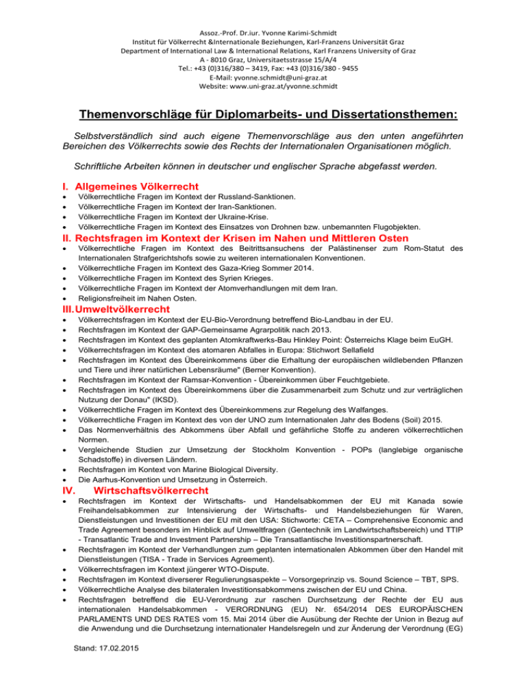 Assoz.-Prof. Dr.iur. Yvonne Karimi-Schmidt Institut für Völkerrecht &Internationale Beziehungen, Karl-Franzens Universität Graz Department of International Law & International Relations, Karl Franzens University of Graz A - 8010 Graz, Universitaetsstrasse 15/A/4 Tel.: +43 (0)316/380 – 3419, Fax: +43 (0)316/380 - 9455 E-Mail: [email protected] Website: www.uni-graz.at/yvonne.schmidt Themenvorschläge für Diplomarbeits- und Dissertationsthemen: Selbstverständlich sind auch eigene Themenvorschläge aus den unten angeführten Bereichen des Völkerrechts sowie des Rechts der Internationalen Organisationen möglich. Schriftliche Arbeiten können in deutscher und englischer Sprache abgefasst werden. I. Allgemeines Völkerrecht Völkerrechtliche Fragen im Kontext der Russland-Sanktionen. Völkerrechtliche Fragen im Kontext der Iran-Sanktionen. Völkerrechtliche Fragen im Kontext der Ukraine-Krise. Völkerrechtliche Fragen im Kontext des Einsatzes von Drohnen bzw. unbemannten Flugobjekten. II. Rechtsfragen im Kontext der Krisen im Nahen und Mittleren Osten Völkerrechtliche Fragen im Kontext des Beitrittsansuchens der Palästinenser zum Rom-Statut des Internationalen Strafgerichtshofs sowie zu weiteren internationalen Konventionen. Völkerrechtliche Fragen im Kontext des Gaza-Krieg Sommer 2014. Völkerrechtliche Fragen im Kontext des Syrien Krieges. Völkerrechtliche Fragen im Kontext der Atomverhandlungen mit dem Iran. Religionsfreiheit im Nahen Osten. III. Umweltvölkerrecht Völkerrechtsfragen im Kontext der EU-Bio-Verordnung betreffend Bio-Landbau in der EU. Rechtsfragen im Kontext der GAP-Gemeinsame Agrarpolitik nach 2013. Rechtsfragen im Kontext des geplanten Atomkraftwerks-Bau Hinkley Point: Österreichs Klage beim EuGH. Völkerrechtsfragen im Kontext des atomaren Abfalles in Europa: Stichwort Sellafield Rechtsfragen im Kontext des Übereinkommens über die Erhaltung der europäischen wildlebenden Pflanzen und Tiere und ihrer natürlichen Lebensräume" (Berner Konvention). Rechtsfragen im Kontext der Ramsar-Konvention - Übereinkommen über Feuchtgebiete. Rechtsfragen im Kontext des Übereinkommens über die Zusammenarbeit zum Schutz und zur verträglichen Nutzung der Donau" (IKSD). Völkerrechtliche Fragen im Kontext des Übereinkommens zur Regelung des Walfanges. Völkerrechtliche Fragen im Kontext des von der UNO zum Internationalen Jahr des Bodens (Soil) 2015. Das Normenverhältnis des Abkommens über Abfall und gefährliche Stoffe zu anderen völkerrechtlichen Normen. Vergleichende Studien zur Umsetzung der Stockholm Konvention - POPs (langlebige organische Schadstoffe) in diversen Ländern. Rechtsfragen im Kontext von Marine Biological Diversity. Die Aarhus-Konvention und Umsetzung in Österreich. IV. Wirtschaftsvölkerrecht Rechtsfragen im Kontext der Wirtschafts- und Handelsabkommen der EU mit Kanada sowie Freihandelsabkommen zur Intensivierung der Wirtschafts- und Handelsbeziehungen für Waren, Dienstleistungen und Investitionen der EU mit den USA: Stichworte: CETA – Comprehensive Economic and Trade Agreement besonders im Hinblick auf Umweltfragen (Gentechnik im Landwirtschaftsbereich) und TTIP - Transatlantic Trade and Investment Partnership – Die Transatlantische Investitionspartnerschaft. Rechtsfragen im Kontext der Verhandlungen zum geplanten internationalen Abkommen über den Handel mit Dienstleistungen (TISA - Trade in Services Agreement). Völkerrechtsfragen im Kontext jüngerer WTO-Dispute. Rechtsfragen im Kontext diverserer Regulierungsaspekte – Vorsorgeprinzip vs. Sound Science – TBT, SPS. Völkerrechtliche Analyse des bilateralen Investitionsabkommens zwischen der EU und China. Rechtsfragen betreffend die EU-Verordnung zur raschen Durchsetzung der Rechte der EU aus internationalen Handelsabkommen - VERORDNUNG (EU) Nr. 654/2014 DES EUROPÄISCHEN PARLAMENTS UND DES RATES vom 15. Mai 2014 über die Ausübung der Rechte der Union in Bezug auf die Anwendung und die Durchsetzung internationaler Handelsregeln und zur Änderung der Verordnung (EG) Stand: 17.02.2015 Assoz.-Prof. Dr.iur. Yvonne Karimi-Schmidt Institut für Völkerrecht &Internationale Beziehungen, Karl-Franzens Universität Graz Department of International Law & International Relations, Karl Franzens University of Graz A - 8010 Graz, Universitaetsstrasse 15/A/4 Tel.: +43 (0)316/380 – 3419, Fax: +43 (0)316/380 - 9455 E-Mail: [email protected] Website: www.uni-graz.at/yvonne.schmidt Nr. 3286/94 des Rates zur Festlegung der Verfahren der Gemeinschaft im Bereich der gemeinsamen Handelspolitik zur Ausübung der Rechte der Gemeinschaft nach internationalen Handelsregeln, insbesondere den im Rahmen der Welthandelsorganisation vereinbarten Regeln. Rechtsfragen im Kontext der Handelsabkommen EU-Asien-Ozeanien (Partnerschafts-, Kooperations- und Freihandelsabkommen) Rechtsfragen im Kontext des Handelsabkommens der EU-Afrika-Karibik-Pazifik (AKP). Der Beitritt Ecuadors am 12. Dezember 2014 zum Handelsübereinkommen der EU mit Kolumbien und Peru. Rechtsfragen im Kontext der Abkommen der EU mit der Schweiz Rechtsfragen im Kontext der Abkommen über den Europäischen Wirtschaftsraum mit Island, Liechtenstein und Norwegen (EWR). Rechtsfragen zum Abkommen der EU mit Mexiko über wirtschaftliche und politische Zusammenarbeit sowie zum Assoziierungsabkommen der EU mit Chile, Mercosur und Zentralamerika sowie Handelsübereinkommen mit der Andengemeinschaft (insbesondere Kolumbien und Peru) Rechtsfragen im Kontext der Handelsabkommen EU-Mittelmeer Rechtsfragen im Kontext der Assoziierungsabkommen und Freihandelsabkommen der EU mit Algerien, Ägypten, Israel, Jordanien, Libanon, Marokko, Palästinensische Behörde, Syrien und Tunesien sowie Rahmenabkommen der EU mit Libyen Rechtsfragen im Kontext der Kooperations- und Freihandelsabkommen der EU mit dem Golfkooperationsrat. Rechtsfragen im Kontext der Kooperationsabkommen der EU mit dem Irak, dem Iran und Jemen. Rechtsfragen im Kontext der Handelsabkommen EU-Osteuropa