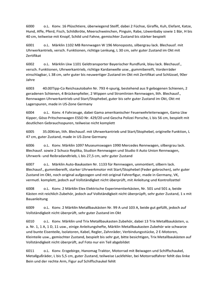 6000 o.L. Konv. 16 Plüschtiere, überwiegend Steiff, dabei 2 Füchse, Giraffe, Kuh, Elefant, Katze, Hund, Affe, Pferd, Fisch, Schildkröte, Meerschweinchen, Pinguin, Rabe, Löwenbaby sowie 1 Bär, H bis 40 cm, teilweise mit Knopf, Schild und Fahne, gemischter Zustand bis stärker bespielt 6001 o.L. Märklin 1102 MB Rennwagen W 196 Monoposto, silbergrau lack. Blechausf. mit Uhrwerkantrieb, versch. Funktionen, richtige Lenkung, L 30 cm, sehr guter Zustand im Okt mit Zertifikat 6002 o.L. Märklin Lkw 1101 Geldtransporter Bayerischer Rundfunk, blau lack. Blechausf., versch. Funktionen, Uhrwerkantrieb, richtige Kardanwelle usw., gummibereift, Vorderräder einschlagbar, L 38 cm, sehr guter bis neuwertiger Zustand im Okt mit Zertifikat und Schlüssel, 90er Jahre 6003 40.00Tipp-Co Reichsautobahn Nr. 793 4-spurig, bestehend aus 9 gebogenen Schienen, 2 geradenen Schienen, 4 Brückenpfeiler, 2 Wippen und Stromlinien Rennwagen, lith. Blechausf., Rennwagen Uhrwerkantrieb und Start/Stophebel, guter bis sehr guter Zustand im Okt, Okt mt Lagerspuren, made in US-Zone Germany 6004 o.L. Konv. 4 Fahrzeuge, dabei Gama amerikanischer Feuerwehrleiterwagen, Gama Lkw Kipper, Göso Pritschenwagen ESSO Nr. 429/20 und Gescha Polizei Porsche, L bis 56 cm, bespielt mit deutlichen Gebrauchsspuren, teilweise nicht komplett 6005 35.00Kran, lith. Blechausf. mit Uhrwerkantrieb und Start/Stophebel, originelle Funktion, L 47 cm, guter Zustand, made in US-Zone Germany 6006 o.L. Konv. Märklin 1097 Museumswagen 1990 Mercedes Rennwagen, silbergrau lack. Blechausf. sowie 2 Schuco Replika, Studion Rennwagen und Studio II Auto Union Rennwagen, Uhrwerk- und Reibradandtrieb, L bis 27,5 cm, sehr guter Zustand 6007 o.L. Märklin Auto-Baukasten Nr. 1133 für Rennwagen, unmontiert, silbern lack. Blechausf., gummibereift, starker Uhrwerkmotor mit Start/Stophebel (Feder gebrochen), sehr guter Zustand im Okt, noch original aufgezogen und mit original Fahrerfigur, made in Germany, VK, vermutl. komplett, jedoch auf Vollständigket nicht überprüft, mit Anleitung und Kontrollzettel 6008 o.L. Konv. 2 Märklin Elex Elektrische Experimentierkästen, Nr. 501 und 501 a, beide Kästen mit reichlich Zubehör, jedoch auf Vollständigkeit nicht überprüpft, sehr guter Zustand, 1 x mit Bauanleitung 6009 o.L. Konv. 2 Märklin Metallbaukästen Nr. 99 A und 103 A, beide gut gefüllt, jedoch auf Vollständigkeit nicht überprüft, sehr guter Zustand im Okt 6010 o.L. Konv. Märklin und Trix Metallbaukasten Zubehör, dabei 13 Trix Metallbaukästen, u. a. Nr. 1, 1 A, 1 D, 11 usw., einige Anleitungshefte, Märklin Metallbaukasten Zubehör wie schwarze und bunte Eisenteile, Isolatoren, Kabel, Regler, Zahnräder, Verbindungsstücke, 2 E-Motoren, Kleinteile usw., gemischter Zustand, bespielt bis sehr gut, bitte besichtigen, Trix Metallbaukästen auf Vollständigkeit nicht überprüft, auf Foto nur ein Teil abgebildet 6011 o.L. Konv. Erzgebirge, Hanomag Traktor, Motorrad mit Beiwagen und Schiffschaukel, Metallgußräder, L bis 5,5 cm, guter Zustand, teilweise Lackfehler, bei Motorradfahrer fehlt das linke Bein und der rechte Arm, Figur auf Schiffschaukel fehlt 6012 o.L. Schuco Replika Elektro-Constructions-Feuerwehr 6080, versch. Funktionen, EAntrieb, komplett mit Fernbedienung, Batteriekasten und Zubehör, limitierte Auflage von 1999 Stück, neuwertiger Zustand im Okt mit Zertifikat, minimale Anhaftungen des Styropors am Kabel, made in W-Germany, 2003 hergestellt 6013 40.00Schuco Disneyland Alweg Monorail Triebwagenzug 4-teilig, rot/silber, bestehend aus 6333/0/1 Triebwagen, 6333/0/2 Mittelwagen, 6333/0/2 b Mittelwagen mit Ziehharmonikaverbindung und 6333/0/3 Schlußwagen, L ca. 46,5 cm, bespielt, aber noch gut, teilweise Lackfehler, made in W-Germany, 60er Jahre 6014 30.00Konv. Schuco 6333/0 Disneyland Alweg Monorail Triebwagenzug 3-teilig, blau/silber, L ca. 43 cm sowie 9 gerade Schienen, 10 gebogene Schienen, 3 Ausgleichstücke, diverse Brückenpfeiler, Schienenhaltebügel, 1 Gleichrichter usw., bespielt, gemischter Zustand mit Altersund Gebrauchsspuren, teilweise Lackfehler, made in W-Germany, 60er Jahre 6015 90.00Gama 501 Lkw Kipper, rot lack. Blechausf. mit Uhrwerkantrieb, schwarzes Chassis, gummibereift mit Gama-Record-Hohlreifen, Hinterachse mit Zwillingsbereifung, viele Funktionen, L 41 cm, ein seltenes Stück. bespielt, aber noch, Zinkteile mit Zinkrissbildung, dadurch Funktion beeinträchtigt, made in W-Germany, 50er Jahre 6016 50.00Schuco Elektro Radiant 5600 Lufthansa, lith. Blechausf., versch. Funktionen, EAntrieb, einzelner Anlauf der 4 Motoren nacheinander, Umschalten der Motoren auf Hochtouren, Anrollen der Maschine, Kreis- oder Geradeausfahrt je nach Einstellung usw., L 41 cm, S 48 cm, guter Zustand, etwas reparaturbedürftig, made in W-Germany, 50/60er Jahre 6017 30.00Schuco Ingenico 5335, rot lack. Blechausf. mit Chrombeschlägen,Uhrwerkantrieb (rutscht durch), L 22 cm, bespielt, restauriert und neu lackiert, im Replika-Karton, made in US-Zone Germany 6018 75.00Schuco Fernlenkauto 2095 Mercedes 190 SL, beige lack. Blechausf. mit Uhrwerkantrieb, Chrombeschläge, L 22 cm, altersbed. Knick und Riß in der Windschutzscheibe, ansonsten sehr guter Zustand, imitiertes Lenkrad abgebrochen, liegt lose bei, im Okt mit diversem Zubehör, made in W-Germany, 50/60er Jahre 6019 40.00Schuco 5340/1 Elektro Alarm-Car Opel Admiral Polizei, weiß lack. Blechausf., Innenraum fein lith., Batterieantrieb, versch. Funktionen, L 22,5 cm, Chrombeschläge, bespielt, aber noch gut, made in W-Germany, 60er Jahre 6020 60.00Schuco Electro Alarm Car 5340, Polizeiausf., grün lack. mit cremeweißem Dach, Batterieantrieb, versch. Funktionen, L 21,5 cm, guter Zustand im Okt mit Lenkrad und Drahtwelle, Chromteile teilweise etwas Oberflächenkorrosion, an einer Seite fehlen am Okt die Seitenlaschen, made in W-Germany, 60er Jahre 6021 50.00Schuco 5500 Real Mercedes 230 SL Cabrio, weiß lack. Blechausf. mit vielen Chrombeschlägen, gummibereift, Batterieantrieb, mit richtiger 