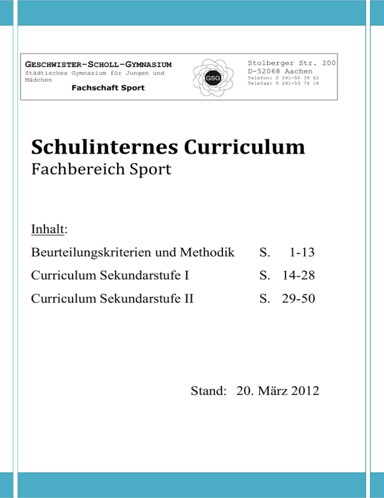 GESCHWISTER-SCHOLL-GYMNASIUM Stolberger Str. 200 D-52068 Aachen Städtisches Gymnasium für Jungen und Mädchen Telefon: 0 241-50 39 62 Telefax: 0 241-53 74 14 Fachschaft Sport Schulinternes Curriculum Fachbereich Sport Inhalt: Beurteilungskriterien und Methodik S. 1-13 Curriculum Sekundarstufe I S. 14-28 Curriculum Sekundarstufe II S. 29-50 Stand: 20. März 2012 GESCHWISTER-SCHOLL-GYMNASIUM Stolberger Str. 200 D-52068 Aachen Städtisches Gymnasium für Jungen und Mädchen Telefon: 0 241-50 39 62 Telefax: 0 241-53 74 14 Schulinternes Curriculum Sport Beurteilungskriterien und Methodik Kriterien für die Leistungsbeurteilung im Fach Sport Grundlage: Richtlinien und Lehrpläne SPORT, herausgegeben vom Ministerium für Schule und Weiterbildung, Wissenschaft und Forschung des Landes NRW Allgemeines Die Grundsätze der Leistungsbewertung ergeben sich aus den entsprechenden Bestimmungen der Allgemeinen Schulordnung (§§21 bis 23). Für das Verfahren der Leistungsbewertung gelten die §§ 13 bis 17 der Verordnung über den Bildungsgang und die Abiturprüfung in der gymnasialen Oberstufe (APO-GOSt). Folgende Grundsätze der Leistungsbewertung sind festzuhalten: Leistungsbewertungen sind ein kontinuierlicher Prozess. Bewertet werden alle von Schülerinnen und Schülern im Zusammenhang mit dem Unterricht erbrachten Leistungen (s.u.). Die Leistungsbewertung bezieht sich auf die im Unterricht vermittelten Fähigkeiten, Fertigkeiten und Kenntnisse. Leistungsbewertung setzt voraus, dass die Schülerinnen und Schüler im Unterricht Gelegenheit hatten, die entsprechenden Anforderungen in Umfang und Anspruch kennen zu lernen und sich auf diese vorzubereiten. Bewertet werden Qualität und Umfang der Fähigkeiten, Fertigkeiten und Kenntnisse, die methodische Selbstständigkeit in ihrer Anwendung sowie die sachgemäße Darstellung. (…) Bei Gruppenleistungen muss die individuelle Schülerleistung bewertbar sein. Die Bewertung ihrer Leistungen muss den Schülerinnen und Schülern auch im Vergleich mit Mitschülerinnen und Mitschülern transparent sein. Lernerfolgsüberprüfungen im Fach Sport müssen die vielfältigen Zielsetzungen des Faches in ihrer oberstufenspezifischen Akzentuierung berücksichtigen. Da im Grundkurs Sport keine Klausuren geschrieben werden, zählen sämtliche Leistungen im Grundkurs zum Beurteilungsbereich „Sonstige Mitarbeit“. Die Kurslehrerin bzw. der Kurslehrer ist verpflichtet, die Schülerinnen und Schüler zu Beginn jedes Kurshalbjahres über die Anforderungen, über die Art der Leistungsüberprüfung, über die Bewertungskriterien sowie über die Bildung der Kursnote zu unterrichten. 2 Beurteilungsbereich „Sonstige Mitarbeit“ 1. Sportmotorische und konditionelle Leistungen, Bewegungskönnen Sportspezifisches Können und die dazugehörigen konditionellen und koordinativen Fähigkeiten und Fertigkeiten. Beurteilt wird sowohl die individuelle Leistung als auch der individuelle Lernzuwachs. Überprüfungsformen: ○ Demonstrationen: Diese dienen der Überprüfung der Qualität von Bewegungsausführung und Bewegungsgestaltung nach vereinbarten und vorgegebenen Kriterien. Mögliche Formen: Demonstration von Bewegungsabläufen vor der Lerngruppe, Präsentation von Arbeitsergebnissen einer Partner- oder Gruppenarbeit, Umsetzung von Technik und Taktik in Spielsituationen, Kreativität, Vielseitigkeit. o Motorische Tests: Diese erfassen quantitativ messbare sportmotorische Leistungen in Bezug auf sportbereichspezifisches Können und die zugehörigen konditionellen und koordinativen Fähigkeiten. Sie ermöglichen insbesondere eine objektive Feststellung sowohl der individuellen Leistung als auch deren Steigerung. 2. Weitere fachliche Leistungen • o Überprüfungsformen: Beiträge zur Unterrichtsgestaltung: Auch im Mitgestalten von Unterrichtssituationen durch Schülerinnen und Schüler wird Lernerfolg sichtbar. Dabei können sie neben motorischem Können auch Methodenkompetenz nachweisen. Insbesondere beim selbstständigen Erarbeiten von Lösungen in Partner- und Gruppenarbeit werden personale und soziale Kompetenzen sichtbar (konstruktive Einbindung in den gemeinsamen Arbeitsprozess, Auseinandersetzung mit Beiträgen anderer, Kritikfähigkeit). Lernerfolge lassen sich in unterschiedlichen Handlungssituationen erkennen: selbstständiges Planen und Gestalten einzelner Unterrichtssituationen (z.B. Durchführung der Erwärmung, Demonstrationen, Schiedsrichtertätigkeiten, Gestaltung von Wettkampfsituationen, Übungs- oder Spielformen), sach- und sicherheitsgerechtes Herrichten der Übungsstätte, Bewegungsbeobachtung/verbesserung, Sicherheits- und Hilfestellung etc. o Beiträge in Unterrichtsgesprächen, z.B. Reflexions- und Urteilsfähigkeit, Kritikfähigkeit / Meinungsäußerung / Vorschläge, Bewegungskorrekturen, ggf. theoretisches Wissen, Aufmerksamkeit etc. o Beteiligung am praktischen Unterricht, z.B. Sich-Einlassen auf neue und ungewohnte Unterrichtssituationen, Aktivität, Anstrengungsbereitschaft etc. o Beteiligung in Phasen der Partner- oder Gruppenarbeit, z.B. Mitarbeit, Selbstständigkeit, Kooperation mit MitschülerInnen, Sich-Einbringen, Wahrnehmung und Beurteilung von fremden und eigenen Bewegungshandlungen, Entwicklung von Verbesserungsmöglichkeiten etc. o Sozialverhalten, z.B. Fairness, Verhalten gegenüber MitschülerInnen, Hilfsbereitschaft (z.B. beim Aufund Abbau, Hilfestellungen), Teamfähigkeit, Kooperationsfähigkeit, Empathiefähigkeit, Konfliktfähigkeit, Rücksichtnahme etc. o Sonstiges: Schriftliche Übungen, Referate, Protokolle, Hausaufgaben. Die Gewichtung der Kriterien erfolgt entsprechend der zentralen pädagogischen Perspektiven! 3 Hinweise zur Bewertung von Leistungen im Fach Sport in Bezug auf die Inhaltsfelder (s. RuL Sport Gymnasium / Gesamtschule Sek II, Kapitel 4.2.2, S. 65 ff): Inhaltsfelder für Sport in der Schule sind Wahrnehmungsfähigkeit verbessern, Bewegungserfahrungen erweitern (A) Sich körperlich ausdrücken, Bewegungen gestalten 