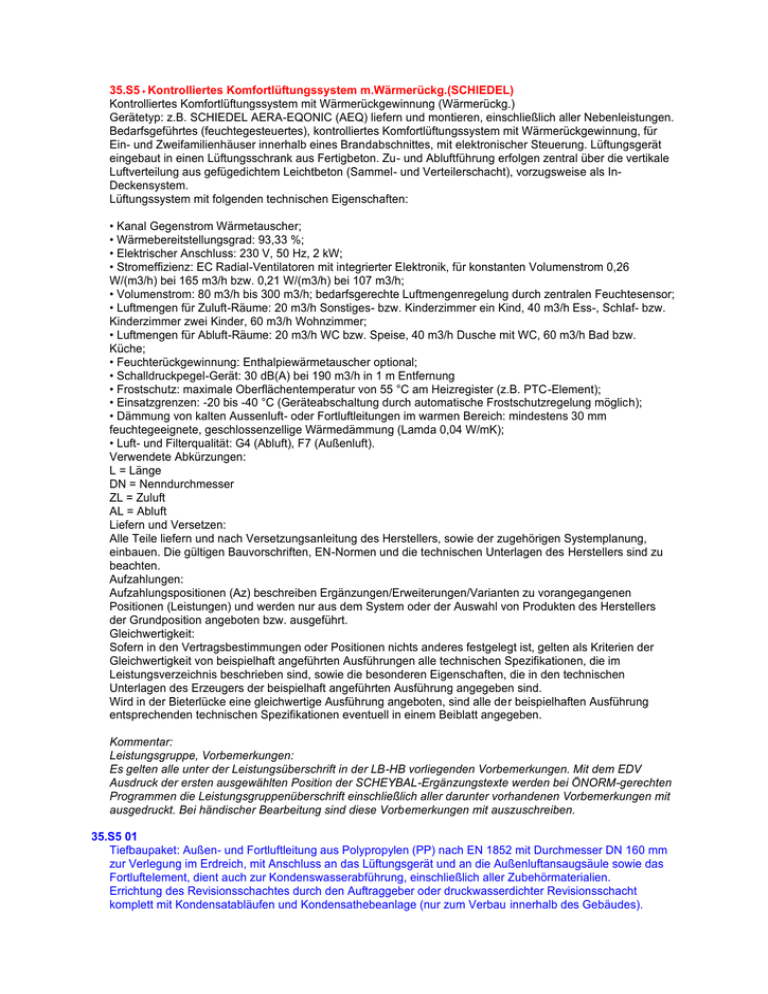 35.S5 + Kontrolliertes Komfortlüftungssystem m.Wärmerückg.(SCHIEDEL) Kontrolliertes Komfortlüftungssystem mit Wärmerückgewinnung (Wärmerückg.) Gerätetyp: z.B. SCHIEDEL AERA-EQONIC (AEQ) liefern und montieren, einschließlich aller Nebenleistungen. Bedarfsgeführtes (feuchtegesteuertes), kontrolliertes Komfortlüftungssystem mit Wärmerückgewinnung, für Ein- und Zweifamilienhäuser innerhalb eines Brandabschnittes, mit elektronischer Steuerung. Lüftungsgerät eingebaut in einen Lüftungsschrank aus Fertigbeton. Zu- und Abluftführung erfolgen zentral über die vertikale Luftverteilung aus gefügedichtem Leichtbeton (Sammel- und Verteilerschacht), vorzugsweise als InDeckensystem. Lüftungssystem mit folgenden technischen Eigenschaften: • Kanal Gegenstrom Wärmetauscher; • Wärmebereitstellungsgrad: 93,33 %; • Elektrischer Anschluss: 230 V, 50 Hz, 2 kW; • Stromeffizienz: EC Radial-Ventilatoren mit integrierter Elektronik, für konstanten Volumenstrom 0,26 W/(m3/h) bei 165 m3/h bzw. 0,21 W/(m3/h) bei 107 m3/h; • Volumenstrom: 80 m3/h bis 300 m3/h; bedarfsgerechte Luftmengenregelung durch zentralen Feuchtesensor; • Luftmengen für Zuluft-Räume: 20 m3/h Sonstiges- bzw. Kinderzimmer ein Kind, 40 m3/h Ess-, Schlaf- bzw. Kinderzimmer zwei Kinder, 60 m3/h Wohnzimmer; • Luftmengen für Abluft-Räume: 20 m3/h WC bzw. Speise, 40 m3/h Dusche mit WC, 60 m3/h Bad bzw. Küche; • Feuchterückgewinnung: Enthalpiewärmetauscher optional; • Schalldruckpegel-Gerät: 30 dB(A) bei 190 m3/h in 1 m Entfernung • Frostschutz: maximale Oberflächentemperatur von 55 °C am Heizregister (z.B. PTC-Element); • Einsatzgrenzen: -20 bis -40 °C (Geräteabschaltung durch automatische Frostschutzregelung möglich); • Dämmung von kalten Aussenluft- oder Fortluftleitungen im warmen Bereich: mindestens 30 mm feuchtegeeignete, geschlossenzellige Wärmedämmung (Lamda 0,04 W/mK); • Luft- und Filterqualität: G4 (Abluft), F7 (Außenluft). Verwendete Abkürzungen: L = Länge DN = Nenndurchmesser ZL = Zuluft AL = Abluft Liefern und Versetzen: Alle Teile liefern und nach Versetzungsanleitung des Herstellers, sowie der zugehörigen Systemplanung, einbauen. Die gültigen Bauvorschriften, EN-Normen und die technischen Unterlagen des Herstellers sind zu beachten. Aufzahlungen: Aufzahlungspositionen (Az) beschreiben Ergänzungen/Erweiterungen/Varianten zu vorangegangenen Positionen (Leistungen) und werden nur aus dem System oder der Auswahl von Produkten des Herstellers der Grundposition angeboten bzw. ausgeführt. Gleichwertigkeit: Sofern in den Vertragsbestimmungen oder Positionen nichts anderes festgelegt ist, gelten als Kriterien der Gleichwertigkeit von beispielhaft angeführten Ausführungen alle technischen Spezifikationen, die im Leistungsverzeichnis beschrieben sind, sowie die besonderen Eigenschaften, die in den technischen Unterlagen des Erzeugers der beispielhaft angeführten Ausführung angegeben sind. Wird in der Bieterlücke eine gleichwertige Ausführung angeboten, sind alle der beispielhaften Ausführung entsprechenden technischen Spezifikationen eventuell in einem Beiblatt angegeben. Kommentar: Leistungsgruppe, Vorbemerkungen: Es gelten alle unter der Leistungsüberschrift in der LB-HB vorliegenden Vorbemerkungen. Mit dem EDV Ausdruck der ersten ausgewählten Position der SCHEYBAL-Ergänzungstexte werden bei ÖNORM-gerechten Programmen die Leistungsgruppenüberschrift einschließlich aller darunter vorhandenen Vorbemerkungen mit ausgedruckt. Bei händischer Bearbeitung sind diese Vorbemerkungen mit auszuschreiben. 35.S5 01 Tiefbaupaket: Außen- und Fortluftleitung aus Polypropylen (PP) nach EN 1852 mit Durchmesser DN 160 mm zur Verlegung im Erdreich, mit Anschluss an das Lüftungsgerät und an die Außenluftansaugsäule sowie das Fortluftelement, dient auch zur Kondenswasserabführung, einschließlich aller Zubehörmaterialien. Errichtung des Revisionsschachtes durch den Auftraggeber oder druckwasserdichter Revisionsschacht komplett mit Kondensatabläufen und Kondensathebeanlage (nur zum Verbau innerhalb des Gebäudes). A+ Tiefbau AEQ PP-Rohr DN 160mm L=1m Stk PP-Rohr DN 160 mm mit Länge von 1 m, einschließlich radondichtem Lippendichtring NBR 160, z.B. AEQ PP-Rohr DN160 L=1m von SCHIEDEL . Angebotenes Erzeugnis:.... B+ Tiefbau AEQ PP-Rohr DN 160mm L=2m Stk PP-Rohr DN 160 mm mit Länge von 2 m, einschließlich radondichtem Lippendichtring NBR 160, z.B. AEQ PP-Rohr DN160 L=2m von SCHIEDEL . Angebotenes Erzeugnis:.... C+ Tiefbau AEQ PP-Bogen 15Gr DN 160mm Stk PP-Bogen 15 Grad (15Gr) DN 160 mm, einschließlich radondichtem Lippendichtring NBR 160, z.B. AEQ PP-Bogen 15Gr DN160 von SCHIEDEL . Angebotenes Erzeugnis:.... D+ Tiefbau AEQ PP-Bogen 30Gr DN 160mm Stk PP-Bogen 30 Grad (30Gr) DN 160 mm, einschließlich radondichtem Lippendichtring NBR 160, z.B. AEQ PP-Bogen 30Gr DN160 von SCHIEDEL . Angebotenes Erzeugnis:.... E+ Tiefbau AEQ PP-Bogen 45Gr DN 160mm Stk PP-Bogen 45 Grad (45Gr) DN 160 mm, einschließlich radondichtem Lippendichtring NBR 160, z.B. AEQ PP-Bogen 45Gr DN160 von SCHIEDEL . Angebotenes Erzeugnis:.... F+ Tiefbau AEQ PP-Bogen 67Gr DN 160mm Stk PP-Bogen 67 Grad (67Gr) DN 160 mm, einschließlich radondichtem Lippendichtring NBR 160, z.B. AEQ PP-Bogen 67Gr DN160 von SCHIEDEL . Angebotenes Erzeugnis:.... G+ Tiefbau AEQ PP-Bogen 87Gr DN 160mm Stk PP-Bogen 87 Grad (87Gr) DN 160 mm, einschließlich radondichtem Lippendichtring NBR 160, z.B. AEQ PP-Bogen 87Gr DN160 von SCHIEDEL . Angebotenes Erzeugnis:.... H+ Tiefbau AEQ PP-Bodendurchführung DN160 Stk PP-Bodendurchführung DN 160 mm für druckwasserdichte Durchführung für Außen-, oder Fortluftleitung, druckwasserdicht, z.B. AEQ PP-Bodendurchführung DN160 von SCHIEDEL . Angebotenes Erzeugnis:.... I+ Tiefbau AEQ PP-Wanddurchführung DN160 Stk PP-Wanddurchführung DN 160 mm für druckwasserdichte Durchführung für Außen-, oder Fortluftleitung, druckwasserdicht, z.B. AEQ PP-Wanddurchführung DN160 von SCHIEDEL . Angebotenes Er