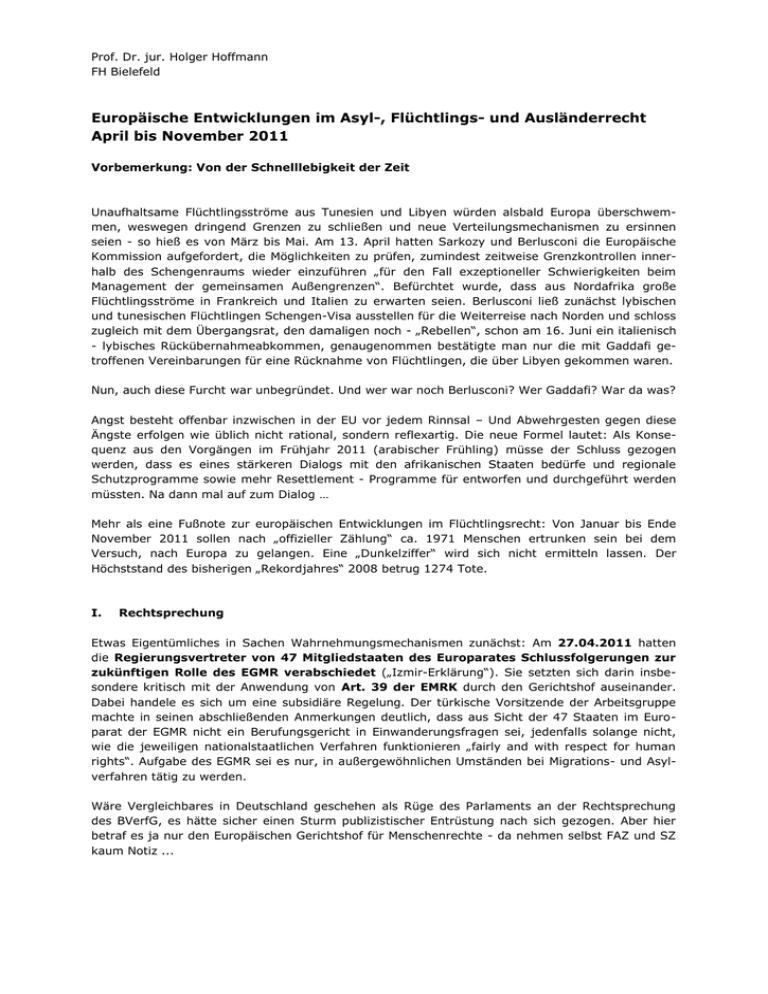 Prof. Dr. jur. Holger Hoffmann FH Bielefeld Europäische Entwicklungen im Asyl-, Flüchtlings- und Ausländerrecht April bis November 2011 Vorbemerkung: Von der Schnelllebigkeit der Zeit Unaufhaltsame Flüchtlingsströme aus Tunesien und Libyen würden alsbald Europa überschwemmen, weswegen dringend Grenzen zu schließen und neue Verteilungsmechanismen zu ersinnen seien - so hieß es von März bis Mai. Am 13. April hatten Sarkozy und Berlusconi die Europäische Kommission aufgefordert, die Möglichkeiten zu prüfen, zumindest zeitweise Grenzkontrollen innerhalb des Schengenraums wieder einzuführen „für den Fall exzeptioneller Schwierigkeiten beim Management der gemeinsamen Außengrenzen“. Befürchtet wurde, dass aus Nordafrika große Flüchtlingsströme in Frankreich und Italien zu erwarten seien. Berlusconi ließ zunächst lybischen und tunesischen Flüchtlingen Schengen-Visa ausstellen für die Weiterreise nach Norden und schloss zugleich mit dem Übergangsrat, den damaligen noch - „Rebellen“, schon am 16. Juni ein italienisch - lybisches Rückübernahmeabkommen, genaugenommen bestätigte man nur die mit Gaddafi getroffenen Vereinbarungen für eine Rücknahme von Flüchtlingen, die über Libyen gekommen waren. Nun, auch diese Furcht war unbegründet. Und wer war noch Berlusconi? Wer Gaddafi? War da was? Angst besteht offenbar inzwischen in der EU vor jedem Rinnsal – Und Abwehrgesten gegen diese Ängste erfolgen wie üblich nicht rational, sondern reflexartig. Die neue Formel lautet: Als Konsequenz aus den Vorgängen im Frühjahr 2011 (arabischer Frühling) müsse der Schluss gezogen werden, dass es eines stärkeren Dialogs mit den afrikanischen Staaten bedürfe und regionale Schutzprogramme sowie mehr Resettlement - Programme für entworfen und durchgeführt werden müssten. Na dann mal auf zum Dialog … Mehr als eine Fußnote zur europäischen Entwicklungen im Flüchtlingsrecht: Von Januar bis Ende November 2011 sollen nach „offizieller Zählung“ ca. 1971 Menschen ertrunken sein bei dem Versuch, nach Europa zu gelangen. Eine „Dunkelziffer“ wird sich nicht ermitteln lassen. Der Höchststand des bisherigen „Rekordjahres“ 2008 betrug 1274 Tote. I. Rechtsprechung Etwas Eigentümliches in Sachen Wahrnehmungsmechanismen zunächst: Am 27.04.2011 hatten die Regierungsvertreter von 47 Mitgliedstaaten des Europarates Schlussfolgerungen zur zukünftigen Rolle des EGMR verabschiedet („Izmir-Erklärung“). Sie setzten sich darin insbesondere kritisch mit der Anwendung von Art. 39 der EMRK durch den Gerichtshof auseinander. Dabei handele es sich um eine subsidiäre Regelung. Der türkische Vorsitzende der Arbeitsgruppe machte in seinen abschließenden Anmerkungen deutlich, dass aus Sicht der 47 Staaten im Europarat der EGMR nicht ein Berufungsgericht in Einwanderungsfragen sei, jedenfalls solange nicht, wie die jeweiligen nationalstaatlichen Verfahren funktionieren „fairly and with respect for human rights“. Aufgabe des EGMR sei es nur, in außergewöhnlichen Umständen bei Migrations- und Asylverfahren tätig zu werden. Wäre Vergleichbares in Deutschland geschehen als Rüge des Parlaments an der Rechtsprechung des BVerfG, es hätte sicher einen Sturm publizistischer Entrüstung nach sich gezogen. Aber hier betraf es ja nur den Europäischen Gerichtshof für Menschenrechte - da nehmen selbst FAZ und SZ kaum Notiz ... 2 1. EGMR a) Art 39: Mit Entscheidung vom 27.10.2011 im Rahmen einer Art. 39-Regelung: untersagte der EGMR die Rückschiebung eines Somaliers aus Großbritannien nach Italien (Az. 63388/11). Der britische Kollege, der die Entscheidung über das ELENA - Netz uns mitgeteilt hat, hat leider jedoch keine weiteren Ausführungen zur Begründung gemacht. Interessanterweise hat er aber mitgeteilt, dass in diesem Verfahren bekannt geworden sei, dass 2011 41 Rücküberstellungen von Deutschland nach Italien gestoppt worden seien. Ob es sich dabei um Entscheidungen handelt, die der EGMR getroffen hat, oder um nationale Instanz-Entscheidungen, habe ich leider nicht ermitteln können. b) Art. 3 EMRK: Am 28. Juni 2011 urteilte der EGMR in Verfahren zweier Somalis (Sufi and Elmi ./. UK – Case Nr. 8319/07 und 1149/07), die aus Großbritannien nach Mogadischu abgeschoben werden sollten: eine solche Abschiebung stelle einen Bruch des Art. 3 der EMRK dar. Beide Antragsteller waren in Großbritannien verurteilt worden wegen Diebstählen, Raub und Drogenhandel. Der EGMR stellte fest, dass das Verhalten der Beschwerdeführer gefährlich und nicht wünschenswert sei. Dennoch könne es nicht in Beziehung gesetzt werden zu dem erheblichen Risiko, dass im Falle eine Deportation nach Somalia drohe, weil dort mit einer unmenschlichen Behandlung oder Folter im Sinne von Art. 3 EMRK zu rechnen sei. Das UK hatte gegen diese Entscheidung noch die „große Kammer“ des EGMR angerufen. Dort wurde das Verfahren jedoch nicht zur Entscheidung angenommen. Dies bedeutet, dass die Entscheidung vom 28.6.11 jetzt die „Leitentscheidung“ bezüglich der (Un-)Möglichkeit, nach Mogadischu abzuschieben, ist. c) Art. 5: Anordnung von Abschiebungshaft - 23. September 2011: Zwei Staatsangehörige der Elfenbeinküste führten ein Verfahren gegen Ungarn wegen willkürlicher Anordnung von Abschiebungshaft. Beide waren fünf Monate in Abschiebungshaft untergebracht, obwohl sich herausstellte, dass Gründe für die Überprüfung ihrer Asylrechtlichen Fälle vorlagen und die ungarische Asylbehörde auch mit entsprechenden Prüfungen begonnen hatte. Der EGMR kritisierte insbesondere, dass die ungarischen Behörden in keiner Weise sich um eine Freilassung der Betroffenen gekümmert haben und es in Ungarn auch keine Rechtsmittelmöglichkeit gegen eine solche Inhaftierung gebe. Der EGMR stellte eine Verletzung von Art. 5 EMRK durch Ungarn festgestellt. Eine ergänzende Anmerkung: Diesem Bericht sind aus Gründen der Aktualität drei „Weekly Legal Updates“ von ELENA vom 11., 18. und 25.11.2011 neuest