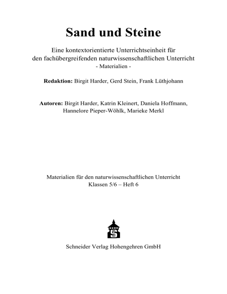 Sand und Steine Eine kontextorientierte Unterrichtseinheit für den fachübergreifenden naturwissenschaftlichen Unterricht - Materialien Redaktion: Birgit Harder, Gerd Stein, Frank Lüthjohann Autoren: Birgit Harder, Katrin Kleinert, Daniela Hoffmann, Hannelore Pieper-Wöhlk, Marieke Merkl Materialien für den naturwissenschaftlichen Unterricht Klassen 5/6 – Heft 6 Schneider Verlag Hohengehren GmbH Materialien für den naturwissenschaftlichen Unterricht: Klassen 5/6 Herausgegeben von Reinhard Demuth, Ilka Parchmann und Helmut Prechtl Heft 6: Sand und Steine Eine kontextorientierte Unterrichtseinheit für den fachübergreifenden naturwissenschaftlichen Unterricht -MaterialienRedaktion: Birgit Harder, Gerd Stein, Frank Lüthjohann Autoren: Birgit Harder, Katrin Kleinert, Daniela Hoffmann, Hannelore PieperWölk, Marike Merkl Zeichnungen: Birgit Harder Abbildungsnachweis: Fotos: Birgit Harder, Katrin Kleinert, Daniela Hoffmann Karten und Basiskonzept-Logos: Verena Hane, Kontext-Logos: Erika Kolaczinski Das vorliegende Werk wurde sorgfältig erarbeitet. Dennoch übernehmen Redakteure, Autoren, Herausgeber und Verlag für die Richtigkeit von Angaben, Hinweisen und Ratschlägen sowie für eventuelle Druckfehler keine Haftung. Das Fehlen von Warnhinweisen sowie R- und S-Sätzen bei der Auflistung von Chemikalien berechtigt nicht zur Annahme, dass diese gefahrlos verwendet werden können. Das Nacharbeiten der Experimente erfolgt auf eigene Gefahr. Das Heft ist im Rahmen des IPN Projektes NaWi-5/6 entstanden, das vom Land Schleswig-Holstein gefördert wird. Informationen und Kontakt: www.nawi5-6.de Überblick über die Unterrichtseinheit 12 Begegnungsphase Konkretisierung der Unterrichtsphase 15 Fragekärtchen 17 Stationsarbeit am Strand 17 Stationsarbeit im Klassenraum 17 Bestimmungstafeln für Steine 17 Bestimmungstabelle für Steine 17 Neugier- und Planungsphase Konkretisierung der Unterrichtsphase 21 Erarbeitungsphase Überblick über die Erarbeitungsphase 26 Wie heißen die Steine? Vorgehen Schülerpräsentation 28 Steinsteckbrief 31 Merkmalkarten 34 Können Steine sich verändern? Wie entsteht Sand? 42 Was ist Sand? 45 Wie entstehen glatte Steine? 48 Wie gehen Steine kaputt? 51 Können runde Steine eckig werden? 51 Wie sind die Steine entstanden? Wie entstehen die Streifen im Sandstein? 61 Steine aus dem Vulkan? Basalt – Porphyr - Granit 63 Was glitzert in den Steinen? 66 Kristallformen aus Papier 73 Wieso gibt es kleine und große Kristalle im Stein? 73 Wie kommen die Steine an den Strand? Wie sind die Steine zu uns gekommen? 78 Wie können Gletscher die Steine aus dem Fels lösen? 83 Wie können Gletscher die Steine transportieren? 84 Vernetzungs- und Vertiefungsphase Konkretisierung der Unterrichtsphase 88 Was hast du gelernt? 89 Denk weiter! 92 Magnetischer Sand 94 Warum ist der schwarze Sand nicht gleichmäßig über den Strand verteilt? 94 „Sand und Steine“ Eine kontextorientierte Unterrichtseinheit für den fachübergreifenden naturwissenschaftlichen Unterricht in den Klassenstufen 5 und 6 - Materialband - Überblick über die Unterrichtseinheit Begegnungsphase Ausflug an einen „steinreichen“ Ort (z.B. Strand, Kiesgrube). Dort Aufgaben bearbeiten und, Gesteinsmaterial sammeln. Alternative: Stationsarbeit im Klassenraum Planungsphase Sammeln und Sichten von Schülerfragen aus der Begegnungsphase, Erstellen von Leitfragen für die Erarbeitungsphase Erarbeitungsphase In der Erarbeitungsphase werden die aus der Begegnungsphase resultierenden Schülerfragen unter Einbeziehung einer hohen Methodenvielfalt geklärt. Die Fragen lassen sich in vier Leitfragen einteilen, zu denen Material angeboten wird: Wie heißen die Steine? Welche Gesteinssorten gibt es? Wie kann man sie unterscheiden? Können Steine sich verändern? Wie entstehen kleine oder große Steine und Sand? Verändern sich die Steine? Können runde Steine eckig werden? Wie sind die Steine entstanden? Warum gibt es so viele verschiedene Steinsorten? Wie entstehen die Formen, Farben, Oberflächen, Muster auf den Steinen? Warum glitzern manche Steine? Woher kommen die Steine? Wie sind die Steine zu uns gekommen? Vernetzungs- und Vertiefungsphase In der Vernetzungs- und Vertiefungsphase wird das erworbene Wissen aus der Erarbeitungsphase mit weiteren Eigenschaften von Sand und Steinen wie Dichte und Magnetismus vernetzt und vertieft. Begegnungsphase In der Begegnungsphase sollen die Schüler das erste Mal mit dem neuen Kontext konfrontiert werden. Ziel dabei ist es, den neuen Lerngegenstand so zu präsentieren, dass sich durch erste Erfahrungen der Schüler möglichst viele Fragen ergeben. Im Kontext „Sand und Steine“ geschieht dieses entweder bei einer Exkursion zu einem „steinreichen“ Ort (Strand, Kiesgrube…), oder die Begegnungsphase wird mit vorher gesammelten Steinen im Klassenraum durchgeführt. Beide Versionen sollten die gleichen Schülerfragen provozieren. Die Schüler notieren nach jeder Station ihre Fragen auf den Fragekärtchen. --------------------------------------------------------------------------------------------- Strand-Station 1 Steine erraten 1. Sammle einige kleine Steine. Jeder soll gut in deine Hand passen. Sieh sie dir genauer an und wähle deinen Lieblingsstein aus! 2. Erkläre deinem Arbeitspartner, warum dieser Stein dein Lieblingsstein ist. Lege ihn dann zu den anderen vor euch in den Sand. 3. Jetzt drehst du dich um und gibst deine Hände nach hinten. Dein Arbeitspartner legt dir verschiedene Steine in die Hände und du sollst erraten, welcher von ihnen dein Lieblingsstein ist. 4. Notiere deine Fragen auf den Steine-Kärtchen. Strand-Station 2 Steine sortieren Schaut euch eure Steinsammlung aus Station 1 an! 1. Untersucht die einzelnen Steine genauer – sucht Gemeinsamkeiten und Unterschiede! 2. Sprecht leise darüber, welche Eigenschaften euch an den Steinen aufgefallen sind! 3. Versucht jetzt, die Steine danach zu sortieren (in Gruppen zusammenlegen)! 4. Tragt eure Ergebnisse in d