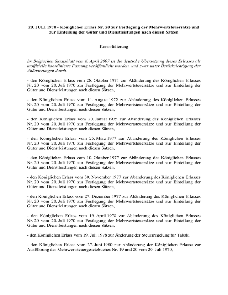 20. JULI 1970 - Königlicher Erlass Nr. 20 zur Festlegung der Mehrwertsteuersätze und zur Einteilung der Güter und Dienstleistungen nach diesen Sätzen Konsolidierung Im Belgischen Staatsblatt vom 6. April 2007 ist die deutsche Übersetzung dieses Erlasses als inoffizielle koordinierte Fassung veröffentlicht worden, und zwar unter Berücksichtigung der Abänderungen durch: - den Königlichen Erlass vom 28. Oktober 1971 zur Abänderung des Königlichen Erlasses Nr. 20 vom 20. Juli 1970 zur Festlegung der Mehrwertsteuersätze und zur Einteilung der Güter und Dienstleistungen nach diesen Sätzen, - den Königlichen Erlass vom 11. August 1972 zur Abänderung des Königlichen Erlasses Nr. 20 vom 20. Juli 1970 zur Festlegung der Mehrwertsteuersätze und zur Einteilung der Güter und Dienstleistungen nach diesen Sätzen, - den Königlichen Erlass vom 20. Januar 1975 zur Abänderung des Königlichen Erlasses Nr. 20 vom 20. Juli 1970 zur Festlegung der Mehrwertsteuersätze und zur Einteilung der Güter und Dienstleistungen nach diesen Sätzen, - den Königlichen Erlass vom 25. März 1977 zur Abänderung des Königlichen Erlasses Nr. 20 vom 20. Juli 1970 zur Festlegung der Mehrwertsteuersätze und zur Einteilung der Güter und Dienstleistungen nach diesen Sätzen, - den Königlichen Erlass vom 10. Oktober 1977 zur Abänderung des Königlichen Erlasses Nr. 20 vom 20. Juli 1970 zur Festlegung der Mehrwertsteuersätze und zur Einteilung der Güter und Dienstleistungen nach diesen Sätzen, - den Königlichen Erlass vom 30. November 1977 zur Abänderung des Königlichen Erlasses Nr. 20 vom 20. Juli 1970 zur Festlegung der Mehrwertsteuersätze und zur Einteilung der Güter und Dienstleistungen nach diesen Sätzen, - den Königlichen Erlass vom 27. Dezember 1977 zur Abänderung des Königlichen Erlasses Nr. 20 vom 20. Juli 1970 zur Festlegung der Mehrwertsteuersätze und zur Einteilung der Güter und Dienstleistungen nach diesen Sätzen, - den Königlichen Erlass vom 19. April 1978 zur Abänderung des Königlichen Erlasses Nr. 20 vom 20. Juli 1970 zur Festlegung der Mehrwertsteuersätze und zur Einteilung der Güter und Dienstleistungen nach diesen Sätzen, - den Königlichen Erlass vom 19. Juli 1978 zur Änderung der Steuerregelung für Tabak, - den Königlichen Erlass vom 27. Juni 1980 zur Abänderung der Königlichen Erlasse zur Ausführung des Mehrwertsteuergesetzbuches Nr. 19 und 20 vom 20. Juli 1970, - den Königlichen Erlass vom 26. September 1980 zur Abänderung des Königlichen Erlasses Nr. 20 vom 20. Juli 1970 zur Festlegung der Mehrwertsteuersätze und zur Einteilung der Güter und Dienstleistungen nach diesen Sätzen, - den Königlichen Erlass vom 29. September 1980 zur Abänderung des Königlichen Erlasses Nr. 20 vom 20. Juli 1970 zur Festlegung der Mehrwertsteuersätze und zur Einteilung der Güter und Dienstleistungen nach diesen Sätzen, - den Königlichen Erlass vom 10. November 1980 zur Einführung einer Sondersteuer auf Luxusgüter, - den Königlichen Erlass vom 19. Juni 1981 zur Abänderung des Königlichen Erlasses Nr. 20 vom 20. Juli 1970 zur Festlegung der Mehrwertsteuersätze und zur Einteilung der Güter und Dienstleistungen nach diesen Sätzen, - den Königlichen Erlass vom 29. Juli 1981 zur Abänderung des Königlichen Erlasses Nr. 20 vom 20. Juli 1970 zur Festlegung der Mehrwertsteuersätze und zur Einteilung der Güter und Dienstleistungen nach diesen Sätzen, - den Königlichen Erlass Nr. 9 vom 15. Februar 1982 zur Abänderung des Mehrwertsteuergesetzbuches und des Königlichen Erlasses Nr. 20 vom 20. Juli 1970 zur Festlegung der Mehrwertsteuersätze und zur Einteilung der Güter und Dienstleistungen nach diesen Sätzen, - den Königlichen Erlass vom 12. März 1982 zur Änderung der Steuerregelung für Tabak, - den Königlichen Erlass vom 16. November 1982 zur Abänderung des Königlichen Erlasses Nr. 20 vom 20. Juli 1970 zur Festlegung der Mehrwertsteuersätze und zur Einteilung der Güter und Dienstleistungen nach diesen Sätzen, - den Königlichen Erlass vom 29. Dezember 1983 zur Abänderung der Königlichen Erlasse Nr. 4 und 20 über die Mehrwertsteuer und der Allgemeinen Verordnung über die der Stempelsteuer gleichgesetzten Steuern, - den Königlichen Erlass vom 18. Juli 1986 zur Abänderung des Königlichen Erlasses Nr. 20 vom 20. Juli 1970 zur Festlegung der Mehrwertsteuersätze und zur Einteilung der Güter und Dienstleistungen nach diesen Sätzen, - den Königlichen Erlass vom 20. Dezember 1989 zur Abänderung des Königlichen Erlasses Nr. 20 vom 20. Juli 1970 zur Festlegung der Mehrwertsteuersätze und zur Einteilung der Güter und Dienstleistungen nach diesen Sätzen, - den Königlichen Erlass vom 25. April 1990 zur Abänderung des Königlichen Erlasses Nr. 20 vom 20. Juli 1970 zur Festlegung der Mehrwertsteuersätze und zur Einteilung der Güter und Dienstleistungen nach diesen Sätzen, - den Königlichen Erlass vom 17. März 1992 zur Abänderung des Königlichen Erlasses Nr. 20 vom 20. Juli 1970 zur Festlegung der Mehrwertsteuersätze und zur Einteilung der Güter und Dienstleistungen nach diesen Sätzen und des Königlichen Erlasses vom 10. November 1980 zur Einführung einer Sondersteuer auf Luxusgüter, - den Königlichen Erlass vom 28. März 1992 zur Abänderung des Königlichen Erlasses Nr. 20 vom 20. Juli 1970 zur Festlegung der Mehrwertsteuersätze und zur Einteilung der Güter und Dienstleistungen nach diesen Sätzen, - den Königlichen Erlass vom 29. Juni 1992 zur Abänderung des Königlichen Erlasses Nr. 20 vom 20. Juli 1970 zur Festlegung der Mehrwertsteuersätze und zur Einteilung der Güter und Dienstleistungen nach diesen Sätzen, - den Königlichen Erlass vom 30. September 1992 zur Abänderung des Königlichen Erlasses Nr. 20 vom 20. Juli 1970 zur Festlegung der Mehrwertsteuersätze und zur Einteilung der Güter und Dienstleistungen nach diesen Sätzen, - den Königlichen Erlass vom 29. Dezember 1992 zur Abänderung des Königlichen Erlasses 