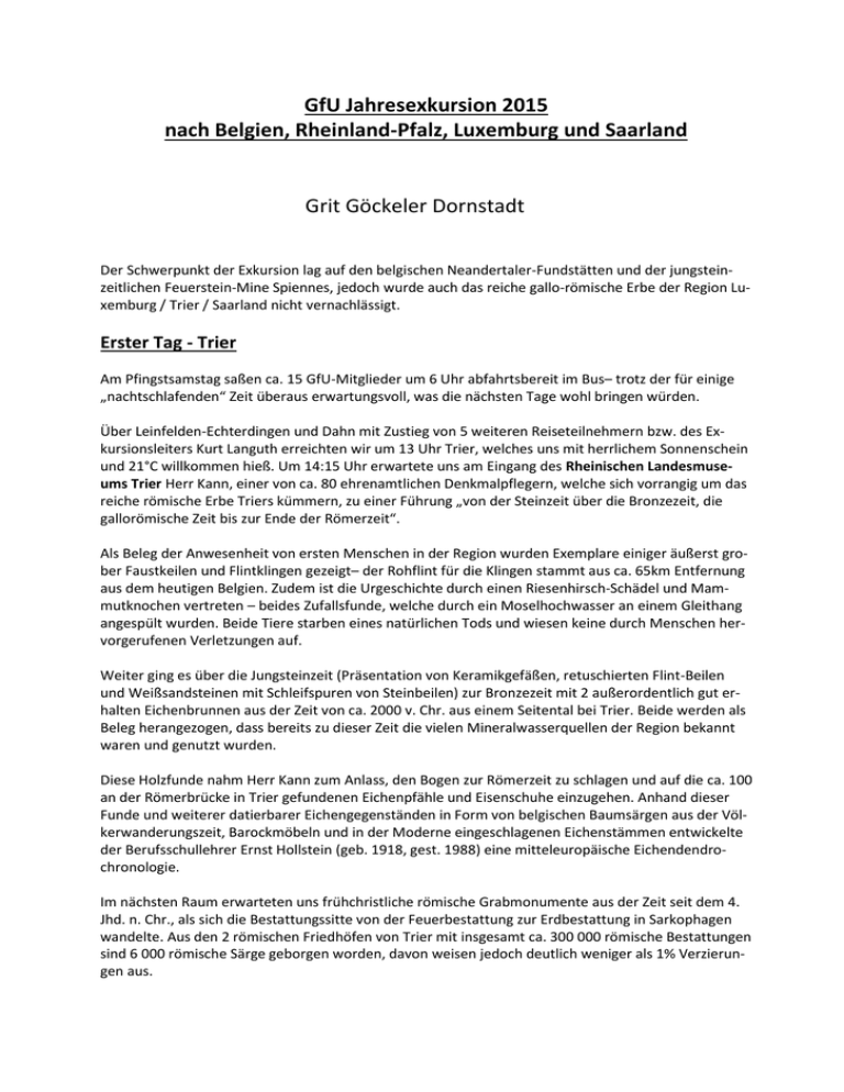 GfU Jahresexkursion 2015 nach Belgien, Rheinland-Pfalz, Luxemburg und Saarland Grit Göckeler Dornstadt Der Schwerpunkt der Exkursion lag auf den belgischen Neandertaler-Fundstätten und der jungsteinzeitlichen Feuerstein-Mine Spiennes, jedoch wurde auch das reiche gallo-römische Erbe der Region Luxemburg / Trier / Saarland nicht vernachlässigt. Erster Tag - Trier Am Pfingstsamstag saßen ca. 15 GfU-Mitglieder um 6 Uhr abfahrtsbereit im Bus– trotz der für einige „nachtschlafenden“ Zeit überaus erwartungsvoll, was die nächsten Tage wohl bringen würden. Über Leinfelden-Echterdingen und Dahn mit Zustieg von 5 weiteren Reiseteilnehmern bzw. des Exkursionsleiters Kurt Languth erreichten wir um 13 Uhr Trier, welches uns mit herrlichem Sonnenschein und 21°C willkommen hieß. Um 14:15 Uhr erwartete uns am Eingang des Rheinischen Landesmuseums Trier Herr Kann, einer von ca. 80 ehrenamtlichen Denkmalpflegern, welche sich vorrangig um das reiche römische Erbe Triers kümmern, zu einer Führung „von der Steinzeit über die Bronzezeit, die gallorömische Zeit bis zur Ende der Römerzeit“. Als Beleg der Anwesenheit von ersten Menschen in der Region wurden Exemplare einiger äußerst grober Faustkeilen und Flintklingen gezeigt– der Rohflint für die Klingen stammt aus ca. 65km Entfernung aus dem heutigen Belgien. Zudem ist die Urgeschichte durch einen Riesenhirsch-Schädel und Mammutknochen vertreten – beides Zufallsfunde, welche durch ein Moselhochwasser an einem Gleithang angespült wurden. Beide Tiere starben eines natürlichen Tods und wiesen keine durch Menschen hervorgerufenen Verletzungen auf. Weiter ging es über die Jungsteinzeit (Präsentation von Keramikgefäßen, retuschierten Flint-Beilen und Weißsandsteinen mit Schleifspuren von Steinbeilen) zur Bronzezeit mit 2 außerordentlich gut erhalten Eichenbrunnen aus der Zeit von ca. 2000 v. Chr. aus einem Seitental bei Trier. Beide werden als Beleg herangezogen, dass bereits zu dieser Zeit die vielen Mineralwasserquellen der Region bekannt waren und genutzt wurden. Diese Holzfunde nahm Herr Kann zum Anlass, den Bogen zur Römerzeit zu schlagen und auf die ca. 100 an der Römerbrücke in Trier gefundenen Eichenpfähle und Eisenschuhe einzugehen. Anhand dieser Funde und weiterer datierbarer Eichengegenständen in Form von belgischen Baumsärgen aus der Völkerwanderungszeit, Barockmöbeln und in der Moderne eingeschlagenen Eichenstämmen entwickelte der Berufsschullehrer Ernst Hollstein (geb. 1918, gest. 1988) eine mitteleuropäische Eichendendrochronologie. Im nächsten Raum erwarteten uns frühchristliche römische Grabmonumente aus der Zeit seit dem 4. Jhd. n. Chr., als sich die Bestattungssitte von der Feuerbestattung zur Erdbestattung in Sarkophagen wandelte. Aus den 2 römischen Friedhöfen von Trier mit insgesamt ca. 300 000 römische Bestattungen sind 6 000 römische Särge geborgen worden, davon weisen jedoch deutlich weniger als 1% Verzierungen aus. Im selben Raum zog eine uns als „Venus von St. Matthias“ vorgestellte Figur unsere Aufmerksamkeit an– ein überlebensgroßer Stein-Torso, welcher seit Jahrhunderten vor der Kirche St. Matthias steht und in seinem jetzigen Zustand durchaus Anklänge an entsprechende amorphe altsteinzeitliche Statuen aufweist. Nach urkundlicher Überlieferung handelt es sich hierbei jedoch um eine halbnackte weibliche Götterstatue (Venus (?)) aus der Römerzeit. Ein erstes Zerstören der Figur– das Zerbrechen als Zeichen der Überwindung des Heidentums– wird mit der Berufung der ersten frühchristlichen Bischöfe Triers in Verbindung gebracht. Nach der Ortslegende bewarfen Einheimische und Wallfahrer in den nachfolgenden Jahrhunderten das als „heidnisch“ geltende Bildwerk mit Steinen und verstümmelten es so bis zur Unkenntlichkeit. Nach dieser langsamen Steigerung erwartete uns zum Schluss das Highlight des Museums, der größte jemals gefundene Goldschatz der römischen Kaiserzeit: Gefunden wurde dieser 1993 beim Bau eines Parkhauses in der Trierer Feldstrasse - im Bereich einer römischen Wohnbebauung des 2.–4. Jhd. n. Chr. wurde ein Kellersystem freigelegt und bei zusätzlichen Ausschachtungen hatte die Baggerschaufel unbemerkt ein mit Goldmünzen gefülltes Bronzegefäß auseinander gerissen. Der initiale Aushub (Gefäßoberteil mit Münzen) gelangte- ohne auf die Münzen zu achten- größtenteils auf den Kockelsberg, wo er zur Herrichtung eines Parkplatzes abgekippt wurde. Das Unterteil des Gefäßes konnte jedoch in der ursprünglichen Baustelle sichergestellt werden- zusammen mit dem Löwenanteil der Münzen (ca. 2000). Weitere ca. 500 Münzen wurden von Denkmalpflegern am Kockelsberg aufgelesen. Der Schatz ist somit zu ca. 96% komplett und besteht aus 18,5 Kg Gold. Da sich das römische Wohnhaus in unmittelbarer Nachbarschaft eines Tempels am Moselufer befand, handelt es sich vermutlich um einen Tempelschatz, welcher um 200 n. Chr. vergraben wurde. Die Herkunft des für den Schatz verwendeten Goldes wurde bisher nicht analysiert- es wurde die Vermutung geäußert, dass es sich auch um eingeschmolzene älteren Goldgegenstände handeln könnte und somit ein Herkunftsnachweis sehr erschwert bzw. unmöglich wäre. Generell sind aus der Römerzeit Goldvorkommen aus Spanien, Irland und Siebenbürgen bekannt. Erschöpft von so viel geistigem Input starteten wir zur Stadtrundfahrt mit dem eigenen Bus, geführt durch Herr Kann. Nach kurzem Zwischenstopp an einem Aussichtspunkt über Trier besuchten wir das Amphitheaters am Petrisberg aus dem Beginn des 2. Jhd. n. Chr., wo uns an der Außenwand das Plakat einer Gladiatorenschule mit einer etwas doch befremdlichen Ausbildungsoffensive empfing: „Werde Gladiator“ – gefolgt von einer Internet-Adresse. Wir erfuhren, dass in dem ca. 18 0000 Besucher umfassenden Komplex morgens Tierhatzen (venationes), mittags Hinrichtung (damnatio ad bestias) und nachmittags Gladiatorenkämpfe stattfanden. Aber auch religiöse Feste oder 