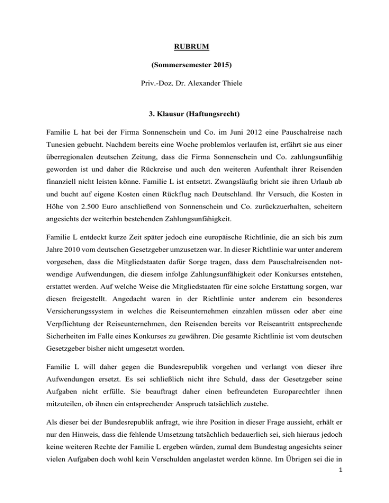 RUBRUM (Sommersemester 2015) Priv.-Doz. Dr. Alexander Thiele 3. Klausur (Haftungsrecht) Familie L hat bei der Firma Sonnenschein und Co. im Juni 2012 eine Pauschalreise nach Tunesien gebucht. Nachdem bereits eine Woche problemlos verlaufen ist, erfährt sie aus einer überregionalen deutschen Zeitung, dass die Firma Sonnenschein und Co. zahlungsunfähig geworden ist und daher die Rückreise und auch den weiteren Aufenthalt ihrer Reisenden finanziell nicht leisten könne. Familie L ist entsetzt. Zwangsläufig bricht sie ihren Urlaub ab und bucht auf eigene Kosten einen Rückflug nach Deutschland. Ihr Versuch, die Kosten in Höhe von 2.500 Euro anschließend von Sonnenschein und Co. zurückzuerhalten, scheitern angesichts der weiterhin bestehenden Zahlungsunfähigkeit. Familie L entdeckt kurze Zeit später jedoch eine europäische Richtlinie, die an sich bis zum Jahre 2010 vom deutschen Gesetzgeber umzusetzen war. In dieser Richtlinie war unter anderem vorgesehen, dass die Mitgliedstaaten dafür Sorge tragen, dass dem Pauschalreisenden notwendige Aufwendungen, die diesem infolge Zahlungsunfähigkeit oder Konkurses entstehen, erstattet werden. Auf welche Weise die Mitgliedstaaten für eine solche Erstattung sorgen, war diesen freigestellt. Angedacht waren in der Richtlinie unter anderem ein besonderes Versicherungssystem in welches die Reiseunternehmen einzahlen müssen oder aber eine Verpflichtung der Reiseunternehmen, den Reisenden bereits vor Reiseantritt entsprechende Sicherheiten im Falle eines Konkurses zu gewähren. Die gesamte Richtlinie ist vom deutschen Gesetzgeber bisher nicht umgesetzt worden. Familie L will daher gegen die Bundesrepublik vorgehen und verlangt von dieser ihre Aufwendungen ersetzt. Es sei schließlich nicht ihre Schuld, dass der Gesetzgeber seine Aufgaben nicht erfülle. Sie beauftragt daher einen befreundeten Europarechtler ihnen mitzuteilen, ob ihnen ein entsprechender Anspruch tatsächlich zustehe. Als dieser bei der Bundesrepublik anfragt, wie ihre Position in dieser Frage aussieht, erhält er nur den Hinweis, dass die fehlende Umsetzung tatsächlich bedauerlich sei, sich hieraus jedoch keine weiteren Rechte der Familie L ergeben würden, zumal dem Bundestag angesichts seiner vielen Aufgaben doch wohl kein Verschulden angelastet werden könne. Im Übrigen sei die in 1 der Richtlinie vorgesehene Umsetzungsfrist viel zu kurz bemessen gewesen. Eine fristgemäße Umsetzung sei insofern ohnehin nicht möglich gewesen. 1. Erstellen Sie das verlangte Gutachten und beantworten Sie die Frage, ob Familie L einen Anspruch gegen die Bundesrepublik auf Zahlung von 2.500 Euro hat 2. Sofern Ansprüche bestehen: In welchem Rechtsweg wären diese geltend zu machen? 2 Lösung Vorüberlegung: Dieser mittelschwere Fall behandelt den mitgliedstaatlichen Staatshaftungsanspruch, den der EuGH ohne eine ausdrückliche Rechtsgrundlage aus dem effet-utile Gedanken entwickelt hat. Die Frage, ob dies eine noch zulässige Rechtsfortbildung oder bereits eine unzulässige Rechtssetzung ist, war daher vor allem in der Anfangszeit höchst umstritten. Mittlerweile sind diese Grundsätze jedoch allgemein anerkannt. Sie müssen daher auch dem Pflichtfachkandidaten bekannt sein, da der mitgliedstaatliche Staatshaftungsanspruch unter Umständen zu gewissen Modifikationen auch des nationalen Staatshaftungsrechts führt. Überblick dazu bei Thiele, Europarecht, § 9. Ausführlich Thiele, Haftungsrecht, in: Terhechte, Verwaltungsrecht der EU, 2011, § 39. A. Beantwortung der ersten Frage Mit der ersten Frage möchte Familie L wissen, ob sie einen Anspruch gegen die Bundesrepublik auf Ersatz ihrer Aufwendungen in Höhe von 2.500 Euro hat. Ein solcher Anspruch kommt dabei zunächst unmittelbar aus der Richtlinie in Betracht (I). Sofern dies nicht der Fall ist, sind nationale (II) und anschließend europäische (III) Staatshaftungsansprüche zu untersuchen. I. Anspruch direkt aus der Richtlinie Möglicherweise ergibt sich ein Anspruch der Familie L unmittelbar aus der Richtlinie selbst. Dies setzt voraus, dass die Richtlinie ausnahmsweise eine unmittelbare Wirkung entfaltet. Hinweis: Beachten Sie, dass Sie den Anspruch unmittelbar aus der Richtlinie vor möglichen Staatshaftungsansprüchen prüfen müssen. Sofern ein solcher Anspruch besteht, scheiden sekundäre Staatshaftungsansprüche aus, da der primäre Anspruch aus der Richtlinie einen weitergehenden Schaden ausschließt. 1. Voraussetzungen einer unmittelbaren Wirkung Grds. entfalten Richtlinien keine unmittelbare Wirkung im innerstaatlichen Rechtssystem. Erforderlich ist vielmehr regelmäßig die Umsetzung der Richtlinienbestimmungen in nationales Recht.1 Dies folgt aus der Überlegung, dass Richtlinien nach Art. 288 II AEU ausschließlich an die Mitgliedstaaten adressiert sind und allein diese verpflichten, die Bestimmungen in nationales Recht umzusetzen; es handelt sich bei der Richtlinie damit um einen zweistufigen Rechtsakt, der dem deutschen Rahmengesetz vergleichbar ist.2 Um die praktische Wirksamkeit des Unionsrechts zu gewährleisten, anerkennt der EuGH jedoch unter gewissen Voraussetzungen auch eine unmittelbare Wirkung von Richtlinien, die es dem Einzelnen ermöglicht, sich jedenfalls gegenüber dem Staat unmittelbar auf Rechte aus der Richtlinie zu berufen.3 Eine solche unmittelbare Wirkung setzt dabei nach der Rechtsprechung des EuGH voraus, dass die Umsetzungsfrist abgelaufen ist und dass die sich aus der Richtlinie ergebenden Rechte des Einzelnen hinreichend bestimmt und unbedingt sind. Der zweite Punkt setzt damit voraus, dass sich allein aus der in Frage kommenden Richtlinienbestimmung selbst ergibt, welchen Inhalt das von ihr vermittelte Recht hat und wer dabei als Berechtigter und auch als Verpflichteter anzusehen ist. 1 2 3 Hobe, Europarecht Rn 140. Konsequenterweise bezeichnete der Europäische Verfassungsvertrag die bisherige Richtlinie in Art. I-33 II EVV nunmehr als Europäisches Rahmengesetz. Im Vertrag von Lissabon ist die
