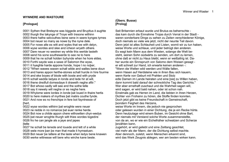 Winner and Waster WYNNERE AND WASTOURE [Prologue] (Übers. Busse) [Prolog] 0001 Sythen that Bretayne was biggede and Bruyttus it aughte 0002 thurgh the takynge of Troye with tresone withinn 0003 there hathe selcouthes bene sene in seere kynges tymes 0004 bot neuer so many as nowe by the nyne dele. 0005 For nowe alle es witt and wyles that we with delyn, 0006 wyse wordes and slee and icheon wryeth othere. 0007 Dare neuer no westren wy while this werlde lasteth 0008 send his sone southewarde to see ne to here 0009 that he ne schall holden byhynde when he hore eldes. 0010 Forthi sayde was a sawe of Salomon the wyse, 0011 it hyeghte harde appone honde, hope I no noþer, 0012 "When wawes waxen schall wilde and walles bene doun 0013 and hares appon herthe-stones schall hurcle in hire fourme 0014 and eke boyes of blode with boste and with pryde 0015 schall wedde ladyes in londe and lede hir at will, 0016 thene dredfull domesdaye it draweth neghe aftir." 0017 Bot whoso sadly will see and the sothe telle 0018 say it newely will neghe or es neghe here. 0019 Whylome were lordes in londe þat loued in thaire hertis 0020 to here makers of myrthes þat matirs couthe fynde. 0021 And now es no frenchipe in fere bot fayntnesse of [hert, 0022 wyse wordes withinn þat wroghte were neuer 0023 ne redde in no romance þat euer renke herde. 0024 Bot now a childe appon chere withowtten chyn-wedys 0025 þat neuer wroghte thurgh witt thies wordes togedire 0026 fro he can jangle als a jaye and japes [telle 0027 he schall be lenede and louede and lett of a while 0028 wele more þan þe man that made it hymseluen. 0029 Bot neuer þe lattere at the laste when ledys bene knawen 0030 werke wittnesse will bere who wirche kane beste. Seit Britannien erbaut wurde und Brutus es beherrschte das kam durch die Einnahme Trojas durch Verrat in der Stadt waren sonderbare Dinge zu sehen zu Zeiten verschiedener Könige, doch niemals so viele wie jetzt, nicht der neunte Teil davon. Denn jetzt ist alles Schlauheit und Listen, womit wir zu tun haben, weise Worte und schlaue, und jeder betrügt den anderen. Es wagt kein Mann aus dem Westen, solange die Welt besteht, seinen Sohn südwärts zu senden, um dort zu lernen, ohne daß er nicht zu Haus bleibt, wenn er weißaltrig ist. Daher wurde ein Sinnspruch von Salomo dem Weisen gesagt er eilt schnell zur Hand, ich erwarte keinen anderen -: "Wenn die Wellen wild werden und Wälle fallen, wenn Hasen auf Herdsteine wie in ihren Bau sich kauern, wenn Kerle von Geburt mit Prahlen und Stolz edle Damen im Lande heiraten und eine [sie] zu Willen haben, dann kommt bald darauf der schreckliche Tag des Gerichts." Wer aber ernsthaft zuschaut und die Wahrheit sagen will, wird sagen, er wird bald nahen, oder ist schon nah. Einstmals gab es Herren im Land, die liebten in ihren Herzen, Dichter von Frohsinn zu hören, die Stoffe finden konnten. Doch jetzt gibt es keine Freundschaft in Gemeinschaft, [sondern Feigheit des Herzens, weise Worte im Innern, die jedoch nie gesprochen oder gelesen wurden in einer Dichtung, die je ein Recke hörte. Denn heutzutage wird einem Buben, im Gesicht ohne Bart, der niemals mit Verstand solche Worte zusammenstellte, von da an, wo er wie ein Eichelhäher schwatzen und Scherze [erzählen kann, zugehört, er wird geliebt und eine Zeitlang geachtet, viel mehr als der Mann, der die Dichtung selbst machte. Aber dennoch, zuletzt, wenn Menschen erkannt sind, wird das Werk Zeugnis ablegen, wer am besten wirken kann. 1 Winner and Waster [Fitt I] [Fitte I] 0031 Bot I schall tell yow a tale þat me bytyde ones, 0032 als I went in the weste wandrynge myn one. 0033 Bi a bonke of a bourne bryghte was the sonne, 0034 vndir a worthiliche wodde by a wale medewe 0035 fele floures gan folde ther my fote steppede. 0036 I layde myn hede one ane hill ane hawthorne besyde; 0037 the throstills full throly they threpen togedire 0038 hipped vp heghwalles fro heselis tyll othire 0039 bernacles with thayre billes one barkes þay [roungen 0040 þe jay janglede one heghe, jarmede the foles, 0041 þe bourne full bremly rane þe bankes bytwene. 0042 So ruyde were þe roughe stremys and raughten so heghe 0043 that it was neghande nyghte or I nappe myghte 0044 for dyn of the depe watir and dadillyng of [fewllys. 0045 Bot as I laye at the laste þan lowked myn eghne 0046 and I was swythe in a sweuen sweped belyue. 0047 Me thoghte I was in the werlde, I ne wiste in whate ende, 0048 one a loueliche lande þat was ylike grene 0049 þat laye loken by a lawe the lengthe of a [myle. 0050 In aythere holte was ane here in hawberkes full brighte, 0051 harde hattes appon hedes and helmys with crestys; 0052 brayden owte thaire baners bown for to mete, 0053 schowen owte of the schawes in schiltrons þay felle; 0054 and bot the lengthe of a launde thies lordes bytwene. 0055 And alle prayed for the pese till the prynce come 0056 for he was worthiere in witt than any wy ells 0057 for to ridde and to rede and to rewlyn the wrothe 0058 that aythere here appon hate had vntill othere. 0059 At the creste of a clyffe a caban was rerede 0060 alle raylede with rede the rofe and the sydes 0061 with Ynglysse besantes full brighte betyn of golde 0062 and ichone gayly vmbygone with garters of inde 0063 and iche a gartare of golde gerede full riche. Doch ich werde euch etwas erzählen, was mir einst geschah, als ich im Westen ging, für mich allein wandernd. Am Ufer eines Flusses schien hell die Sonne, unter einem prächtigen Wald, an einem schönen Wiesengrund entfalteten sich viele Blumen, wo mein Fuß hintrat. Ich legte meinen Kopf auf einen Hügel neben einen Hagedorn; die Drosseln zankten heftig miteinander, Spechte hüpften von einem Haselstrauch zum andern hinauf, Ringelgänse machten mit ihren Schnäbeln an Rinden ein [klingendes Geräusch, der Eichelhäher kreischte laut, es zwitscherten die Vögel, der Fluß strömte geräuschvoll und schnell zwischen den Ufern. So laut waren die rauhen Ströme und erreichten solche Höhe, d