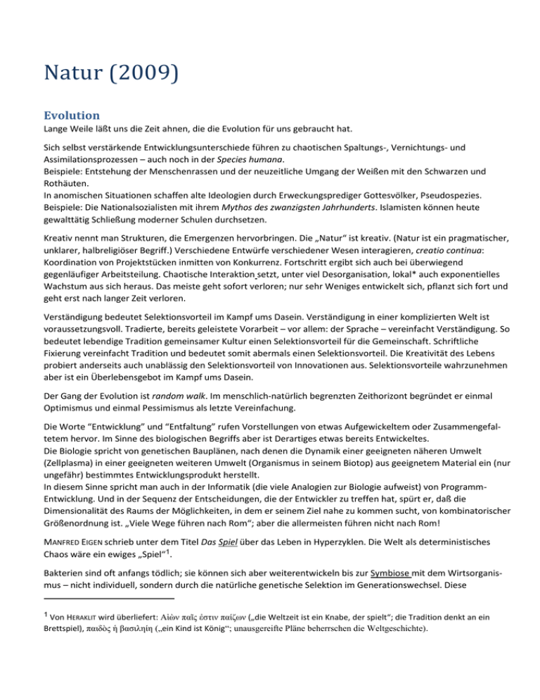 Natur (2009) Evolution Lange Weile läßt uns die Zeit ahnen, die die Evolution für uns gebraucht hat. Sich selbst verstärkende Entwicklungsunterschiede führen zu chaotischen Spaltungs-, Vernichtungs- und Assimilationsprozessen – auch noch in der Species humana. Beispiele: Entstehung der Menschenrassen und der neuzeitliche Umgang der Weißen mit den Schwarzen und Rothäuten. In anomischen Situationen schaffen alte Ideologien durch Erweckungsprediger Gottesvölker, Pseudospezies. Beispiele: Die Nationalsozialisten mit ihrem Mythos des zwanzigsten Jahrhunderts. Islamisten können heute gewalttätig Schließung moderner Schulen durchsetzen. Kreativ nennt man Strukturen, die Emergenzen hervorbringen. Die „Natur“ ist kreativ. (Natur ist ein pragmatischer, unklarer, halbreligiöser Begriff.) Verschiedene Entwürfe verschiedener Wesen interagieren, creatio continua: Koordination von Projektstücken inmitten von Konkurrenz. Fortschritt ergibt sich auch bei überwiegend gegenläufiger Arbeitsteilung. Chaotische Interaktion setzt, unter viel Desorganisation, lokal* auch exponentielles Wachstum aus sich heraus. Das meiste geht sofort verloren; nur sehr Weniges entwickelt sich, pflanzt sich fort und geht erst nach langer Zeit verloren. Verständigung bedeutet Selektionsvorteil im Kampf ums Dasein. Verständigung in einer komplizierten Welt ist voraussetzungsvoll. Tradierte, bereits geleistete Vorarbeit – vor allem: der Sprache – vereinfacht Verständigung. So bedeutet lebendige Tradition gemeinsamer Kultur einen Selektionsvorteil für die Gemeinschaft. Schriftliche Fixierung vereinfacht Tradition und bedeutet somit abermals einen Selektionsvorteil. Die Kreativität des Lebens probiert anderseits auch unablässig den Selektionsvorteil von Innovationen aus. Selektionsvorteile wahrzunehmen aber ist ein Überlebensgebot im Kampf ums Dasein. Der Gang der Evolution ist random walk. Im menschlich-natürlich begrenzten Zeithorizont begründet er einmal Optimismus und einmal Pessimismus als letzte Vereinfachung. Die Worte “Entwicklung” und “Entfaltung” rufen Vorstellungen von etwas Aufgewickeltem oder Zusammengefaltetem hervor. Im Sinne des biologischen Begriffs aber ist Derartiges etwas bereits Entwickeltes. Die Biologie spricht von genetischen Bauplänen, nach denen die Dynamik einer geeigneten näheren Umwelt (Zellplasma) in einer geeigneten weiteren Umwelt (Organismus in seinem Biotop) aus geeignetem Material ein (nur ungefähr) bestimmtes Entwicklungsprodukt herstellt. In diesem Sinne spricht man auch in der Informatik (die viele Analogien zur Biologie aufweist) von ProgrammEntwicklung. Und in der Sequenz der Entscheidungen, die der Entwickler zu treffen hat, spürt er, daß die Dimensionalität des Raums der Möglichkeiten, in dem er seinem Ziel nahe zu kommen sucht, von kombinatorischer Größenordnung ist. „Viele Wege führen nach Rom“; aber die allermeisten führen nicht nach Rom! MANFRED EIGEN schrieb unter dem Titel Das Spiel über das Leben in Hyperzyklen. Die Welt als deterministisches Chaos wäre ein ewiges „Spiel“1. Bakterien sind oft anfangs tödlich; sie können sich aber weiterentwickeln bis zur Symbiose mit dem Wirtsorganismus – nicht individuell, sondern durch die natürliche genetische Selektion im Generationswechsel. Diese 1 Von HERAKLIT wird überliefert: Αἰὼν παῖς ἐστιν παίζων („die Weltzeit ist ein Knabe, der spielt“; die Tradition denkt an ein Brettspiel), παιδὸς ἡ βασιληίη („ein Kind ist König“; unausgereifte Pläne beherrschen die Weltgeschichte). Error! Use the Home tab to apply Titel to the text that you want to appear here., Error! Use the Home tab to apply Überschrift 1 to the text that you want to appear here., 2 erfolgreiche Variation verbreitet sich durch Gen-Austausch zwischen verschiedenartigen Bakterien. (Sofort fallen einem dazu memetische Analogien ein.) Begabungen sind in einer stabilen Umwelt Halbfertigprodukte; sie sind umweltabhängig realisierbare Möglichkeiten. Meist kann nur ein kleiner Teil davon entwickelt und direkt ausgelebt werden. In der Regel kommen sie nur indirekt, geschwächt und verbogen zur Wirkung, enttäuschend – aber für die Evolution immer noch genug. Darwin (Origin, 1859) versteht die Entstehung der Arten aus dem Zufall („accidit“) der Interaktion von Dingen, die eigentlich (essentialiter) nichts mit einander zu tun haben. Der Zufall generiert Wesentliches! Ärgernisse sind Entwicklungsspannungen zwischen überzogener Vergeistigung und Rückständigkeit. (Analoges ereignet sich auf allen evolutionären Niveaus.) Überzogene Geistigkeit wird gedemütigt; dann ist Demut entspannend. Wo immer Identität durchgehalten wird, gibt es per definitionem eine entsprechende, selbsterhaltende Dynamik. Invenire heißt: auf etwas (schon Vorhandenes) stoßen. „Erfinden“ ist auffinden. Die Suchbewegung hat sich in der Neuzeit als immer wichtiger erwiesen! Allererst die richtige Suche und Forschung muss gefunden werden. Die Kreativität der Erfindung beginnt mit der bescheidenen Einstellung auf das Vorgegebene. Im Menschen hat die Natur ihre Kreativität auf die Spitze getrieben. Unser praktisches Zurechtkommen impliziert Kreativität (Hans Joas). Mathematik ist eine Spielart der Reflexion, die derzeit wohl des Menschen entscheidener Selektionsvorteil ist. Es ist allerdings schon abzusehen, dass der explodierende Erfolg der Menschheit den Garaus machen wird. Evolution beansprucht die Ressourcen einer Spezies nicht nur stetig und vorhersehbar, sondern, zufallsbedingt, auch unvorhersehbar so beschleunigt, dass die Spezies sich nicht mehr auch daran anpassen kann. Das endet in Zerstörung der eigenen Voraussetzungen. Am unberechenbarsten ist die species humana, – und zwar gerade deshalb, weil sie rechnen kann! Der Mensch hat eigene Ideen, er hofft auf Erfolg und hat damit meist Misserfolg. Denn Ideen sind Abweichungen vom praktisch Bewährten, Material der Evolution; und 