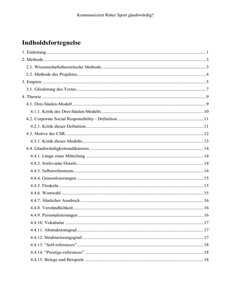 Kommuniziert Ritter Sport glaubwürdig? Indholdsfortegnelse 1. Einleitung ......................................................................................................................................... 1 2. Methode ........................................................................................................................................... 3 2.1. Wissenschaftstheoretische Methode.......................................................................................... 3 2.2. Methode des Projektes............................................................................................................... 4 3. Empirie ............................................................................................................................................. 5 3.1. Gliederung des Textes ............................................................................................................... 7 4. Theorie ............................................................................................................................................. 9 4.1. Drei-Säulen-Modell ................................................................................................................... 9 4.1.1. Kritik des Drei-Säulen-Modells ........................................................................................ 10 4.2. Corporate Social Responsibility - Definition .......................................................................... 11 4.2.1. Kritik dieser Definition ..................................................................................................... 11 4.3. Motive der CSR ....................................................................................................................... 12 4.3.1. Kritik dieses Modells ........................................................................................................ 13 4.4. Glaubwürdigkeitsindikatoren .................................................................................................. 14 4.4.1. Länge einer Mitteilung ..................................................................................................... 14 4.4.2. Irrelevante Details ............................................................................................................. 14 4.4.3. Selbstreferenzen ................................................................................................................ 14 4.4.4. Generalisierungen ............................................................................................................. 15 4.4.5. Floskeln............................................................................................................................. 15 4.4.6. Wortwahl .......................................................................................................................... 15 4.4.7. Ähnlicher Ausdruck .......................................................................................................... 16 4.4.8. Verständlichkeit ................................................................................................................ 16 4.4.9. Personalisierungen ............................................................................................................ 16 4.4.10. Vokabular ....................................................................................................................... 17 4.4.11. Abstraktionsgrad ............................................................................................................. 17 4.4.12. Strukturierungsgrad ........................................................................................................ 17 4.4.13. “Self-references”............................................................................................................. 18 4.4.14. “Prestige-references” ...................................................................................................... 18 4.4.15. Belege und Beispiele ...................................................................................................... 18 Kommuniziert Ritter Sport glaubwürdig? 4.4.16. Sympathieeinschätzung .................................................................................................. 19 4.4.17. “Egoinvolvement” .......................................................................................................... 19 4.4.18. “Issueinvolvement”......................................................................................................... 19 4.4.19. Ähnlichkeit ..................................................................................................................... 20 4.4.20. Quantitativer Detaillierungsgrad .................................................................................... 20 4.4.21. Qualitativer Detaillierungsgrad ...................................................................................... 20 4.4.22. Freiwillige Selbstbelastungen ......................................................................................... 20 4.4.23. Wahrheitsbezogene Aussagen ........................................................................................ 21 4.4.24. Aussagekonstanz............................................................................................................. 21 4.4.25. Kritikpunkte dieser Theorie ............................................................................................ 21 4.5. Analysemodell ......................................................................................................................... 22 4.5.1. Beleg für das Analysemodell ............................................................................................ 23 4.5.1.1. Phronesis .................................................................................................................... 24 4.5.1.2. Areté ...........................................................