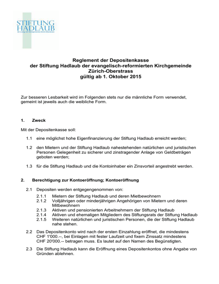 Reglement der Depositenkasse der Stiftung Hadlaub der evangelisch-reformierten Kirchgemeinde Zürich-Oberstrass gültig ab 1. Oktober 2015 Zur besseren Lesbarkeit wird im Folgenden stets nur die männliche Form verwendet, gemeint ist jeweils auch die weibliche Form. 1. Zweck Mit der Depositenkasse soll: 1.1 eine möglichst hohe Eigenfinanzierung der Stiftung Hadlaub erreicht werden; 1.2 den Mietern und der Stiftung Hadlaub nahestehenden natürlichen und juristischen Personen Gelegenheit zu sicherer und zinstragender Anlage von Geldbeträgen geboten werden; 1.3 für die Stiftung Hadlaub und die Kontoinhaber ein Zinsvorteil angestrebt werden. 2. Berechtigung zur Kontoeröffnung; Kontoeröffnung 2.1 Depositen werden entgegengenommen von: 2.1.1 2.1.2 2.1.3 2.1.4 2.1.5 Mietern der Stiftung Hadlaub und deren Mietbewohnern Volljährigen oder minderjährigen Angehörigen von Mietern und deren Mitbewohnern Aktiven und pensionierten Arbeitnehmern der Stiftung Hadlaub Aktiven und ehemaligen Mitgliedern des Stiftungsrats der Stiftung Hadlaub Weiteren natürlichen und juristischen Personen, die der Stiftung Hadlaub nahe stehen. 2.2 Das Depositenkonto wird nach der ersten Einzahlung eröffnet, die mindestens CHF 1'000.--, bei Einlagen mit fester Laufzeit und fixem Zinssatz mindestens CHF 20'000.-- betragen muss. Es lautet auf den Namen des Begünstigten. 2.3 Die Stiftung Hadlaub kann die Eröffnung eines Depositenkontos ohne Angabe von Gründen ablehnen. 3. Einzahlungen 3.1 Der Zahlungsverkehr wird elektronisch abgewickelt (kein Bargeldverkehr). 3.2 Einlagen können durch Bank- oder Postüberweisung geleistet werden. Postquittungen bzw. Bankbelege werden als rechtsgültig anerkannt. 3.3 Auf schriftliche Vereinbarung hin sind Einlagen mit fester Laufzeit und fixem Zinssatz möglich, sofern die Einlage mindestens CHF 20'000.-- beträgt. Der Stiftungsrat der Stiftung Hadlaub legt die Laufzeiten fest. 3.4 Allfällige Bank- und Postgebühren gehen zu Lasten der Kontoinhaber. 3.5 Jede Einzahlung in die Depositenkasse wird schriftlich verdankt. 3.6 Die Stiftung Hadlaub kann die Entgegennahme von Einzahlungen vorübergehend einstellen oder einschränken. 4. Auszahlungen 4.1 Bei den Einlagen in die Depositenkasse handelt es sich um mittel- bis langfristige Anlagen. Deshalb soll die Häufigkeit der Auszahlungen auf ein Minimum beschränkt werden. Ein Depositenkonto dient der Geldanlage und kann nicht das Post- oder Bankkonto ersetzen. 4.2 Pro Konto leistet die Stiftung Hadlaub auf Verlangen Auszahlungen wie folgt, wobei in jedem Fall die gesetzliche Minimaleinlagefrist von sechs Monaten beachtet werden muss: bis CHF 10'000.-- pro Kalendermonat ohne Kündigung über CHF 10'000.-- bis CHF 100'000.-- besteht eine Kündigungsfrist von 3 Monaten über CHF 100'000.-- besteht eine Kündigungsfrist von 6 Monaten In begründeten Fällen kann die Stiftung Hadlaub Beträge über CHF 10'000.-vorzeitig auszahlen. In solchen Fällen wird der Zins für die Zeit ab Auszahlungsdatum bis zum Ende der ordentlichen Kündigungsfrist abgezogen. Es können nicht gleichzeitig mehrere Kündigungen erfolgen. Solange eine Kündigung läuft, kann keine neue erfolgen. 4.3 Begehren um Auszahlung sind schriftlich (Brief, Fax oder E-Mail) mit Angabe der genauen Zahlungsverbindung an die Geschäftsführung der Stiftung Hadlaub zu richten. Die Auszahlung erfolgt durch Überweisung auf das Post- oder Bankkonto des Kontoinhabers. Es werden keine Auszahlungen an Dritte ausgeführt. 4.4 Die Kündigungsfrist der Einlagen mit festen Laufzeiten und fixen Zinssätzen gemäss Art. 3.3 beträgt: Einlagen bis CHF 50'000.-- drei Monate vor Ablauf der festen Einlagedauer Höhere Einlagen sechs Monate vor Ablauf der festen Einlagedauer Die Kündigung ist für beide Parteien möglich. 2 Erfolgt keine Kündigung, wird die ablaufende Einlage als Einlage ohne feste Laufzeit und zu den entsprechenden Konditionen gemäss Art. 4.2 und 5.6 weitergeführt. 4.5 Lautet das Depositenkonto auf den Namen eines Minderjährigen, dann dürfen Auszahlungen nur mit Zustimmung einer sorgeberechtigten Person vorgenommen werden. 4.6 Ein Übertrag von einem Depositenkonto auf ein anderes Depositenkonto ist jederzeit ohne Betragsbeschränkung mit Ausnahme von Depositenguthaben mit festen Laufzeiten und fixen Zinssätzen möglich. Der Übertrag wird nicht gestattet, wenn damit in erheblichem Masse die oben genannten Kündigungsfristen umgangen werde sollen. 4.7 Das Depositenkonto kann nicht überzogen werden. 4.8 Die Auflösung des Depositenkontos muss durch eine schriftliche Kündigung erfolgen, unter Einhaltung der oben genannten Kündigungsfristen. 4.9 Bei Änderungen dieses Reglements ist der Kontoinhaber berechtigt, innert Monatsfrist ab Erhalt der Mitteilung sein Guthaben ganz oder teilweise mit einer Frist von drei Monaten zu kündigen, wobei die gesetzliche Minimaleinlagefrist von 6 Monaten ebenfalls einzuhalten ist. 4.10 Bei ausserordentlicher Beanspruchung der Kasse und/oder aussergewöhnlichen Geldmarktverhältnissen kann die Stiftung Hadlaub vorübergehend die Rückzahlungen einschränken und die Kündigungsfristen verlängern. Die Stiftung Hadlaub kann jederzeit Depositenguthaben ohne feste Laufzeiten und fixe Zinssätze auf einen Monat zur Rückzahlung kündigen. 5. Gebühren / Spesen / Verzinsung 5.1 Die Depositenkonti sind gebühren- und spesenfrei. 5.2 Die Guthaben werden vom Tag der Gutschrift auf dem Post- oder Bankkonto der Stiftung Hadlaub an verzinst. Die Verzinsung endet mit dem Tag des Rückzuges bzw. nach Ablauf der Kündigungsfrist. 5.3 Der Nettozins der Depositen ohne feste Laufzeit wird jährlich per 31. Dezember zum Kapital geschlagen und mit diesem weiter verzinst. 5.4 Der Nettozins der Depositen mit fester Laufzeit und einem fixen Zinssatz wird jährlich auf das gemeldete Post- oder Bankkonto überwiesen. 5.5 Änderungen der Post- oder Bankverbindungen müssen der Geschäftsführung der Stiftung Hadlaub schriftlich mitgeteilt werden. 5.6 Der Zinssatz w