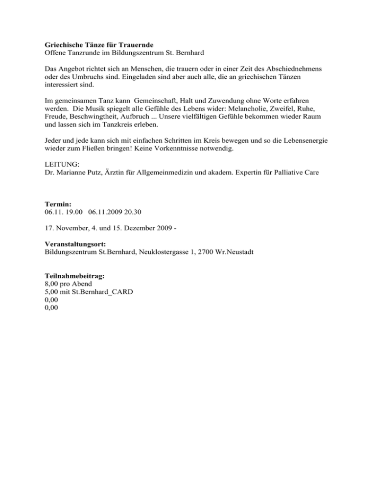 Griechische Tänze für Trauernde Offene Tanzrunde im Bildungszentrum St. Bernhard Das Angebot richtet sich an Menschen, die trauern oder in einer Zeit des Abschiednehmens oder des Umbruchs sind. Eingeladen sind aber auch alle, die an griechischen Tänzen interessiert sind. Im gemeinsamen Tanz kann Gemeinschaft, Halt und Zuwendung ohne Worte erfahren werden. Die Musik spiegelt alle Gefühle des Lebens wider: Melancholie, Zweifel, Ruhe, Freude, Beschwingtheit, Aufbruch ... Unsere vielfältigen Gefühle bekommen wieder Raum und lassen sich im Tanzkreis erleben. Jeder und jede kann sich mit einfachen Schritten im Kreis bewegen und so die Lebensenergie wieder zum Fließen bringen! Keine Vorkenntnisse notwendig. LEITUNG: Dr. Marianne Putz, Ärztin für Allgemeinmedizin und akadem. Expertin für Palliative Care Termin: 06.11. 19.00 06.11.2009 20.30 17. November, 4. und 15. Dezember 2009 Veranstaltungsort: Bildungszentrum St.Bernhard, Neuklostergasse 1, 2700 Wr.Neustadt Teilnahmebeitrag: 8,00 pro Abend 5,00 mit St.Bernhard_CARD 0,00 0,00 Die fallenden Blätter geben dem Wind die Gestalt 20 Jahre Mobiles Caritas Hospiz Wien, 10 Jahre Mobiles Caritas Hospiz Niederösterreich Dieses Jubiläum wollen wir gemeinsam mit Ihnen/Dir feiern! Wir zeigen einen kurzen Film von Herbert Link über die vergangenen Jahre im mobilen Hospiz, wagen einen Blick in die Zukunft und freuen uns über einen gemütlichen Ausklang bei kleinen Erfrischungen und netten Gesprächen. DESHALB DIESER FILM: Vor 20 Jahren hat das Mobile Caritas Hospiz in Wien mit der Betreuung von unheilbar kranken, sterbenden und trauernden Menschen zuhause in vertrauter Umgebung begonnen; vor 10 Jahren war der Start in Niederösterreich. Anlässlich dieses Doppeljubiläums zeigen wir in diesem Film von Herbert Link die Arbeit des Mobilen Caritas Hospiz und die Bedeutung der Lebensqualität, des Lebens in Würde bis zuletzt. Betroffene und ExpertInnen erzählen von ihren Erfahrungen und geben tiefe Einblicke in ihr Erleben der Themen Sterben, Tod und Trauer. Eine Kooperationsveranstaltung von Caritas Hospiz NÖ und dem Bildungszentrum St. Bernhard. Termin: 26.11. 19.00 26.11.2009 21.30 Veranstaltungsort: Bildungszentrum St. Bernhard, Neuklostergasse 1, 2700 Wr. Neustadt Teilnahmebeitrag: 0,00 Eintritt frei! 0,00 0,00 0,00 Liebe dich selbst wie deinen Nächsten Der liebevolle Umgang mit meinen pflegebedürftigen Angehörigen und mir selbst Dieses Seminars bietet Ihnen die Gelegenheit, dass auf Ihre ganz spezielle, individuelle Pflegesituation eingegangen werden kann! Je nach vorliegenden Schwerpunkten der Belastung, auftretenden Fragen und Anliegen (Angehörigenpflege, Selbstpflege, Pflegeheimeinweisung des Angehörigen, Menschen mit Demenzerkrankung, etc.) werden wir dieses komplexe Thema gemeinsam, abwechslungsreich, flexibel und mit konkreten Tipps und Hinweisen, Beratung, praktischen Übungen, Gesprächen, etc bearbeiten! Herr AUGUST ROSENKRANZ(Caritas Wien) bietet Ihnen Hinweise auf Ressourcen von außen. Was könnte für mich in meiner speziellen Situation hilfreich sein? - Hauskrankenpflege ? Modus, Kosten, Organisationen, Qualifikationen,_ - Mobiles Palliativteam bei sehr schweren Erkrankungen ? Leistungen, .. - Mobiles Hospiz Team ? Ehrenamtlichkeit, Besuchsdienst,_ - Pflegeheim ? Modus, Kosten, Aufnahme,_ Schuldgefühle der pflegenden Angehörigen, wie damit umgehen?, Entlastungsübungen, Gespräche, __ - Kurzzeitpflege, Übergangspflege, Betreutes Wohnen, Tagespflege,__. - Planung in der Familie, Koordination der Pflege,_. - usw. Frau ELISABETH BAUER (LSB) geht auf Selbstpflege und Eigenressourcen der Pflegenden ein: - Welche Belastungen könen für mich, die Partnerschaft oder die Familie in einer Pflegesituation entstehen? - Woran merke ich, dass die Belastung für mich (und meine Umgebung) zu groß wird und was kann ich dann tun? - Wie kann ich Stress verarbeiten oder im besten Fall bereits vermeiden? - Wie erlaube ich mir "gesunden Egoismus"? _weil es zuerst notwendiger Weise mir gut gehen muss, damit es auch meinen Angehörigen gut geht bzw. ich zu Anderen gut sein kann! - Wie gehe ich mit Schuldgefühlen um (Was sagen die anderen? Ich kann doch nicht_?), wenn ich mich nicht (mehr) in der Lage sehe, Angehörige zu pflegen? - usw. Termin: 28.11. 09.00 28.11.2009 17.00 Veranstaltungsort: Bildungszentrum St. Bernhard, Neuklosteragasse 1, 2700 Wr. Neustadt Teilnahmebeitrag: 85,00 Teilnahmebeitrag 80,00 mit St.Bernhard_CARD 0,00 0,00 Leben bis zuletzt Einführung in die Lebens-, Sterbe- und Trauerbegleitung Die Hospizbewegung greift die Idee der mittelalterlichen Hospize wieder auf. Sie sieht den Lebensweg des Menschen als eine lange Reise, auf der besonders Schwerkranke und Sterbende umfassende Zuwendung benötigen. Themen des Abends: Vorstellen der Hospizidee, der Inhalte und Grenzen, der verschiedenen Möglichkeiten von Unterstützung und Begleitung. Der Abend dient auch zur Orientierung für die Personen, die überlegen ob sie am Grundkurs für Lebens-, Sterbe- und Trauerbegleitung, der am 29. Jänner 2010 in unserem Haus beginnt, teilnehmen wollen. Mehr Info hier: http://www.stbernhard.at/veranstaltungen/veranstaltung/7381/ Termin: 10.12. 19.00 10.12.2009 21.00 Veranstaltungsort: Bildungszentrum St. Bernhard, Neuklostergasse 1, 2700 Wr. Neustadt Teilnahmebeitrag: 8,00 Teilnahmebeitrag 5,00 mit St.Bernhard_CARD 0,00 0,00 Grundkurs für Lebens-, Sterbe- und Trauerbegleitung 2010 Vier Wochenenden im Bildungszentrum St. Bernhard FÜR WEN IST DIESER KURS GEDACHT: - für Menschen, die sich aus unterschiedlichen Gründen mit den Themen Sterben, Tod und Trauer intensiv auseinandersetzen wollen - für MitarbeiterInnen in helfenden Berufen - für Angehörige von Schwerkranken - für Personen, die als HospizbegleiterInnen ehrenamtlich arbeiten möchten Von der Teilnahme an diesem Seminar wird grundsätzlich abgeraten, wenn InteressentInnen sich noch in akuter Trauer um einen Angehörigen oder Nahestehenden befinden. ZIEL UND METHODIK: Die Ho