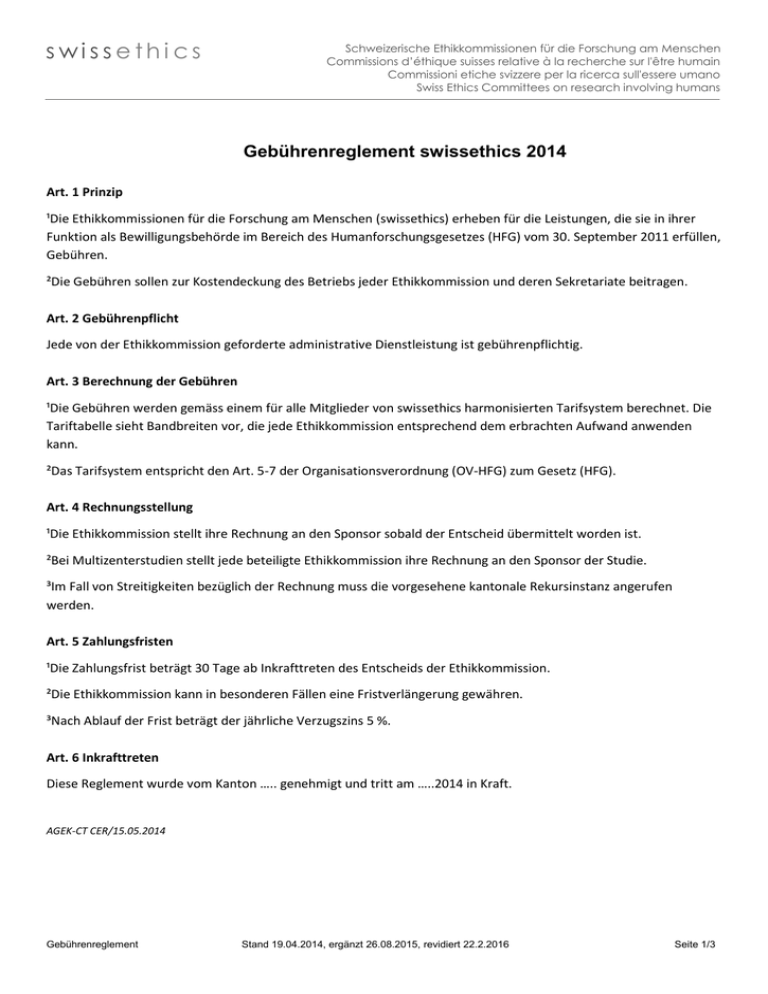 swissethics Schweizerische Ethikkommissionen für die Forschung am Menschen Commissions d’éthique suisses relative à la recherche sur l'être humain Commissioni etiche svizzere per la ricerca sull'essere umano Swiss Ethics Committees on research involving humans Gebührenreglement swissethics 2014 Art. 1 Prinzip ¹Die Ethikkommissionen für die Forschung am Menschen (swissethics) erheben für die Leistungen, die sie in ihrer Funktion als Bewilligungsbehörde im Bereich des Humanforschungsgesetzes (HFG) vom 30. September 2011 erfüllen, Gebühren. ²Die Gebühren sollen zur Kostendeckung des Betriebs jeder Ethikkommission und deren Sekretariate beitragen. Art. 2 Gebührenpflicht Jede von der Ethikkommission geforderte administrative Dienstleistung ist gebührenpflichtig. Art. 3 Berechnung der Gebühren ¹Die Gebühren werden gemäss einem für alle Mitglieder von swissethics harmonisierten Tarifsystem berechnet. Die Tariftabelle sieht Bandbreiten vor, die jede Ethikkommission entsprechend dem erbrachten Aufwand anwenden kann. ²Das Tarifsystem entspricht den Art. 5-7 der Organisationsverordnung (OV-HFG) zum Gesetz (HFG). Art. 4 Rechnungsstellung ¹Die Ethikkommission stellt ihre Rechnung an den Sponsor sobald der Entscheid übermittelt worden ist. ²Bei Multizenterstudien stellt jede beteiligte Ethikkommission ihre Rechnung an den Sponsor der Studie. ³Im Fall von Streitigkeiten bezüglich der Rechnung muss die vorgesehene kantonale Rekursinstanz angerufen werden. Art. 5 Zahlungsfristen ¹Die Zahlungsfrist beträgt 30 Tage ab Inkrafttreten des Entscheids der Ethikkommission. ²Die Ethikkommission kann in besonderen Fällen eine Fristverlängerung gewähren. ³Nach Ablauf der Frist beträgt der jährliche Verzugszins 5 %. Art. 6 Inkrafttreten Diese Reglement wurde vom Kanton ….. genehmigt und tritt am …..2014 in Kraft. AGEK-CT CER/15.05.2014 Gebührenreglement Stand 19.04.2014, ergänzt 26.08.2015, revidiert 22.2.2016 Seite 1/3 Handbuch: Harmonisierter Tarifkode von swissethics für die verschiedenen Verfahren zur Überprüfung von Forschungsprojekten und Dokumenten durch die EK gemäss OV-HFG Arten von Verfahren für die Prüfung von Forschungsprojekten und Dokumenten 1. Ordentliches Verfahren (nach Art. 5 OV-HFG) Tarifkode 1.0 – 1.3 1.A. Klinische Versuche der Kategorie B oder C nach : - Artikeln 19 Absatz 2-3, 20 Absatz 2, 49 Absatz 2 und 61 Absatz 2 KlinV, - Artikel 7 Absatz 2 HFV. 1.B. Klinische Versuche der Kategorie A nach Artikeln 19 Absatz 1, 20 Absatz 1, 49 Absatz 1 und 61 Absatz 1 KlinV, wenn der Versuch mit besonderen Fragen in ethischer, wissenschaftlicher oder rechtlicher Hinsicht verbunden ist. 1.C. Weiterverwendung von biologischem Material und gesundheitsbezogenen Personendaten für die Forschung bei fehlender Einwilligung oder Information nach Artikel 34 HFG, die mit besonderen Fragen in ethischer, wissenschaftlicher oder rechtlicher Hinsicht verbunden ist. 2. Vereinfachtes Verfahren (nach Art. 6 OV-HFG) 2.0 – 2.3 2.A. Klinische Versuche der Kategorie A nach den Artikeln 19 Absatz 1, 20 Absatz 1, 49 Absatz 1 und 61 Absatz 1 KlinV, wenn der Versuch nicht mit besonderen Fragen in ethischer, wissenschaftlicher oder rechtlicher Hinsicht verbunden ist; 2.B. Forschungsprojekte mit Personen der Kategorie A nach Artikel 7 Absatz 1 HFV. 2.C. Weiterverwendung von biologischem Material und gesundheitsbezogenen Personendaten für die Forschung bei fehlender Einwilligung oder Information nach Artikel 34 HFG, die nicht mit besonderen Fragen in ethischer, wissenschaftlicher oder rechtlicher Hinsicht verbunden ist. 2.D. Forschungsprojekte an verstorbenen Personen, mit Ausnahme der Forschungsprojekte an künstlich beatmeten verstorbenen Personen nach Artikel 37 Absatz 2 HFG; 2.E. Wesentliche Änderungen an bewilligten Forschungsprojekten, die mit besonderen Fragen in ethischer, wissenschaftlicher oder rechtlicher Hinsicht verbunden sind. (Nach Artikel 29 KlinV oder Artikel 18 HFV. 3. Präsidialentscheid (nach Art . 7 OV-HFG) 3.A. Bewertung von Forschungsprojekten und Dokumente die erhebliche Arbeitsbelastung erfordern 3.1.0 – 3.1.3 3.A.1. Forschungsprojekte mit bereits vorhandenem biologischem Material und bereits vorhandenen gesundheitsbezogenen Personendaten, mit Ausnahme der Weiterverwendung nach Artikel 34 HFG un Art. 7 Absatz 1a OV-HFG. 3.A.2. Wesentliche Änderungen an bewilligten Forschungsprojekten, die nicht mit besonderen Fragen in ethischer, wissenschaftlicher oder rechtlicher Hinsicht verbunden sind wie: - Änderungen, die sich auf die Sicherheit und Gesundheit der teilnehmenden Personen oder deren Rechte und Pflichten auswirken, nach Art. 29 Absatz. 3.a KlinV oder Art. 18 Absatz. 3.a HFV, - Änderungen des Prüfplans, namentlich Änderungen aufgrund neuer wissenschaftlicher Erkenntnisse, welche die Versuchsanordnung, die Prüfmethode, die Zielkriterien oder das statistische Auswertungskonzept betreffen, nach Art. 29, Absatz 3.b KlinV, - Änderungen des Forschungsplans, welche die Zielsetzung beziehungsweise die zentrale Fragestellung des Forschungsprojekts betreffen, sofern es sich um ein Forschungsprojekt der Kat. B handelt, nach Art. 18 Absatz. 3.b HFV. 3.B. Bewertung von Dokumenten die, in der Regel, weniger Arbeitsbelastung erfordern 3.2.0 – 3.2.3 3.B.1. Nichteintreten auf Gesuche, nach Art. 7 Absatz 1d OV-HFG. 3.B.2. Abschreiben von Gesuchen infolge Gegenstandslosigkeit oder Rückzug, nach Art. 7 Absatz 1e OV-HFG. 3.B.3. Erfüllung von Auflagen, nach Art. 7 Absatz 1e OV-HFG. 3.B.4. Wesentliche Änderungen am bewilligten klinischen Versuch wie : - Änderung des Durchführungsortes oder die Durchführung des klinischen Versuchs an einem zusätzlichen Durchführungsort, nach Art.. 29 Absatz 3c KlinV oder Art. 18 Absatz 3c HFV. - Änderung des Sponsors, der koordinierenden Prüfperson oder der an einem Durchführungsort verantwortlichen Prüfperson, nach Art. 29 Absatz 3d KlinV oder Art. 18, Absatz 3d HFV. 3.B.5. Meldungen und Berichterstattung, nach Art.37-4