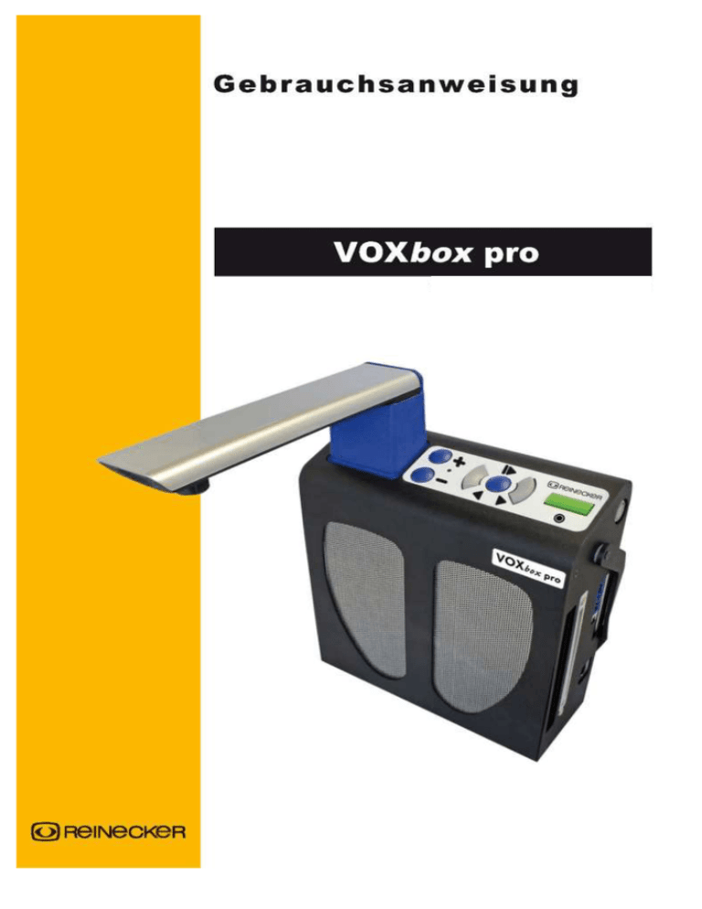 1 Reinecker Vision GmbH Sandwiesenstraße 19 64665 Alsbach-Hähnlein Tel. 0 62 57-93 11-0 Fax. 0 62 57-25 61 2 Inhalt 1. Allgemeines ..................................................................................................................... 5 2. Sicherheitsunterweisung zur Vermeidung von Schäden .................................................. 8 3. Aufstellung ....................................................................................................................... 9 3.1 Lieferumfang .............................................................................................................. 9 3.2 Auspacken der VOXbox pro ....................................................................................... 9 3.3 Positionieren der VOXbox pro .................................................................................. 10 3.4 VOXbox pro Kontrastmatte ...................................................................................... 10 4. Installation ...................................................................................................................... 11 4.1 Anschluss an ein Stromnetz ..................................................................................... 11 4.2 Anschluss des Tastenfelds ....................................................................................... 11 4.3 Verwendung der Tastenfeldabdeckung (optional) .................................................... 12 4.4 Aufstecken der VOXbox pro-Kamera ....................................................................... 12 4.5 Tragegriff .................................................................................................................. 13 4.6 Ein-/Aus-Schalten..................................................................................................... 13 4.7 Beleuchtungsregelung.............................................................................................. 13 4.8 Positionieren der Dokumente ................................................................................... 14 5. Bedienung am System ................................................................................................... 15 6. Lautstärke ...................................................................................................................... 17 7. Bedienung mit dem Tastenfeld ...................................................................................... 18 7.1 Tastenfeld und Tastenfeldabdeckung ...................................................................... 18 7.2 Seiten erfassen ........................................................................................................ 19 7.3 Steuerung innerhalb eines Dokuments .................................................................... 19 7.4 Steuerung innerhalb des Menüs .............................................................................. 20 7.5 Hilfe .......................................................................................................................... 20 7.6 Dokumentenverwaltung............................................................................................ 21 7.7 Dokument bearbeiten (Seiten bearbeiten) ................................................................ 21 7.8 Lesezeichen ............................................................................................................. 23 7.9 Optionen................................................................................................................... 23 3 7.9.1 Erkennung ......................................................................................................... 23 7.9.2 Menüeinstellungen............................................................................................. 24 7.9.3 Spracheinstellungen .......................................................................................... 24 7.9.4 System .................................................................................................................. 25 7.9.5. Mehrsprachenunterstützung ................................................................................. 25 8. Aktualisierung der VOXbox pro Software....................................................................... 27 9. FAQ und Fehlerbehebung ............................................................................................. 27 10. Technische Daten ........................................................................................................ 28 11. Sachmangel- und Garantiebestimmungen ................................................................... 29 12. Eigentum und geistiges Eigentum ............................................................................... 30 4 1. Allgemeines Wichtige Hinweise für den Betrieb des Vorlesesystems VOXbox pro Lesen Sie diese Hinweise vor Gebrauch des Gerätes. Wichtig: Betrifft das Lesen von Medikamentenbeipackzetteln: Dosierungen und Mengenangaben bedürfen immer der Überprüfung einer sehenden Person. Hinweise zur elektromagnetischen Verträglichkeit (EMV) Das Vorlesesystem ist geeignet für den Gebrauch in allen Einrichtungen einschließlich des Wohnbereichs und solchen, die direkt an ein öffentliches Versorgungsnetz angeschlossen sind, das auch Gebäude für Wohnzwecke versorgt. Das Gerät ist für den Betrieb in der angegebenen elektromagnetischen Umgebung bestimmt. Der Kunde oder Betreiber sollte sicherstellen, dass es in der beschriebenen Umgebung benutzt wird. Das Vorlesesystem nutzt HF-Energie ausschließlich für seine eigene Funktion. Deshalb ist die Störaussendung hochfrequenter Störgrößen sehr gering und die Möglichkeit, andere in der Nähe betriebene Geräte zu stören, unwahrscheinlich. Trotzdem sollte berücksichtigt werden, dass gemeinsamer Betrieb des Gerätes zusammen mit anderen Geräten zu Störungen des Gerätes oder anderer Geräte führen kann. Daher sollte darauf geachtet werden, dass das Ger