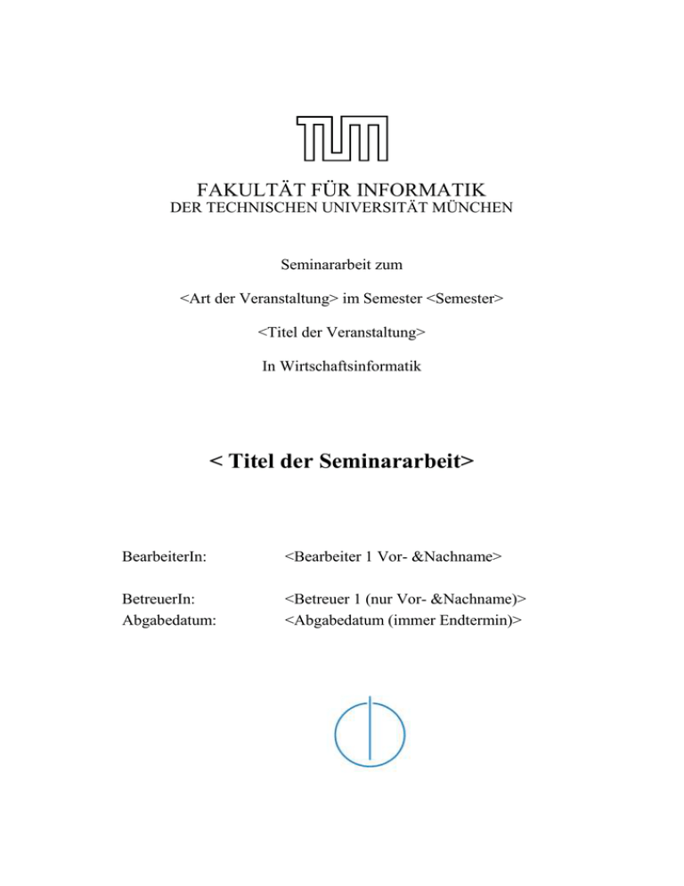 FAKULTÄT FÜR INFORMATIK DER TECHNISCHEN UNIVERSITÄT MÜNCHEN Seminararbeit zum <Art der Veranstaltung> im Semester <Semester> <Titel der Veranstaltung> In Wirtschaftsinformatik < Titel der Seminararbeit> BearbeiterIn: <Bearbeiter 1 Vor- &Nachname> BetreuerIn: Abgabedatum: <Betreuer 1 (nur Vor- &Nachname)> <Abgabedatum (immer Endtermin)> Ich versichere, dass ich diese <Art der Arbeit> selbständig verfasst und nur die angegebenen Quellen und Hilfsmittel verwendet habe. Garching b. München, den <Datum> ________________________ Ort, Datum Unterschrift Wurde die Arbeit in Englisch verfasst bitte auch die Erklärung in englischer Sprache (I assure the single handed composition of this diploma thesis (master's thesis,...) only supported by declared resources) Zusammenfassung Die Formatvorlage “Überschrift 1” wird Überschriften zugewiesen, die zwar im Inhaltsverzeichnis auftauchen sollen, aber nicht in der Nummerierung bzw. Gliederung des Hauptteils berücksichtigt werden sollen. Text Text Text Text Text Text Text Text Text Text Text Text Text Text Text Text Text Text Text Text Text Text Text Text Text Text Text Text Text Text Text Text Text Text Text Text Text Text Text Text Text Text Text Text Text Text Text Text Text Text Text Text Text Text Text Text Text Text Text Text Text Text Text Text Text Text Text Text Text Text Text Text Text Text Text Text Text Text Text Text Text Text Text Text Text Text Text Text Text Text Text Text Text Text Text Text Text Text Text Text Text Text Text Text Text Text Text Text Text Text Text Text Text Text Text Text Text Text Text Text Text Text Text Text. Stichworte: Stichwort, Stichwort, Stichwort, Stichwort, Stichwort, Stichwort, Stichwort, Stichwort, Stichwort, Stichwort, Stichwort, Stichwort. III Inhaltsverzeichnis Zusammenfassung.......................................................................................................III Abbildungsverzeichnis ................................................................................................. V Tabellenverzeichnis..................................................................................................... VI Abkürzungsverzeichnis ............................................................................................ VII 1 2 Gliederungsebene 1 ............................................................................................... 1 1.1 Gliederungsebene 2 .................................................................................................. 1 1.2 Gliederungsebene 2 .................................................................................................. 1 Gliederungsebene 1 ............................................................................................... 2 2.1 Gliederungsebene 2 .................................................................................................. 2 2.1.1 2.1.2 2.1.3 Gliederungsebene 3 ............................................................................................ 2 Gliederungsebene 3 ............................................................................................ 2 Gliederungsebene 3 .......................................... Error! Bookmark not defined. Literaturverzeichnis ..................................................................................................... 4 Anhang ........................................................................................................................... 5 Anhang A Anhang-Gliederungsebene 1 ....................................................................... 6 IV Abbildungsverzeichnis Abbildung 1: Beispiel-Abbildung .............................................................................................. 1 Abbildung 2: Integrierte Informationssystem-Architektur (ISA) .............................................. 3 V Tabellenverzeichnis Tabelle 1: Beispiel-Tabelle ........................................................................................................ 2 VI Abkürzungsverzeichnis AK1 AK2 AK3 … Abkürzung 1 Abkürzung 2 Abkürzung 3 … VII Gliederungsebene 1 Gliederungsebene 2 Die vier Formatvorlagen „Ü1T“, „Ü2T“, „Ü3T“ und „Ü4T“ sind für die Gliederung des Hauptteils der Arbeit in insgesamt vier Ebenen gedacht und tauchen dementsprechend auch im Inhaltsverzeichnis der Arbeit auf. Der Textkörper selbst ist mit der Formatvorlage „Text“ auszuzeichnen (wichtig: nicht „Standard“ verwenden!). Gliederungsebene 2 Abbildungen selbst erhalten die Formatvorlage „Abbildung“. Zugehörige Beschriftungen die Formatvorlage „Beschriftung“, die Quelle der Abbildung „Beschriftung_Quelle“. Abbildung 1 dient als Beispiel für eine Abbildung. 1 Abbildung 1: Beispiel-Abbildung Quelle: Eigene Darstellung 2 Gliederungsebene 1 Gliederungsebene 2 Passendes Zitat zur Einleitung eines Abschnitts, welches nicht zum Textteil gehört. (Quelle) Gliederungsebene 3 Text Text Text Text Text Text Text Text Text Text Text Text Text Text Text Text Text Text Text Text Text Text Text Text Text Text Text Text Text Text Text Text Text Text Text Text Text Text Text Text Text Text Text Text Text Text Text Text Text Text Text Text Text Text Text Text. „normales Zitat im Textkörper” (Krcmar 2005, x). „mehrzeiliges langes eingerücktes Zitat …………………………………………… ………………………………………………………………………………………… ………………………………………………………………………………………… …………………………………………………………“ (Quelle). Text Text Text Text1 Text Text Text Text2 Text_Aufzählung; Text_Aufzählung; Text_Aufzählung. Aufzählungen sollten in einem korrekten Satz eingebaut werden Gliederungsebene 3 Text Text Text Text. Tabelle 1 dient als Beispiel für eine Tabelle. Die Formatvorlagen für die Beschriftungen sind analog zu den Abbildungen „Beschriftun