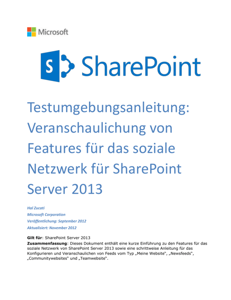 Testumgebungsanleitung: Veranschaulichung von Features für das soziale Netzwerk für SharePoint Server 2013 Hal Zucati Microsoft Corporation Veröffentlichung: September 2012 Aktualisiert: November 2012 Gilt für: SharePoint Server 2013 Zusammenfassung: Dieses Dokument enthält eine kurze Einführung zu den Features für das soziale Netzwerk von SharePoint Server 2013 sowie eine schrittweise Anleitung für das Konfigurieren und Veranschaulichen von Feeds vom Typ „Meine Website“, „Newsfeeds“, „Communitywebsites“ und „Teamwebsite“. Datum Beschreibung 15.11.2012 Hinsichtlich der veröffentlichten Version von SharePoint Server 2013 aktualisiert sowie um Standardtext, Grafiken und Abschnitte erweitert. 16.09.2012 Erstveröffentlichung © 2012 Microsoft Corporation. Alle Rechte vorbehalten. Dieses Dokument wird „wie besehen“ bereitgestellt. Die in diesem Dokument enthaltenen Informationen und Ansichten, einschließlich URLs und Verweise auf Internetwebsites, können ohne vorherige Ankündigung geändert werden. Das Risiko der Nutzung liegt bei Ihnen. Einige der hier beschriebenen Beispiele dienen ausschließlich der Veranschaulichung und sind fiktiv. Eine reale Verknüpfung wird weder beabsichtigt noch abgeleitet. Mit diesem Dokument werden keine Rechte an geistigem Eigentum an einem Microsoft-Produkt auf Sie übertragen. Sie sind berechtigt, dieses Dokument zu kopieren und für eigene interne Referenzzwecke zu nutzen. Seite 2 Inhalt Inhalt ...............................................................................................................................................................3 Einführung ........................................................................................................................................................4 Testumgebungsanleitungen ...........................................................................................................................4 Features für das soziale Netzwerk für SharePoint-Server 2013...........................................................................5 Inhalt dieses Handbuchs .....................................................................................................................................5 Übersicht über die Testumgebung ........................................................................................................................6 Hardware- und Softwareanforderungen .................................................................................................................7 Konfigurieren der Testumgebung der Features für das soziale Netzwerk für SharePoint und Veranschaulichen von Features für das soziale Netzwerk ..................................................................................................................8 Schritt 1: Einrichten der Testumgebung für die SharePoint Server 2013-Farm mit drei Ebenen ..............................8 Schritt 2: Erstellen einer Websitesammlung „Meine Website“ und Konfigurieren von Einstellungen .........................8 Erstellen einer neuen Webanwendung ......................................................................................................9 Erstellen einer Websitesammlung „Meine Website“................................................................................... 10 Hinzufügen eines verwalteten Pfads mit Platzhalterinklusion zur Webanwendung ......................................... 10 Aktivieren von Self-Service Site Creation für die Webanwendung ............................................................... 11 Konfigurieren von Einstellungen für „Meine Website“ für die Benutzerprofildienst-Anwendung ....................... 11 Aktivieren von „Benutzerprofildienst-Anwendung – Aktivitätsfeedauftrag“ ................................................... 12 Schritt 3: Konfigurieren folgender Einstellungen ............................................................................................ 12 Konfigurieren der folgenden Einstellungen für „Meine Websites“ ................................................................ 13 Schritt 4: Konfigurieren von Communitywebsites ........................................................................................... 13 Erstellen eines Communityportals .......................................................................................................... 14 Ausführen einer Suchdurchforstung ....................................................................................................... 14 Schritt 5: Konfigurieren von Teamwebsites ................................................................................................... 15 Erstellen einer neuen Teamwebsitesammlung.......................................................................................... 15 Schritt 6: Veranschaulichen von Features für das soziale Netzwerk in SharePoint 2013 ....................................... 16 Veranschaulichen von Teamwebsites ...................................................................................................... 16 Veranschaulichen von „Meine Websites“ ................................................................................................. 16 Veranschaulichen von Newsfeeds ........................................................................................................... 17 Communitywebsites ............................................................................................................................. 18 Erstellen einer Momentaufnahme der Konfiguration .............................................................................................. 19 Weitere Ressourcen .......................................................................................................................................... 19 Seite 3 Einführung Diese Testumgebungsanleitung für die Veranschaulichung von Features für das soziale Netzwerk für SharePoint Server 20