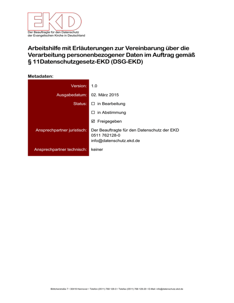 Der Beauftragte für den Datenschutz der Evangelischen Kirche in Deutschland Arbeitshilfe mit Erläuterungen zur Vereinbarung über die Verarbeitung personenbezogener Daten im Auftrag gemäß § 11Datenschutzgesetz-EKD (DSG-EKD) Metadaten: Version: 1.0 Ausgabedatum: 02. März 2015 Status: in Bearbeitung in Abstimmung Freigegeben Ansprechpartner juristisch: Der Beauftragte für den Datenschutz der EKD 0511 762128-0 [email protected] Ansprechpartner technisch: keiner Böttcherstraße 7 • 30419 Hannover • Telefon (0511) 768 128-0 • Telefax (0511) 768 128-20 • E-Mail: [email protected] Inhaltsübersicht A. VEREINBARUNG ÜBER DIE VERARBEITUNG PERSONENBEZOGENER DATEN IM AUFTRAG GEMÄß § 11 DATENSCHUTZGESETZ-EKD (DSG-EKD) (AUFTRAGSDATENVERARBEITUNG – ADV) A-1 PRÄAMBEL § 1 GEGENSTAND UND DAUER DES AUFTRAGS § 2 KONKRETISIERUNG DES AUFTRAGSINHALTS § 3 TECHNISCHE UND ORGANISATORISCHE MAßNAHMEN § 4 BERICHTIGUNG, SPERRUNG UND LÖSCHUNG VON DATEN § 5 KONTROLLEN UND SONSTIGE PFLICHTEN DES AUFTRAGNEHMERS § 6 UNTERAUFTRAGSVERHÄLTNISSE § 7 KONTROLLRECHTE DES AUFTRAGGEBERS § 8 INFORMATIONS- UND UNTERSTÜTZUNGSPFLICHTEN DES AUFTRAGNEHMERS § 9 WEISUNGSBEFUGNIS DES AUFTRAGGEBERS § 10 LÖSCHUNG VON DATEN UND RÜCKGABE VON DATENTRÄGERN, DOKUMENTATION § 11 FORMKLAUSEL § 12 SALVATORISCHE KLAUSEL MIT ERSETZUNGSKLAUSEL A-2 A-2 A-2 A-3 A-4 A-4 A-5 A-6 A-7 A-7 A-8 A-8 A-8 B. ANLAGE 1: HINWEISE ZUR ERSTELLUNG EINER ANLAGE ZUR ADV NACH § 11 DSG-EKD B-1 C. ANLAGE 2: BERECHTIGTE WEISUNGSGEBER UND WEISUNGSEMPFÄNGER, DATENSCHUTZBEAUFTRAGTE C-1 D. ERLÄUTERUNGEN / AUSFÜLLHINWEISE ZUR ARBEITSHILFE ZUR VEREINBARUNG ÜBER DIE VERARBEITUNG PERSONENBEZOGENER DATEN IM AUFTRAG GEMÄß § 11 DATENSCHUTZGESETZ-EKD D-1 ZUR PRÄAMBEL ZU § 1 ABS. 1 ZU § 1 ABS. 3 ZU § 2 ABS. 2 ZU § 3 ZU § 3 ABS. 2 SATZ 3 ZU § 3 ABS. 4 ZU § 4 ZU § 4 ABS. 1 ZU § 4 ABS. 2 ZU § 5 ABS. 1 SATZ 2 ZU § 5 ABS. 4 ZU § 5 ABS. 6 ZU § 5 ABS. 7 ZU § 5 ABS. 8 ZU § 6 ZU § 6 ABS. 3 Arbeitshilfe mit Erläuterungen zur Vereinbarung über die Verarbeitung personenbezogener Daten im Auftrag gemäß § 11 EKD-Datenschutzgesetz (DSG-EKD) D-1 D-2 D-2 D-2 D-2 D-3 D-3 D-3 D-3 D-3 D-3 D-4 D-4 D-4 D-4 D-4 D-4 Seite 2 von 3 Der Beauftragte für den Datenschutz der Evangelischen Kirche in Deutschland ZU § 7 ZU § 7 ABS. 1 ZU § 7 ABS. 2 ZU § 8 ZU § 8 ABS. 2 ZU § 8 ABS. 3 ZU § 9 ZU § 9 ABS. 2 ZU § 9 ABS. 3 ZU § 10 ZU § 10 ABS. 1 Arbeitshilfe mit Erläuterungen zur Vereinbarung über die Verarbeitung personenbezogener Daten im Auftrag gemäß § 11 EKD-Datenschutzgesetz (DSG-EKD) D-4 D-5 D-5 D-5 D-5 D-5 D-5 D-5 D-5 D-6 D-6 Seite 3 von 3 A. Vereinbarung über die Verarbeitung personenbezogener Daten im Auftrag gemäß § 11 Datenschutzgesetz-EKD (DSG-EKD) (Auftragsdatenverarbeitung – ADV) zwischen Klicken Sie hier, um Text einzugeben. Klicken Sie hier, um Text einzugeben. Klicken Sie hier, um Text einzugeben. (nachfolgend „Auftraggeber“ genannt) und Klicken Sie hier, um Text einzugeben. Klicken Sie hier, um Text einzugeben. Klicken Sie hier, um Text einzugeben. (nachfolgend „Auftragnehmer“ genannt) – nachstehend gemeinsam auch Parteien genannt – Vereinbarung über die Verarbeitung personenbezogener Daten im Auftrag gemäß § 11 EKD-Datenschutzgesetz Seite A-1 von 9 Präambel Die vorliegende Vereinbarung – im Folgenden „ADV“ genannt – konkretisiert die datenschutzrechtlichen Verpflichtungen der Vertragsparteien aus § 11 DSG-EKD, die sich aus der Auftragsdatenverarbeitung basierend auf dem Dienstleistungsvertrag vom Klicken Sie hier, um ein Datum einzugeben. (nachstehend „Hauptvertrag“ genannt) ergeben. Ziel ist die datenschutzgerechte Durchführung der Klicken Sie hier, um Text einzugeben.. Der Inhalt des Vertrages bezieht sich auf den Umgang mit personenbezogenen Daten (im Folgenden „Daten“ genannt), die der Auftraggeber an den Auftragnehmer übergibt bzw. die im Auftrag des Auftraggebers erhoben, verarbeitet oder genutzt werden. Der Vertrag gilt für alle Tätigkeiten und Anwendungen, bei denen Mitarbeitende des Auftragnehmers oder durch den Auftragnehmer beauftragte Dritte mit diesen personenbezogenen Daten in Berührung kommen können. Für rechtliche hier nicht näher definierte Begriffe oder Ausdrücke gelten die maßgeblichen gesetzlichen Definitionen des DSG-EKD. §1 Gegenstand und Dauer des Auftrags (1) Gegenstand des Auftrags ist die Durchführung folgender Aufgaben durch den Auftragnehmer für den Auftraggeber in dessen Auftrag und nach dessen Weisung: Klicken Sie hier, um Text einzugeben. (2) Diese Vereinbarung gilt ab dem Klicken Sie hier, um ein Datum einzugeben. und endet nach der Beendigung des Hauptvertrages mit der Übergabe oder der Vernichtung aller personenbezogenen Daten des Auftraggebers gemäß § 10 dieser Vereinbarung, ohne dass es einer gesonderten Kündigung dieser Vereinbarung dazu bedarf. [(3) Die Vereinbarung gilt entsprechend für (Fern-)Prüfung und Wartung automatisierter Verfahren oder von Datenverarbeitungsanlagen, wenn dabei ein Zugriff auf personenbezogene Daten nicht ausgeschlossen werden kann. Insoweit gilt § 11 ADV.] §2 Konkretisierung des Auftragsinhalts (1) Der Auftraggeber bleibt im datenschutzrechtlichen Sinn verantwortliche Stelle gemäß § 11 Absatz 1 Satz 1 DSG-EKD. (2) Der Umfang, die Art und der Zweck der vorgesehenen Erhebung, Verarbeitung oder Nutzung von personenbezogenen Daten, die Art der Daten und der Kreis der Betroffenen wird wie folgt festgelegt: 1. Art der Daten Gegenstand der Erhebung, Verarbeitung oder Nutzung von Daten [dazu gehören auch neu entstehende Daten] durch den Auftragnehmer sind folgende Datenarten bzw. -kategorien: Daten aus der [z. B. Personenstammdaten, Kommunikationsdaten wie etwa Telefonnummern, E-MailAdressen, Vertragsstammdaten wie etwa Vertragsbeziehung, Produkt- bzw. Vertragsinteresse, Kundenhistorie, Vertragsabrechnungs- und Zahlungsdaten, Planungs- und Steuerungsdaten, Beispiel Buchhaltung: Rechnungsdaten, Liefera