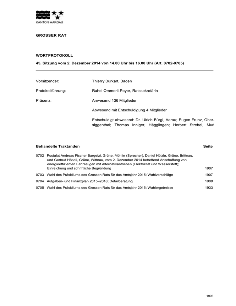 GROSSER RAT WORTPROTOKOLL 45. Sitzung vom 2. Dezember 2014 von 14.00 Uhr bis 16.00 Uhr (Art. 0702-0705) Vorsitzender: Thierry Burkart, Baden Protokollführung: Rahel Ommerli-Peyer, Ratssekretärin Präsenz: Anwesend 136 Mitglieder Abwesend mit Entschuldigung 4 Mitglieder Entschuldigt abwesend: Dr. Ulrich Bürgi, Aarau; Eugen Frunz, Obersiggenthal; Thomas Inniger, Hägglingen; Herbert Strebel, Muri Behandelte Traktanden Seite 0702 Postulat Andreas Fischer Bargetzi, Grüne, Möhlin (Sprecher), Daniel Hölzle, Grüne, Brittnau, und Gertrud Häseli, Grüne, Wittnau, vom 2. Dezember 2014 betreffend Anschaffung von energieeffizienten Fahrzeugen mit Alternativantrieben (Elektrizität und Wasserstoff); Einreichung und schriftliche Begründung 1907 0703 Wahl des Präsidiums des Grossen Rats für das Amtsjahr 2015; Wahlvorschläge 1907 0704 Aufgaben- und Finanzplan 2015–2018; Detailberatung 1908 0705 Wahl des Präsidiums des Grossen Rats für das Amtsjahr 2015; Wahlergebnisse 1933 1906 Vorsitzender: Ich begrüsse Sie zur 45. Sitzung der Legislaturperiode 2013/2016. 0702 Postulat Andreas Fischer Bargetzi, Grüne, Möhlin (Sprecher), Daniel Hölzle, Grüne, Brittnau, und Gertrud Häseli, Grüne, Wittnau, vom 2. Dezember 2014 betreffend Anschaffung von energieeffizienten Fahrzeugen mit Alternativantrieben (Elektrizität und Wasserstoff); Einreichung und schriftliche Begründung Von Andreas Fischer Bargetzi, Grüne, Möhlin, Daniel Hölzle, Grüne, Brittnau, Gertrud Häseli, Grüne, Wittnau, und 6 mitunterzeichnenden Ratsmitgliedern wird folgendes Postulat eingereicht: Text: Bei der Anschaffung von kantonseigenen Fahrzeugen werden wenn immer möglich solche mit Alternativantrieben (Elektrizität und Wasserstoff) berücksichtigt. Begründung: Die Automobilindustrie hat in den letzten Jahren grosse Fortschritte bei der Entwicklung von Fahrzeugen mit Alternativantrieben gemacht. So sind heute eine grosse Anzahl von elektrisch betriebenen Automobilen auf dem Markt, die den unterschiedlichsten Ansprüchen gerecht werden: Vom Kleinwagen über den Transporter bis hin zur Limousine. Angekündigt oder teilweise schon auf dem Markt sind zudem wasserstoffbetriebene Fahrzeuge, denen ebenfalls eine grosse Zukunft vorausgesagt wird. Flottenfahrzeuge sind für alternative Antriebe insbesondere elektrische sehr geeignet. Sie legen pro Tag meist weniger als die durchschnittliche Reichweite von 150 Kilometer zurück und stehen in der Nacht normalerweise auf ihrem fest zugewiesenen Standplatz, wo sie aufgeladen werden können. Ausserdem könnte die Fahrzeugflotte des Kantons ein interessantes Pilotprojekt für die oft diskutierte Möglichkeit von Elektrofahrzeugen als Speicherbattterie werden. Verschiedene Studien zeigen auch, dass Elektroautos über den Betriebszyklus gerechnet sehr wirtschaftlich sind (weniger Unterhalts- und Brennstoffkosten). In der Energiestrategie des Regierungsrat steht geschrieben: "Das kantonale Energiegesetz (EnergieG) hält fest, dass der Kanton zur Steigerung der Energieeffizienz und zur Verbesserung der CO 2Bilanz in der Mobilität eigenständige rechtliche Grundlagen erlassen kann. Gegenstand dieser Regelungen sind insbesondere Massnahmen in den Bereichen Verkehrsinfrastruktur, Antriebssysteme und CO2-arme Mobilität. So kann der Kanton Aargau zum Beispiel den Aufbau der Infrastruktur für Wasserstoff- und für Elektrofahrzeuge unterstützen. Dies mit dem Ziel, die neuen Antriebskonzepte in der Anfangsphase so weit zu unterstützen, dass sie am Markt als Alternative wahrgenommen werden." Hier kann der Kanton wesentlich mehr leisten, indem er mit gutem Beispiel vorangeht und so die Praxistauglichkeit der alternativen Antriebssysteme unter Beweis stellt. 0703 Wahl des Präsidiums des Grossen Rats für das Amtsjahr 2015; Wahlvorschläge Vorsitzender: Für das Amtsjahr 2015 sind durch das Büro zur Wahl vorgeschlagen: - Dr. Markus Dieth, Wettingen, als Grossratspräsident Marco Hardmeier, Aarau, als Grossratsvizepräsident 1 Benjamin Giezendanner, Rothrist, als Grossratsvizepräsident 2 2. Dezember 2014 Art.-Nr. 0702-0703 1907 0704 Aufgaben- und Finanzplan 2015–2018; Detailberatung Fortsetzung der Behandlung der Vorlage-Nr. 14.161-1 des Regierungsrats vom 13. August 2014 samt den abweichenden Anträgen der Kommission für Aufgabenplanung und Finanzen (KAPF) vom 6. November 2014 sowie der Fachkommissionen. Der Regierungsrat stimmt diesen Änderungsanträgen teilweise zu. Fortsetzung der Detailberatung Departement Bildung, Kultur und Sport AB 310 Volksschule Kathrin Scholl-Debrunner, Lenzburg, beantragt namens der SP-Fraktion folgende Anpassung zu den Zielen (Verzicht auf Massnahme 310-21 Reduktion Leistungsumfang Schulpsychologischer Dienst): Zu Ziel 310Z008 Indikator 01 Neuaufträge des Schulpsychologischen Dienstes (Anzahl): Erhöhung um 185 jährlich (2015–2018) 2015: 3'740 (anstatt 3'555) 2016: 3'740 (anstatt 3'555) 2017: 3'740 (anstatt 3'555) 2018: 3'740 (anstatt 3'555) Ziel 310Z008 Indikator 06 Fälle in Bearbeitung im Schulpsychologischen Dienst (Anzahl): Erhöhung um 300 jährlich (2015–2018) 2015: 6'000 (anstatt 5'700) 2016: 6'000 (anstatt 5'700) 2017: 6'000 (anstatt 5'700) 2018: 6'000 (anstatt 5'700) Ziel 310Z008 Indikator 08 Anteil der Eltern und Lehrpersonen, welche die Unterstützung des Schulpsychologischen Dienstes als positiv erfahren haben (in Prozent): Erhöhung um 5 % jährlich (2015–2018) 2015: 95 % (anstatt 90 %) 2016: 95 % (anstatt 90 %) 2017: 95 % (anstatt 90 %) 2018: 95 % (anstatt 90 %) Dieser Antrag bringt folgende Auswirkungen auf das Globalbudget mit sich: (Angaben in tausend Franken) Erhöhung um Fr. 300 jährlich (2015–2018) Kathrin Scholl-Debrunner, SP, Lenzburg: Der Schulpsychologische Dienst (SPD) ist ein Dienst, der in erster Linie beratend tätig ist. Ich zitiere aus der Botschaft: "Lehrpersonen, Eltern und weitere Bezugspersonen der Zielgruppen sowie Institutionen und Behörden werden befähigt, individuelle Entwicklungsprozesse kompetent zu beglei