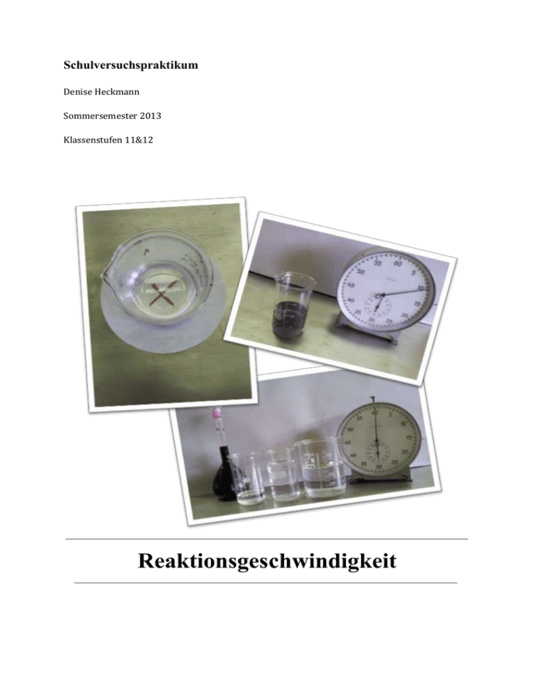 Schulversuchspraktikum Denise Heckmann Sommersemester 2013 Klassenstufen 11&12 Reaktionsgeschwindigkeit Error! Use the Home tab to apply Überschrift 1 to the text that you want to appear here. Error! Use the Home tab to apply Überschrift 1 to the text that you want to appear here. 1 Auf einen Blick: Die hier beschriebenen Versuche dienen zur Untersuchung der Abhängigkeit der Reaktionsgeschwindigkeit von Temperatur, Konzentration und Oberfläche. Der Einfluss von Katalysatoren auf die Reaktionsgeschwindigkeit wird im Protokoll von Dörte Hartje näher beschrieben. Die Schülerversuche bieten sich sehr gut dafür an, dass die SuS den Versuchsaufbau oder wenigstens einen Teil davon selbst entwickeln. Ein solcher Ansatz wird auch von dem hier vorgeschlagenen Arbeitsblatt verfolgt. Da mehrere Messungen durchgeführt werden müssen und diese teilweise einige Minuten brauchen, sollten die hier vorgeschlagenen Versuche alle in Doppelstunden durchgeführt werden. Inhalt 1 Beschreibung des Themas und zugehörige Lernziele ...............................................................................2 2 Relevanz des Themas für die SuS ......................................................................................................................2 3 Lehrerversuche .........................................................................................................................................................3 3.1 V 1 – Ableiten des Zeitgesetzes für die Reduktion von Iodat-Ionen durch Iodid-Ionen (Landolt-Reaktion) .......................................................................................................................................................3 3.2 V 2 – Abhängigkeit der Reaktionsgeschwindigkeit von der Konzentration und der Temperatur bei der Reaktion von Kaliumpermanganat mit Oxalsäure in Lösung ............................8 4 Schülerversuche..................................................................................................................................................... 13 4.1 V 1 – Die Abhängigkeit der Reaktionsgeschwindigkeit von der Temperatur: Die Reaktion von Salzsäure mit Natriumthiosulfat bei verschiedenen Temperaturen ........................ 13 4.2 V 2 - -Die Abhängigkeit der Reaktionsgeschwindigkeit von der Oberfläche: Die Reaktion von Salzsäure mit verschiedenen Magnesiumproben ................................................................................ 15 5 Reflexion des Arbeitsblattes ............................................................................................................................. 20 5.1 Erwartungshorizont (Kerncurriculum).............................................................................................. 20 5.2 Erwartungshorizont ................................................................................................................................... 20 Error! Use the Home tab to apply Überschrift 1 to the text that you want to appear here. Error! Use the Home tab to apply Überschrift 1 to the text that you want to appear here. 2 1 Beschreibung des Themas und zugehörige Lernziele Im Zuge des Basiskonzeptes Kinetik und chemisches Gleichgewicht sollen sich die SuS auch mit der Reaktionsgeschwindigkeit beschäftigen. Im Bereich Fachwissen wird hier explizit genannt, dass die SuS die Reaktionsgeschwindigkeit als Änderung der Konzentration pro Zeiteinheit definieren. Weiterhin soll die Abhängigkeit der Reaktionsgeschwindigkeit von Temperatur, Druck, Konzentration und Katalysatoren erkannt werden. Im Bereich Fachmethoden sollen die SuS zur Überprüfung ihrer Hypothesen Experimente gestalten und durchführen. Außerdem sollen Vergleiche zwischen der Bedeutung des Geschwindigkeitsbegriff im Alltag und dem der Chemie gemacht werden. Lernziele: 1) Die SuS erklären, dass die Reaktionsgeschwindigkeit die Änderung der Konzentration pro Zeiteinheit darstellt. 2) Die SuS beschreiben die Abhängigkeit der Reaktionsgeschwindigkeit von der Temperatur. 3) Die SuS beschreiben die Abhängigkeit der Reaktionsgeschwindigkeit von der Stoffkonzentration. 2 Relevanz des Themas für die SuS Das Thema Reaktionsgeschwindigkeit ist für die SuS relevant, da sie lernen, dass sie auf Reaktionen und die Geschwindigkeit, mit der Produkte entstehen, Einfluss nehmen können. Sie stellt eine Grundvoraussetzung für die Erarbeitung des chemischen Gleichgewichts dar, welches sich einstellt, wenn sich die Reaktionsgeschwindigkeiten der Hin- und Rückreaktion einem konstanten Wert nähern. Zum Verständnis des Reaktionsverlaufes einer Gleichgewichtsreaktion ist es außerdem notwendig zu verstehen, dass sich Reaktionsgeschwindigkeiten ändern können, da sie von der Konzentration der Ausgangsstoffe abhängt. Dementsprechend ermöglicht das Wissen, welches in dieser Einheit erarbeitet wird, Voraussagen über die Veränderung der Reaktionsgeschwindigkeiten zu machen. Des Weiteren kann man in diesem Zusammenhang die RGT-Regel erarbeiten, die in der Biologie der Oberstufe wichtig ist. Der so gegebene Fachübergriff kann den SuS helfen, die Verbindung zwischen der Chemie und der Biologie zu sehen. Außerdem können sie sich die chemischen Sachverhalte so besser mit Alltagsphänomenen erklären, wie zum Beispiel, dass Lebensmittel, die sich im Kühlschrank befinden weniger schnell schlecht werden, als wenn sie ohne Kühlung gelagert werden. Error! Use the Home tab to apply Überschrift 1 to the text that you want to appear here. Error! Use the Home tab to apply Überschrift 1 to the text that you want to appear here. 3 Aus didaktischen Gründen wird an dieser Stelle davon abgesehen, die Reaktionsordnungen und die Molekularität der Reaktionen anzusprechen. Aus diesem Grund werden zur Vereinfachung auch nur unimolekulare Reaktionen betrachtet. Ist dies nicht der Fall und die Reaktion besteht aus mehreren Teilschritten, so wird der geschwindigkeitsbestimmende Schritt als diejenige Reaktion herausgestell