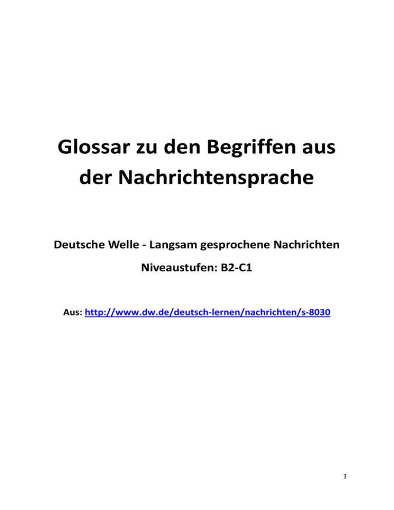 Glossar zu den Begriffen aus der Nachrichtensprache Deutsche Welle - Langsam gesprochene Nachrichten Niveaustufen: B2-C1 Aus: http://www.dw.de/deutsch-lernen/nachrichten/s-8030 1 Inhaltverzeichnis 1. Begriffe aus der Nachrichtensprache - A ....................................................................................... 3 2. Begriffe aus der Nachrichtensprache - B........................................................................................ 5 3. Begriffe aus der Nachrichtensprache - CD ..................................................................................... 8 4. Begriffe aus der Nachrichtensprache - E ........................................................................................ 9 5. Begriffe aus der Nachrichtensprache - F ...................................................................................... 10 6. Begriffe aus der Nachrichtensprache - G ..................................................................................... 12 7. Begriffe aus der Nachrichtensprache - H ..................................................................................... 13 8. Begriffe aus der Nachrichtensprache - IJ ..................................................................................... 14 9. Begriffe aus der Nachrichtensprache - K...................................................................................... 15 10. Begriffe aus der Nachrichtensprache - L .................................................................................. 17 11. Begriffe aus der Nachrichtensprache - M ................................................................................ 18 12. Begriffe aus der Nachrichtensprache - N ................................................................................. 20 13. Begriffe aus der Nachrichtensprache - O ................................................................................. 21 14. Begriffe aus der Nachrichtensprache - PQ ............................................................................... 21 15. Begriffe aus der Nachrichtensprache - R.................................................................................. 22 16. Begriffe aus der Nachrichtensprache - S .................................................................................. 24 17. Begriffe aus der Nachrichtensprache - T .................................................................................. 26 18. Begriffe aus der Nachrichtensprache - U ................................................................................. 27 19. Begriffe aus der Nachrichtensprache - V ................................................................................. 28 20. Begriffe aus der Nachrichtensprache - W ................................................................................ 30 21. Begriffe aus der Nachrichtensprache - XYZ.............................................................................. 31 22. Erklärung ................................................................................................................................... 32 2 1. Begriffe aus der Nachrichtensprache - A abbauen* – verringern (In der Finanzkrise müssen viele Unternehmen zahlreiche Arbeitsplätze abbauen.) Abgeordnete, der/die – ein gewähltes Mitglied in einem Parlament (120 Abgeordnete stimmten mit Nein.) Abkommen, das – ein Vertrag (meist) zwischen Staaten (Das Schengener Abkommen wurde 1985 von Deutschland unterzeichnet.) Abrüstung, die – die Reduzierung der Waffen in einem Staat (Europäische Länder wollen die internationale Abrüstung verstärken.) Absatz, der* – die Menge der Waren, die eine Firma verkauft (2008 hatten viele Firmen einen höheren Absatz als 2009.), 150.000 Menschen aus Deutschland in ihre Heimatländer abgeschoben.) etwas absetzen – etwas verkaufen (Viele Firmen haben Probleme, alle ihre Waren abzusetzen.) Abstimmung, die – hier: die Wahl (Die Abstimmung der Abgeordneten sorgte für viele Diskussionen.) sich abzeichnen, etwas zeichnet sich ab – etwas wird allmählich deutlich, erkennbar (Nach dem Gespräch zeichneten sich erste Fortschritte ab.) jemanden/ etwas abziehen* – jemanden/etwas entfernen (In den nächsten Jahren möchte die USA ihre Truppen aus dem Irak abziehen.) Agrarstaat, der – ein Staat, dessen Wirtschaft vor allem von der Landwirtschaft abhängt; ↔ Industriestaat (Die meisten Staaten Afrikas sind Agrarstaaten) Akte, die – eine Sammlung von Dokumenten zu einem Thema oder Ereignis (Ein Blick in die Akten der Firma zeigte, wieviel Gewinn sie im letzten Jahr erzielte.) Aktie, die – ein Wertpapier, das man kaufen kann, um einen Anteil an einer Gesellschaft zu bekommen (Durch die Finanzkrise ist der Wert vieler Aktien stark gefallen.) Aktiengesellschaft, die – eine bestimmte Form eines Unternehmens; wenn viele verschiedene Personen kleine Teile einer Firma besitzen (Die Aktiengesellschaft berät sich über die Zukunft der Firma.) Aktivist/in, der/die – eine Person, die viel dafür tut, ein bestimmtes (politisches) Ziel zu erreichen (Letzte Woche demonstrierten viele Aktivisten gegen das neue Gesetz.) Amoklauf, der – das Herumlaufen und Schießen mit einer Waffe, um möglichst viele Menschen zu töten (Bei dem Amoklauf in Süddeutschland gab es zwölf Opfer.) Amt, das* – eine offizielle Aufgabe, die jemand in einer Partei oder einer Institution hat (Die nächsten Wahlen entscheiden darüber, wer das Amt des Wirtschaftsministers übernehmen wird.) amtierend – jetzt im Amt, zurzeit im Amt (Der amtierende Bundespräsident Wulff ist der zehnte Bundespräsident in der Geschichte der BRD.) Amtsrichter, der – jemand, der im Gericht die Entscheidungen trifft (Der Amtsrichter befand den Angeklagten für schuldig.) 3 nach Angaben von/(Gen.)* – wie berichtet wird; den Informationen zufolge (Nach Angaben der Bundesregierung besteht keine Gefahr.) angeschlagen* – in keinem guten Zustand (Das Unternehmen ist angeschlagen.) anhalten, etwas hält an* – et